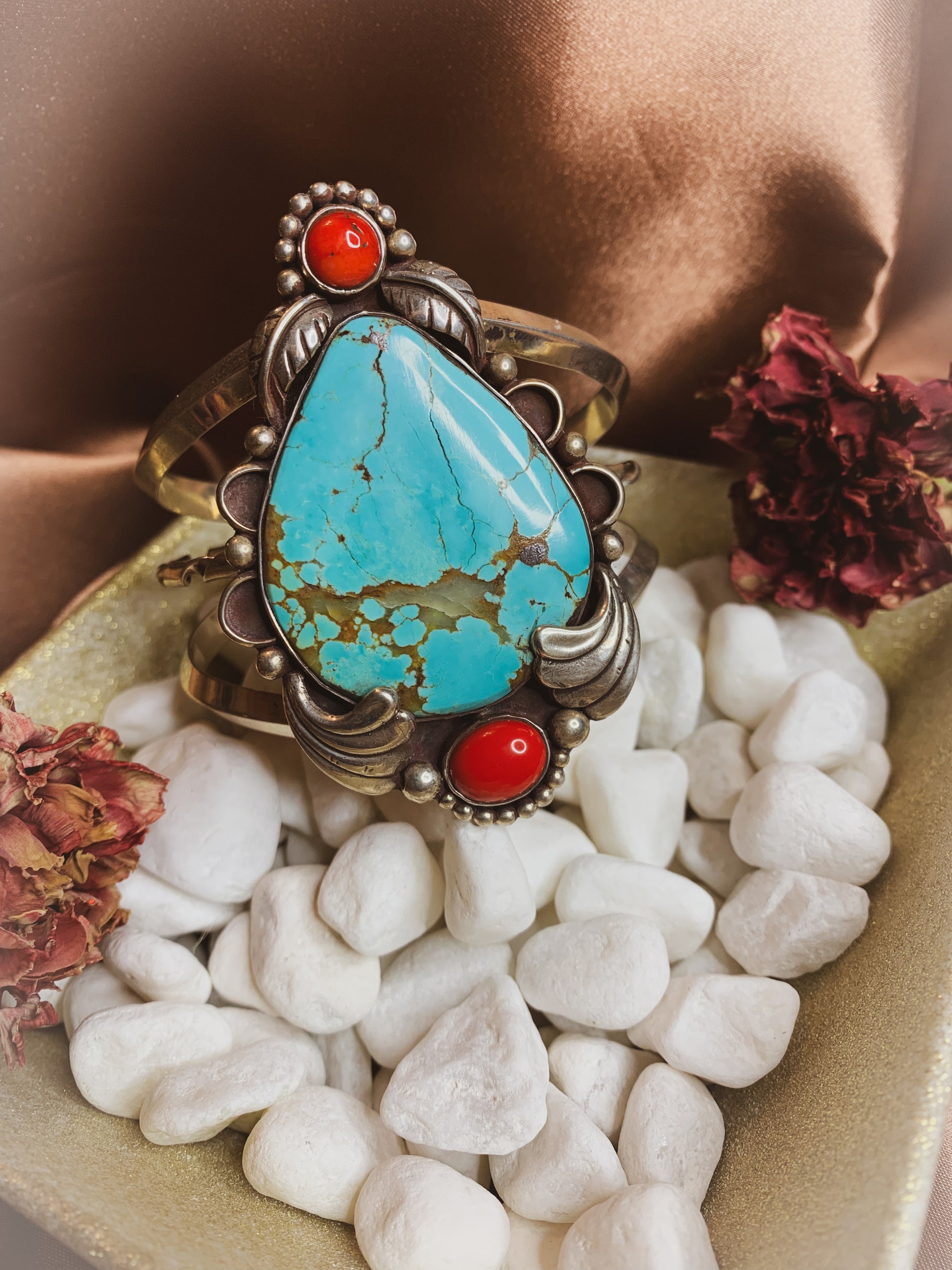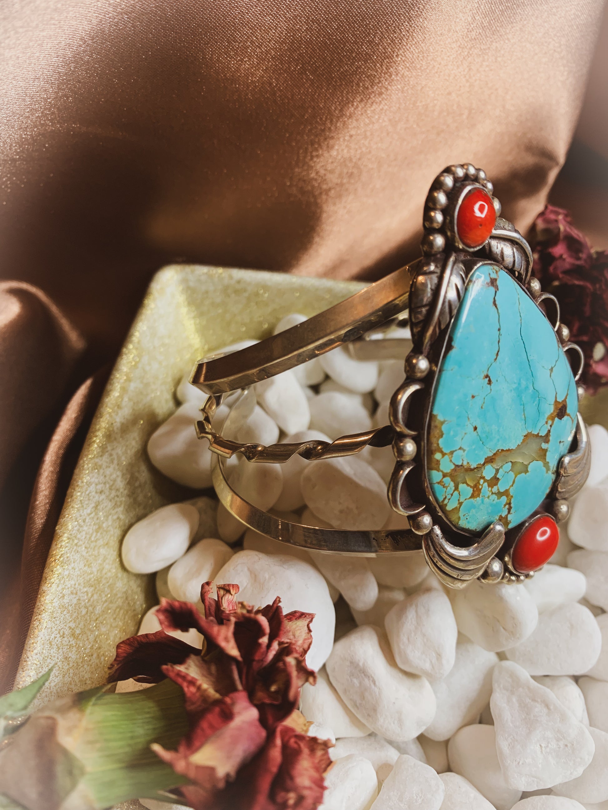 Gorgeous #8 mine Turquoise and Mediterranean Coral cuff. 7” Sterling cuff. Slightly adjustable. Heavy 59.2g.