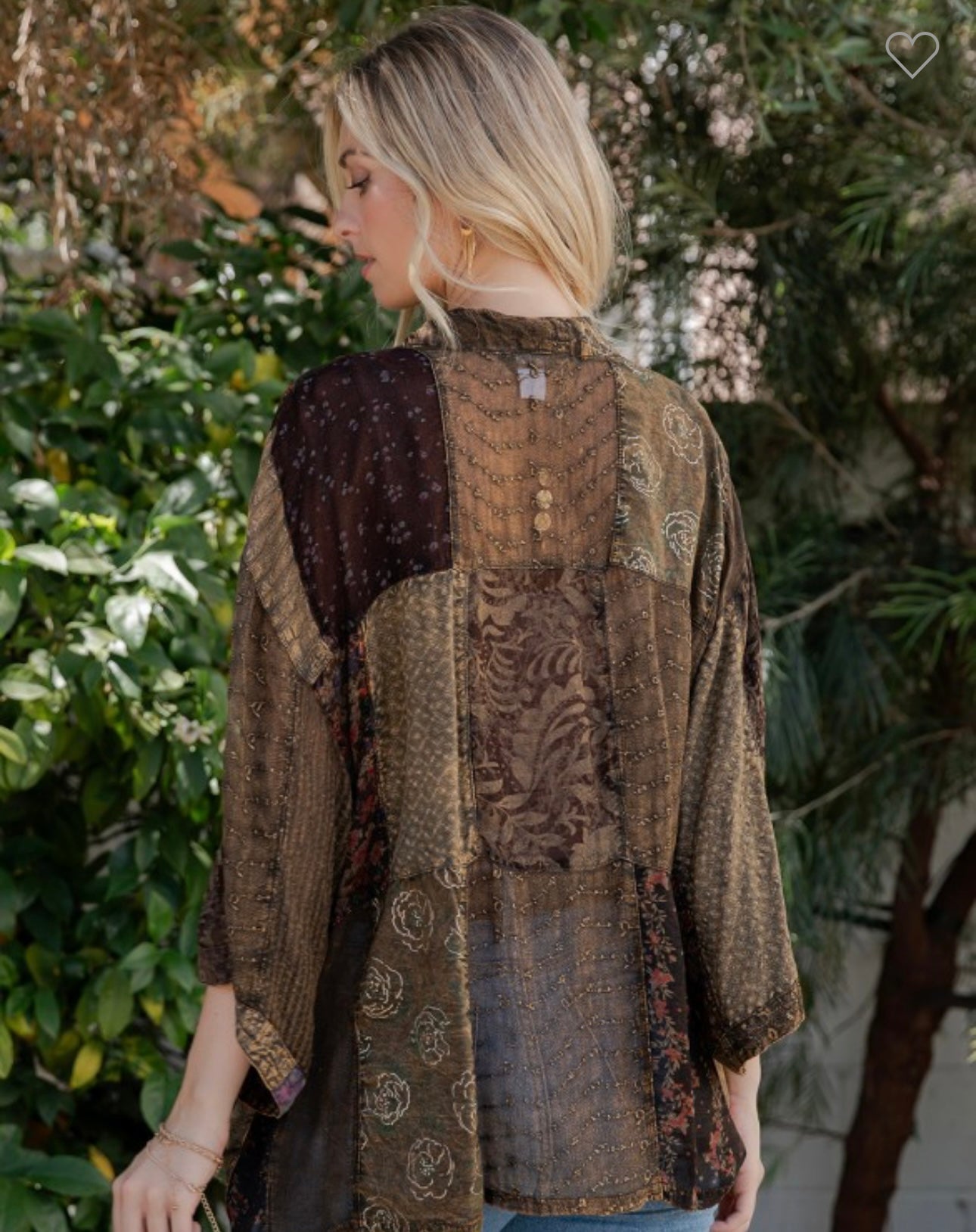 This captivating top combines the relaxed silhouette of a kimono with the vibrant allure of overdyed mix-match patches in georgette prints, creating a unique and eye-catching piece.