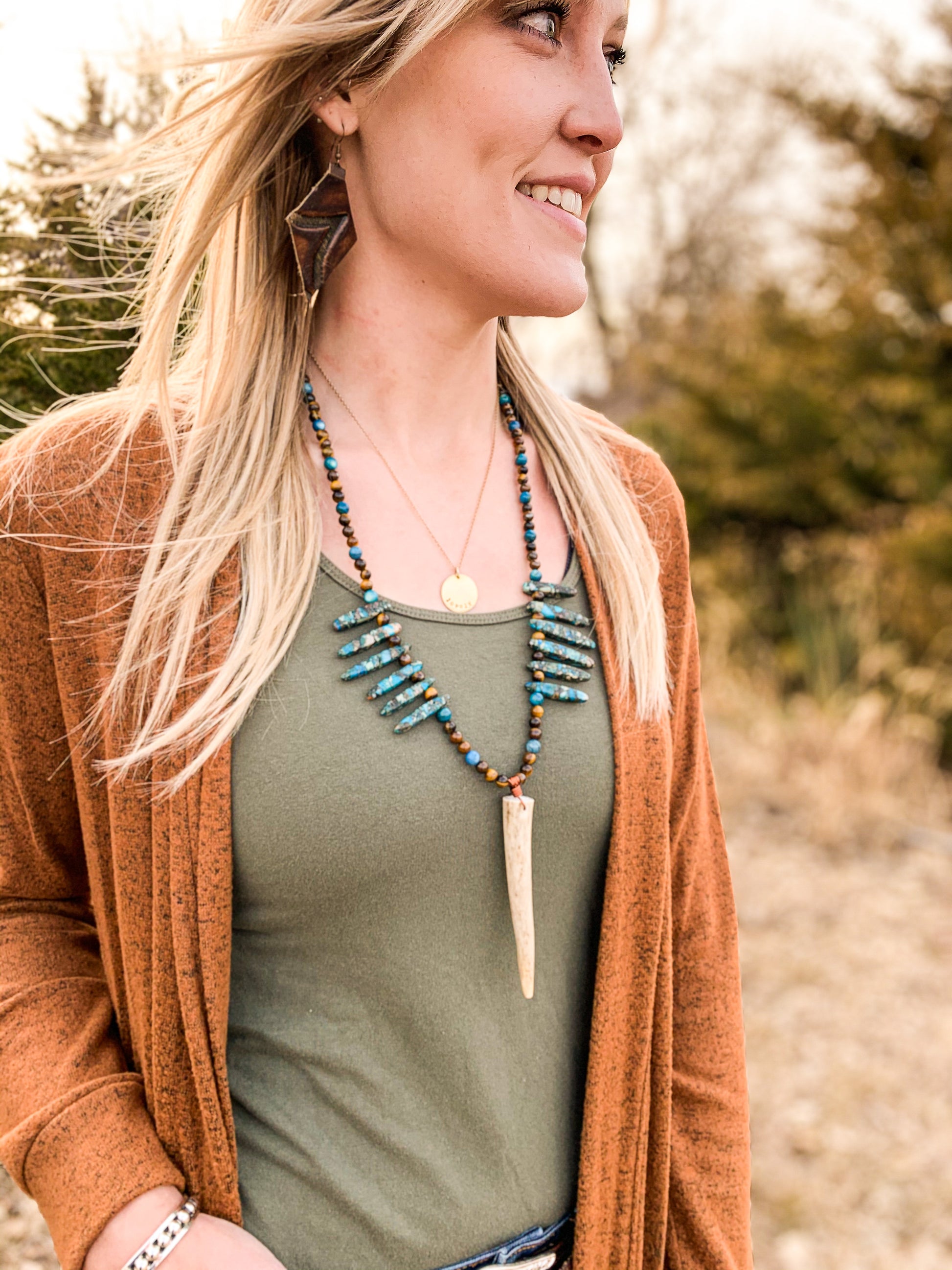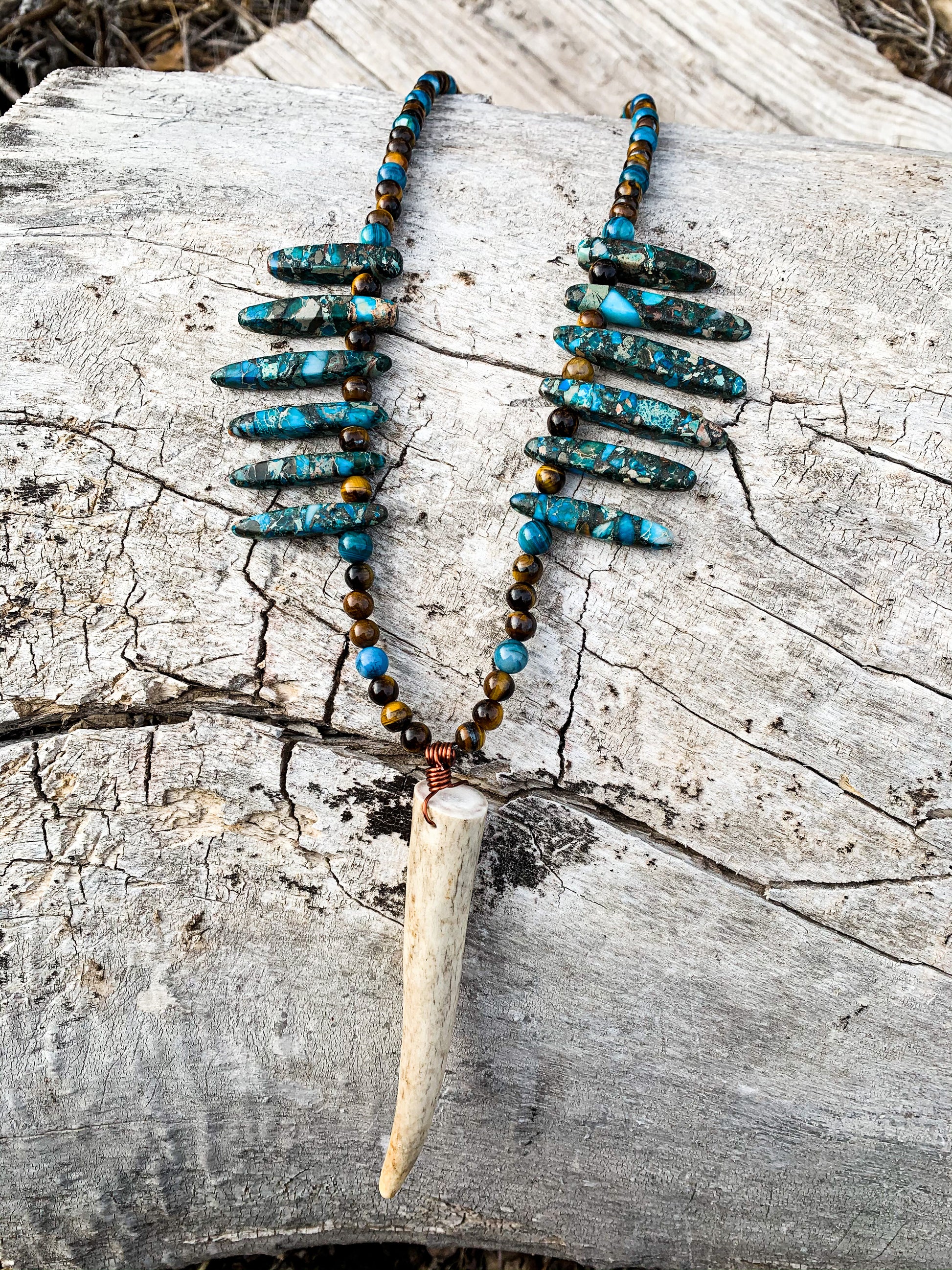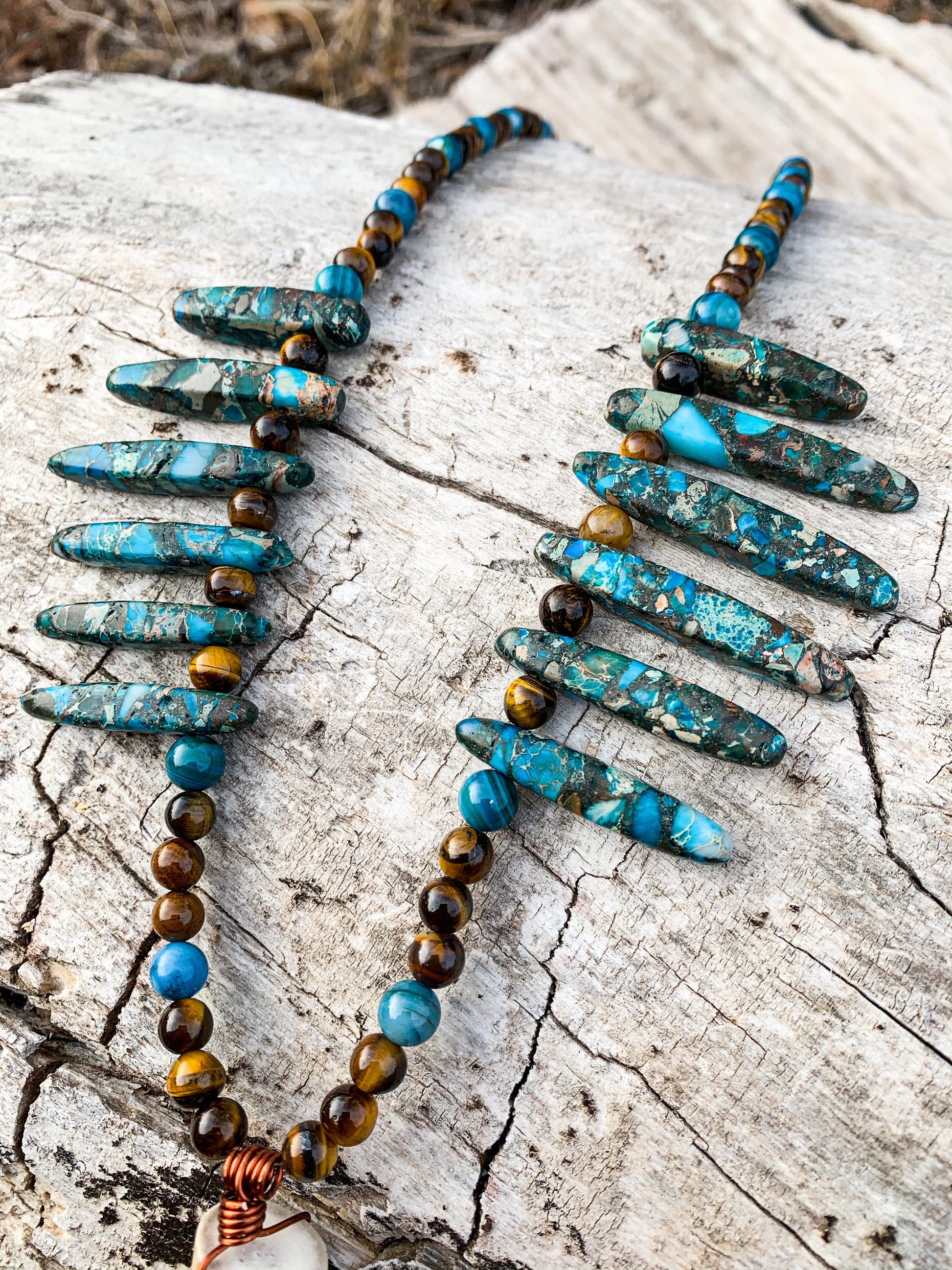 Amber colored beads, with turquoise and royal blue spiked stones. Not authentic turquoise. Handmade. One of a kind.