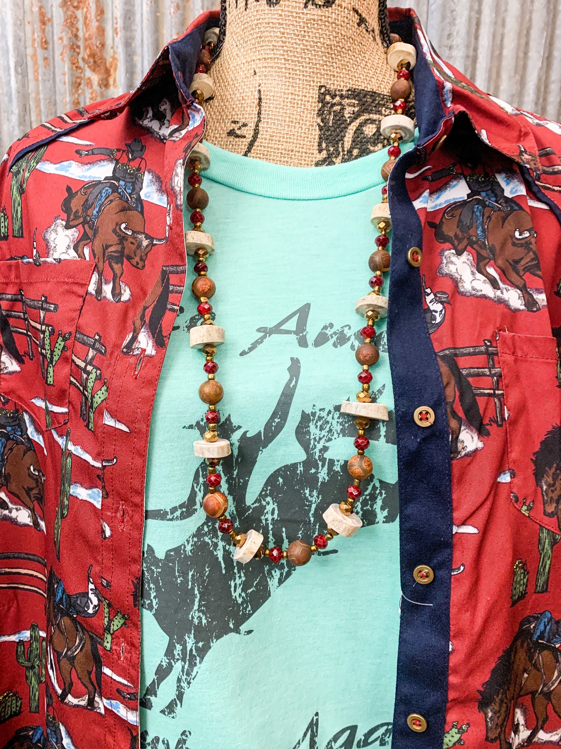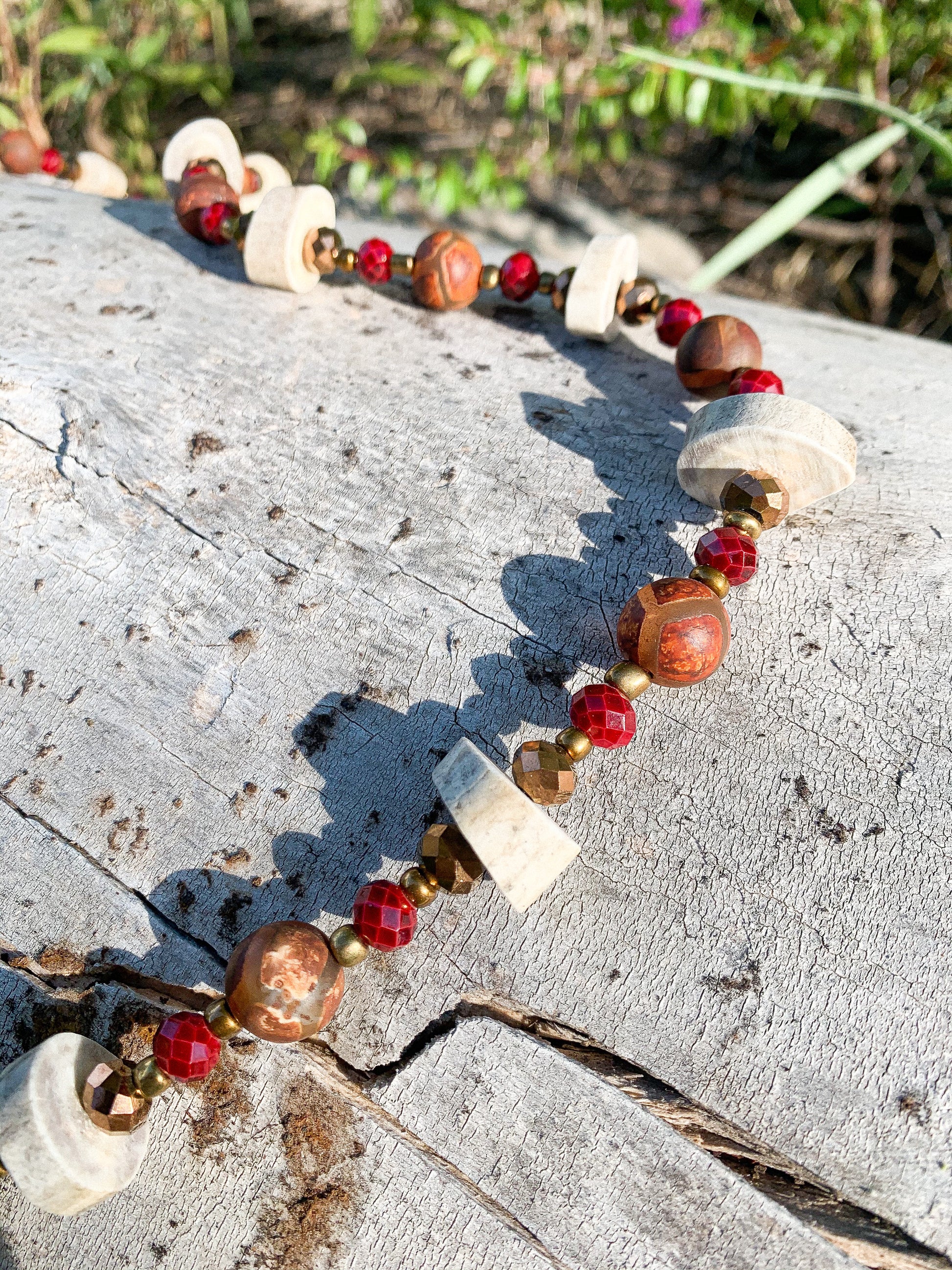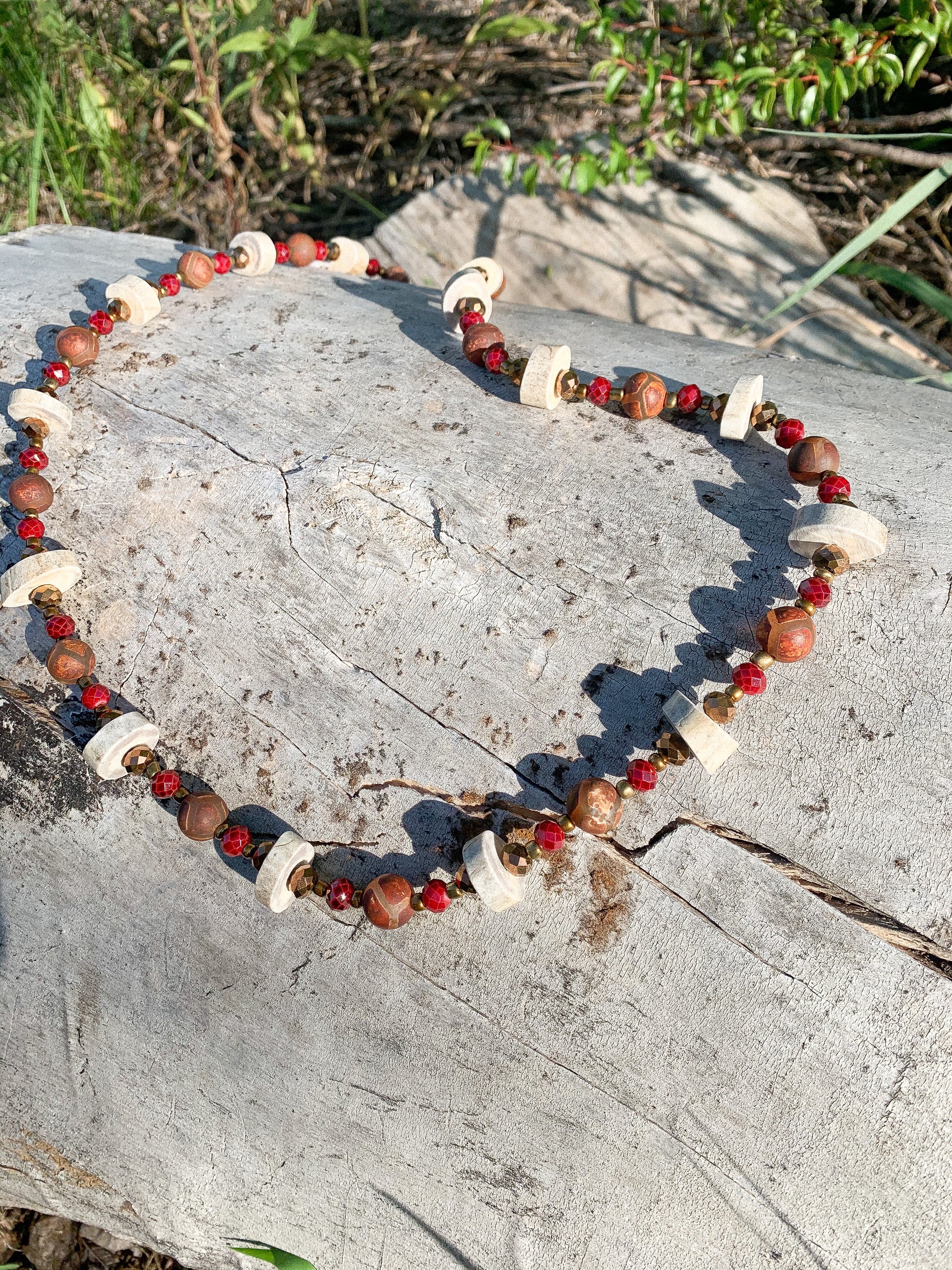 Red, gold, and brown beads sit between each disc antler piece. Handmade. One of a kind.