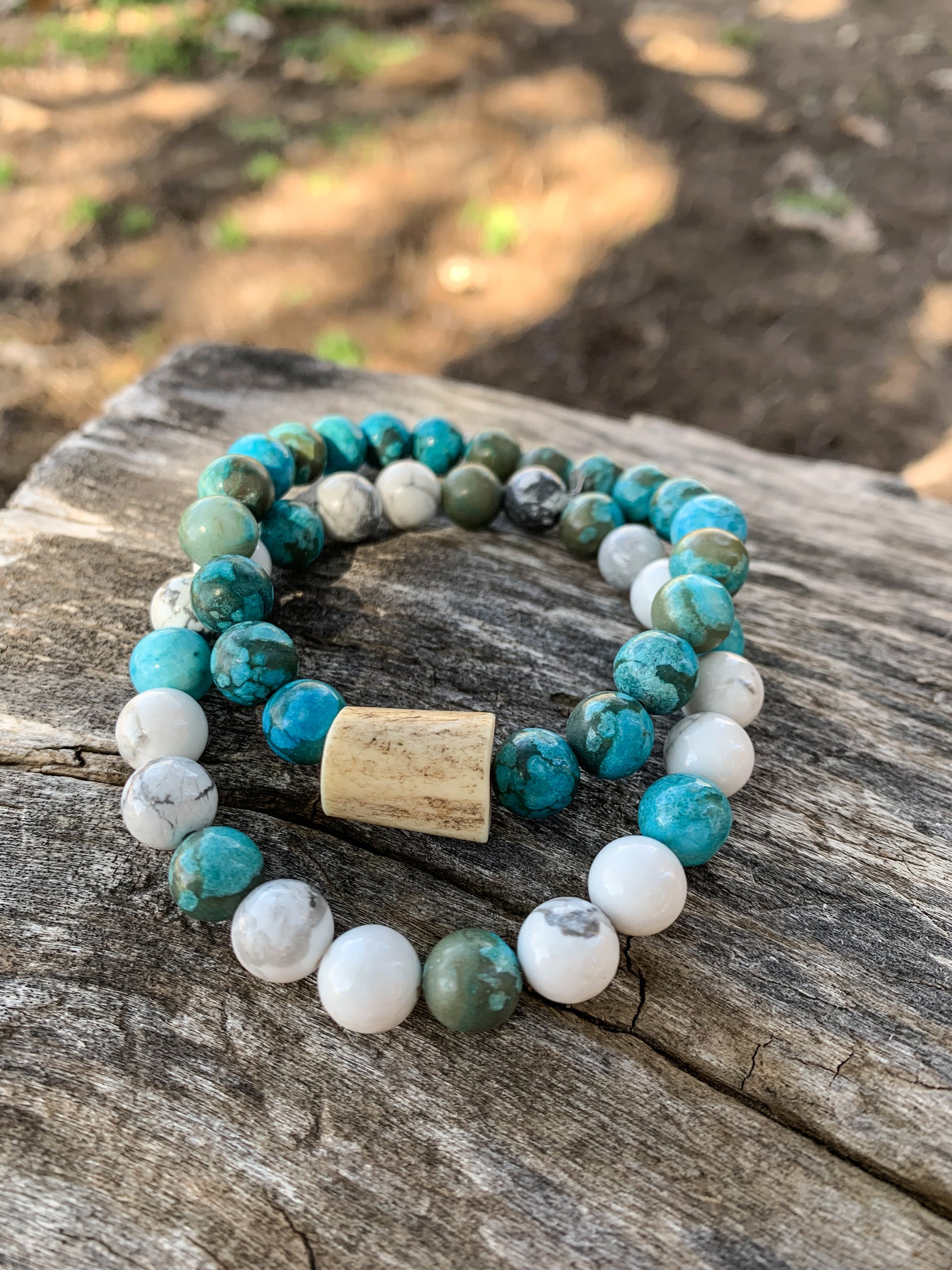 Faux turquoise and white beads with a small antler piece in the center. Handmade.