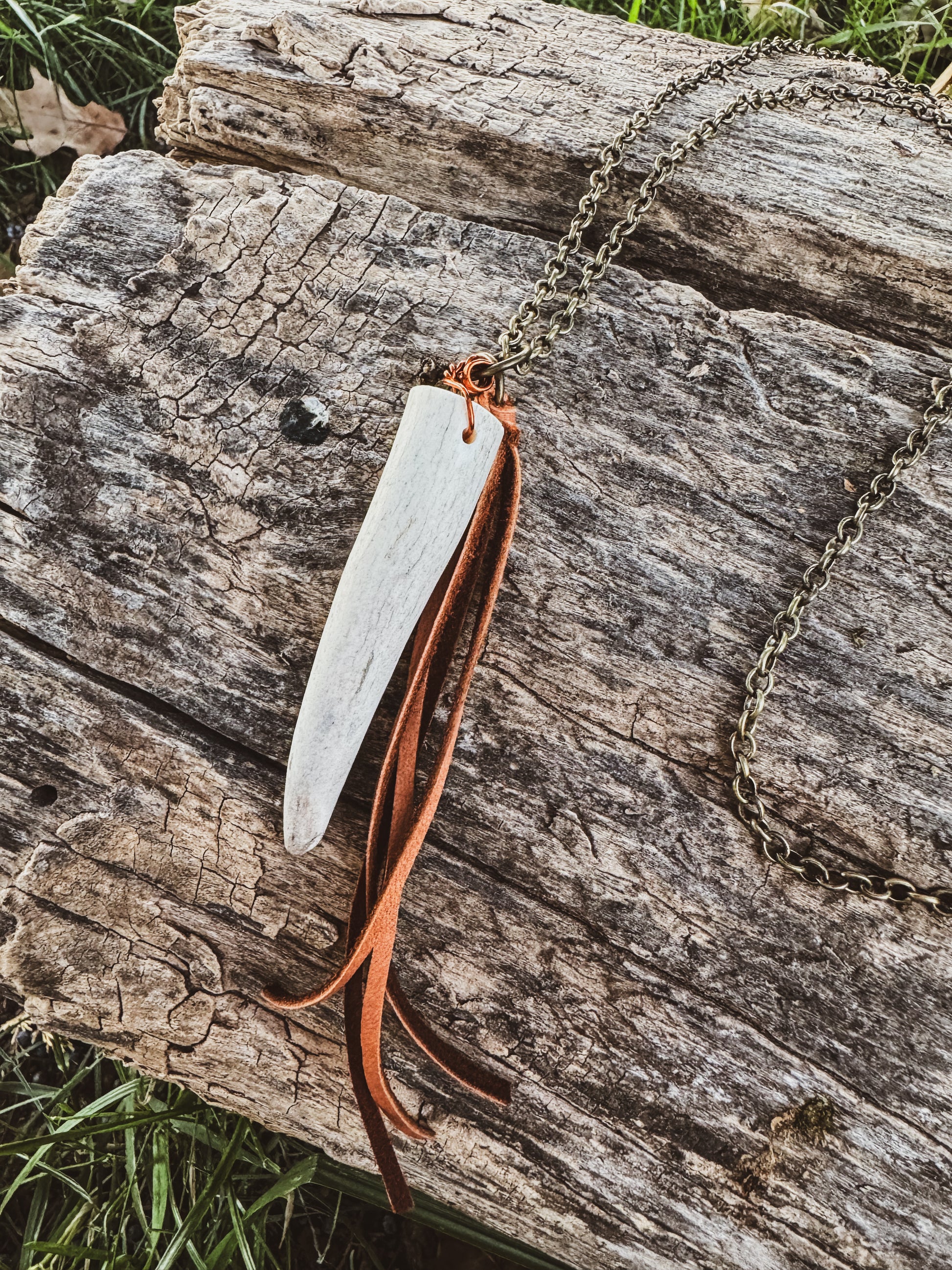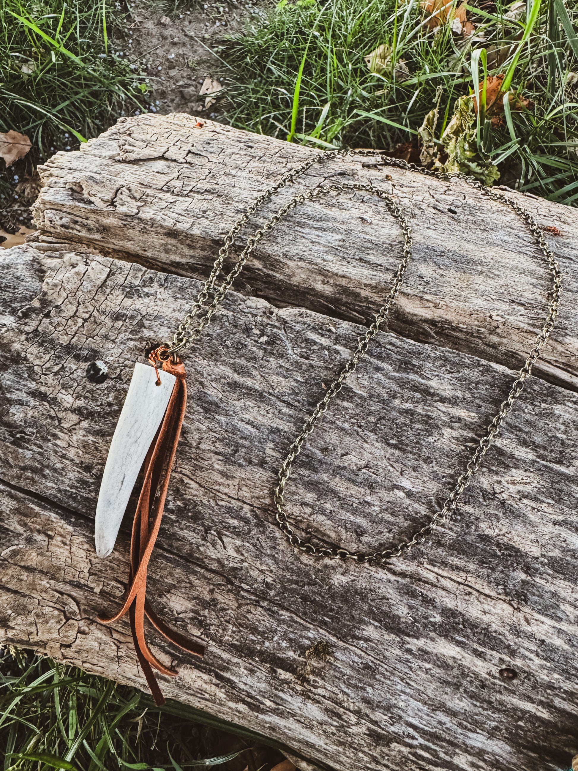 A 16.5” long chain with a simple authentic antler tip and leather fringe. The perfect amount of simple and unique to add a fun touch to any outfit! Handmade.
