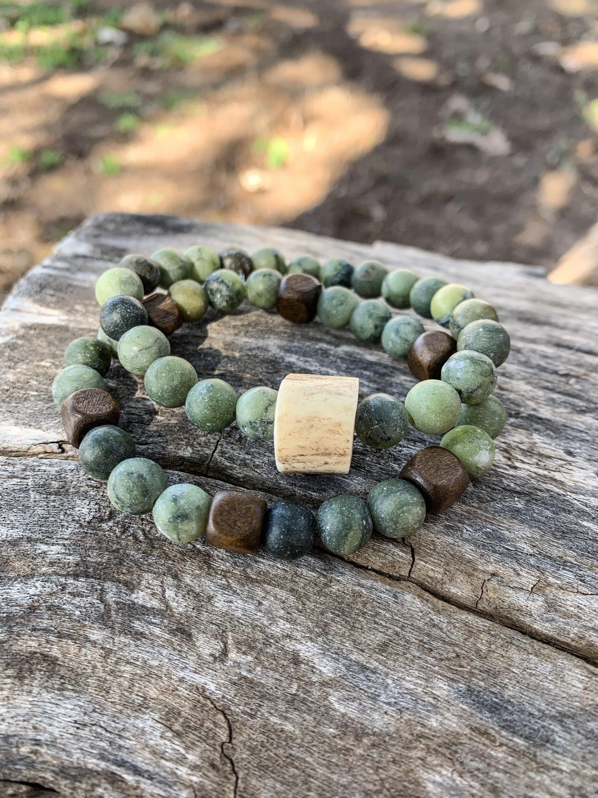Beautiful forest green and wooden beads with a small whitetail antler piece in the center. Handmade.