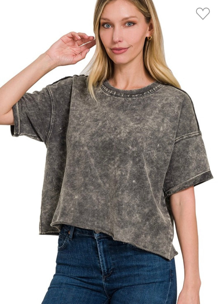 Cute tee with an acid wash design and raw hem. True to size.
