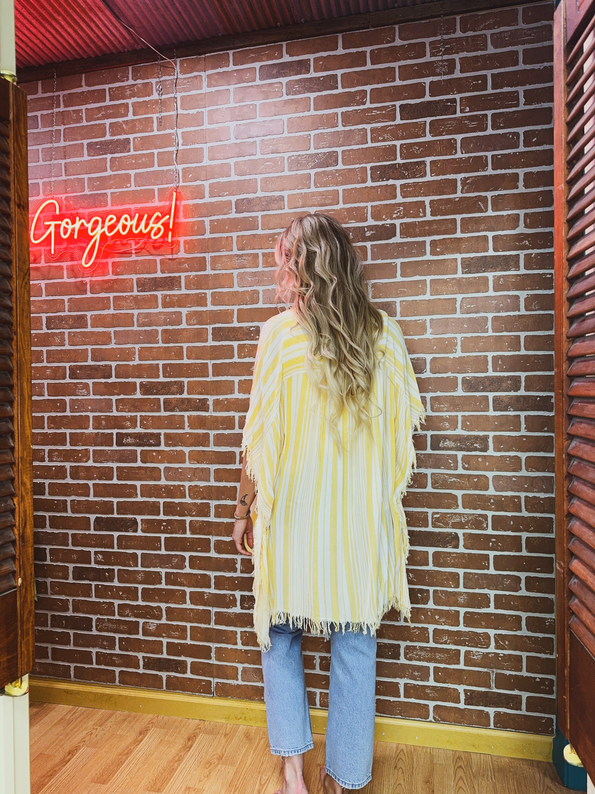 This Beach Kimono features a flowy fringe hem and chic striped pattern. Perfect for a day at the beach or a stylish cover-up, the lightweight fabric ensures all-day comfort while the design adds a touch of elegance to any outfit. Enhance your boho look with this must-have piece.