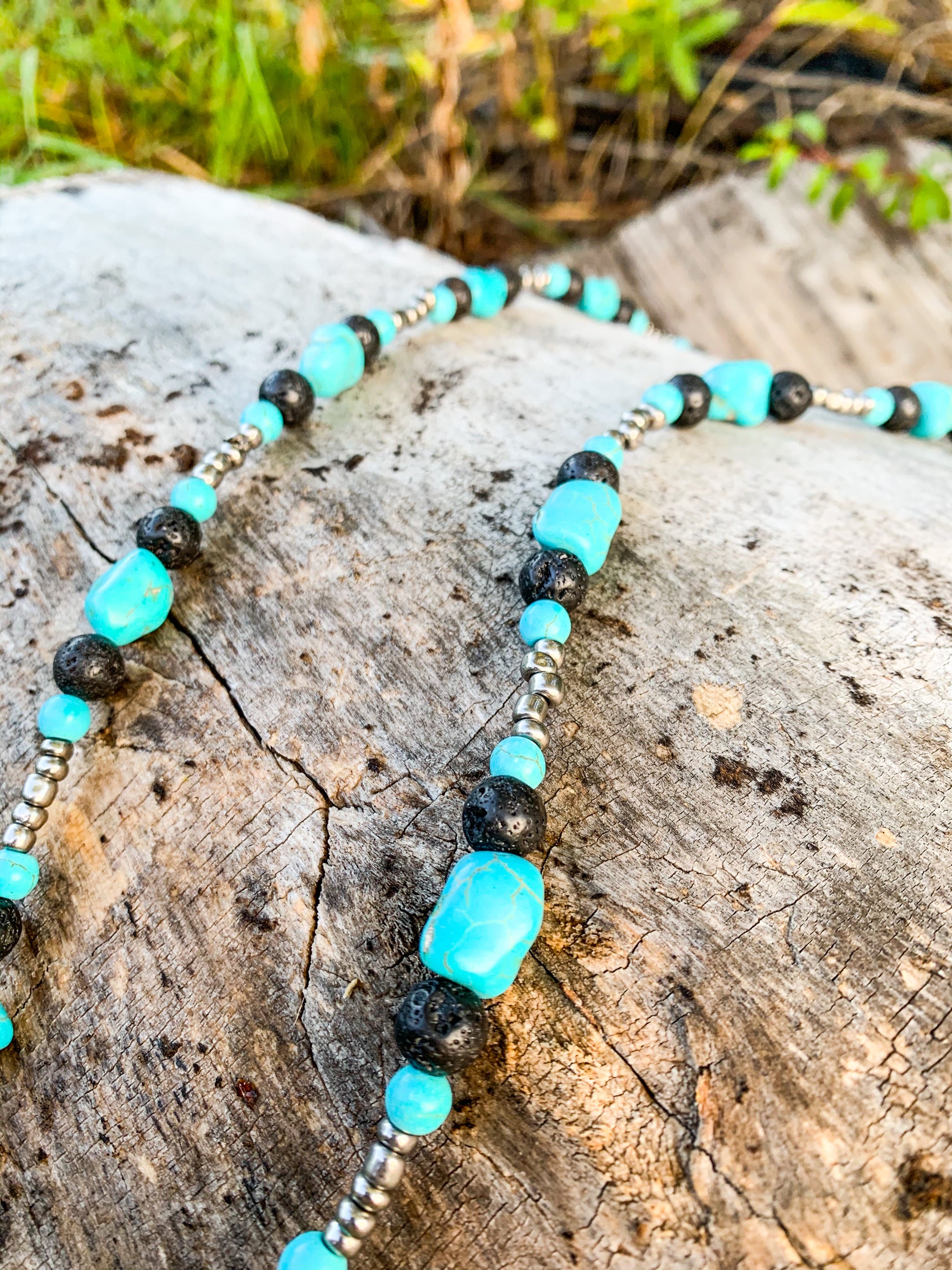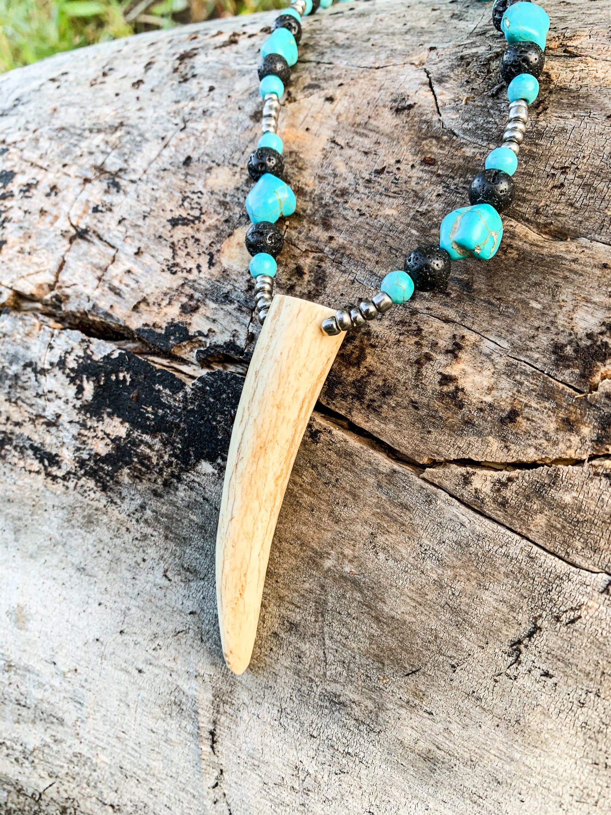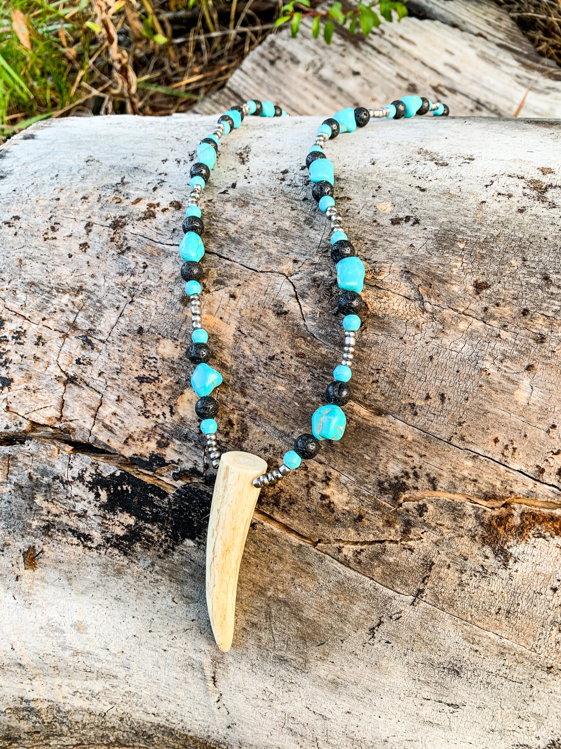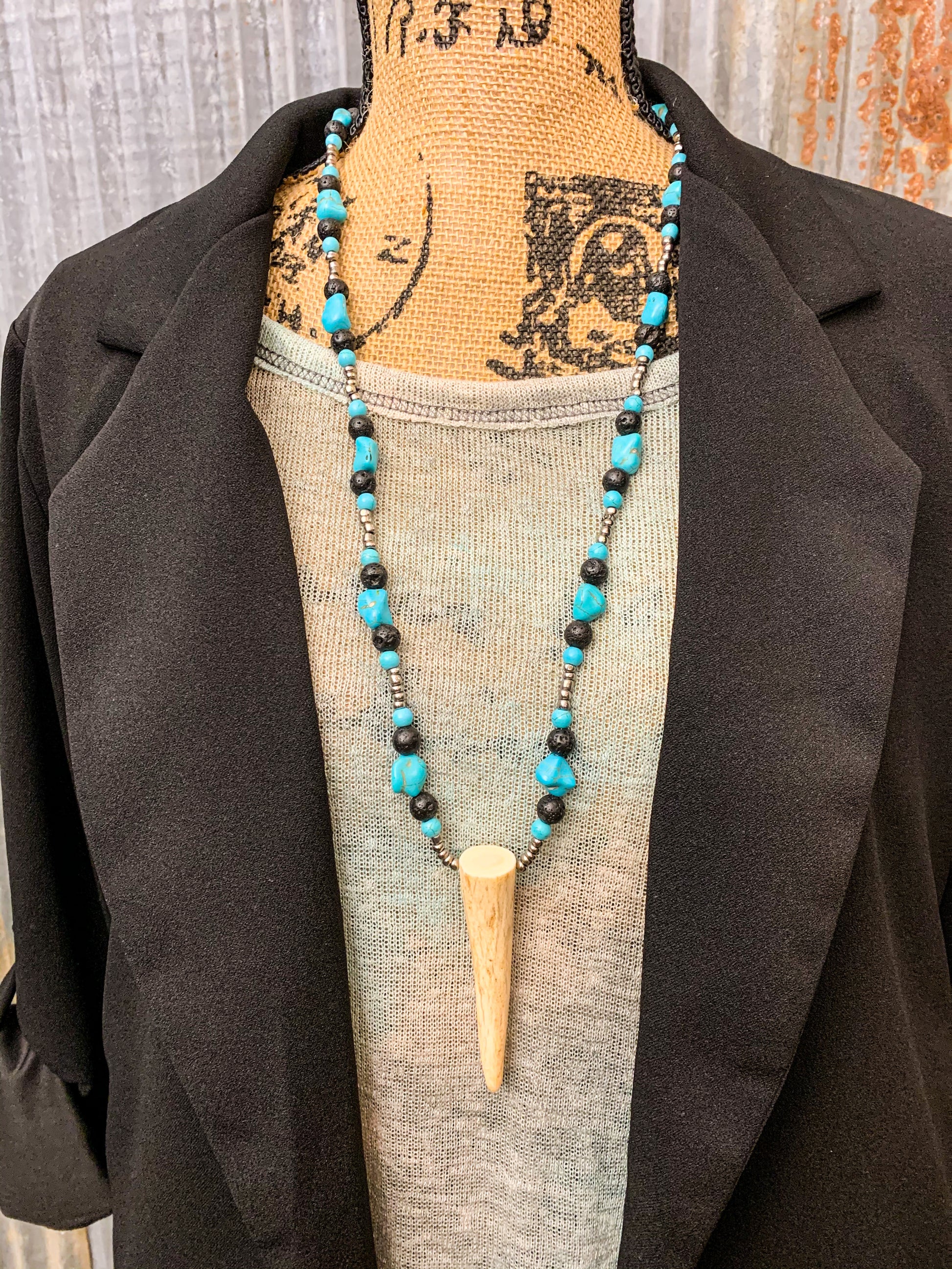 Black lava beads surrounded by turquoise and silver, with a light antler piece. Handmade, one of a kind. Not authentic turquoise.