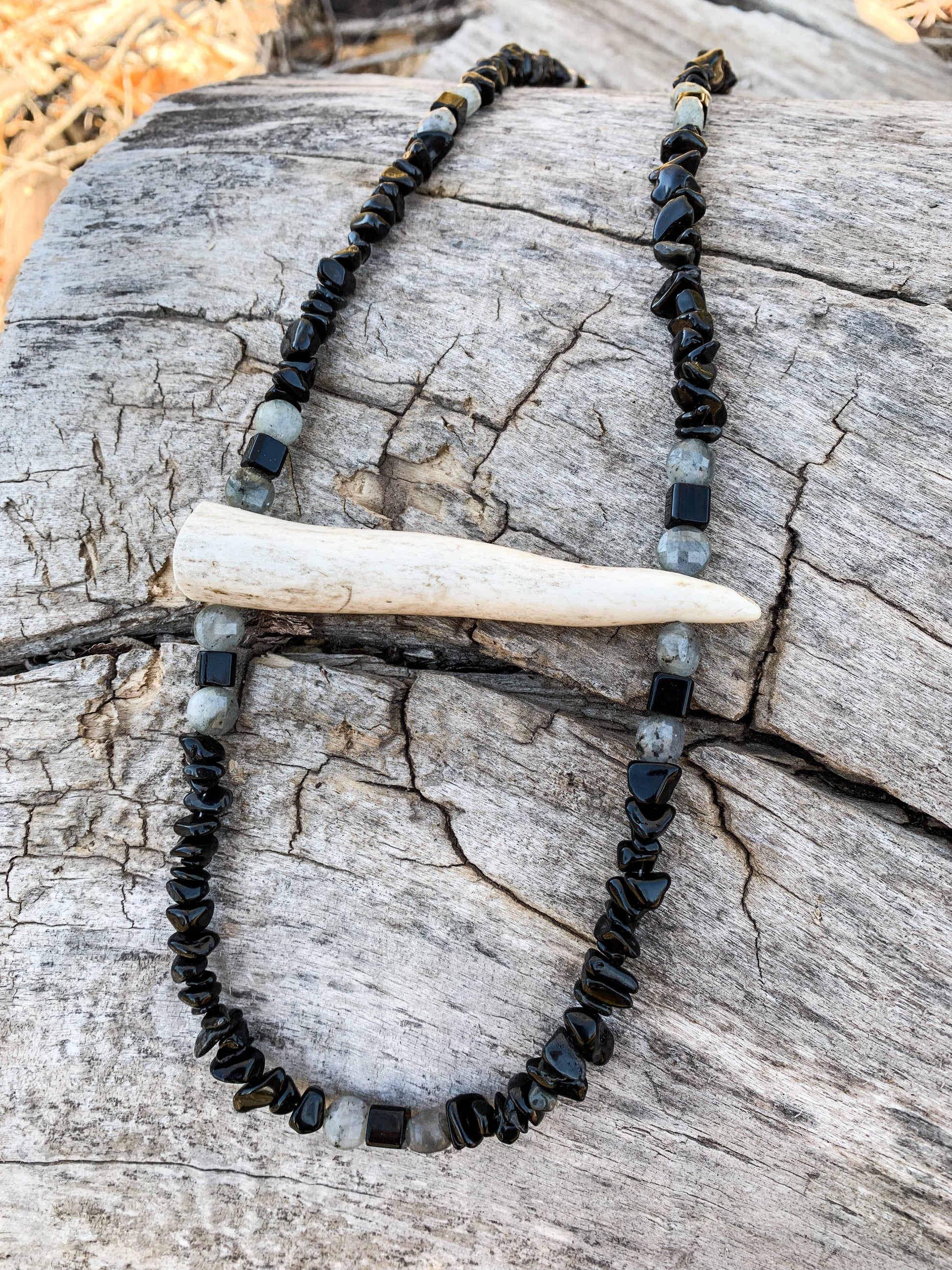 Black rock beads with gray pixel beads and an authentic horizontal antler piece. Handmade.