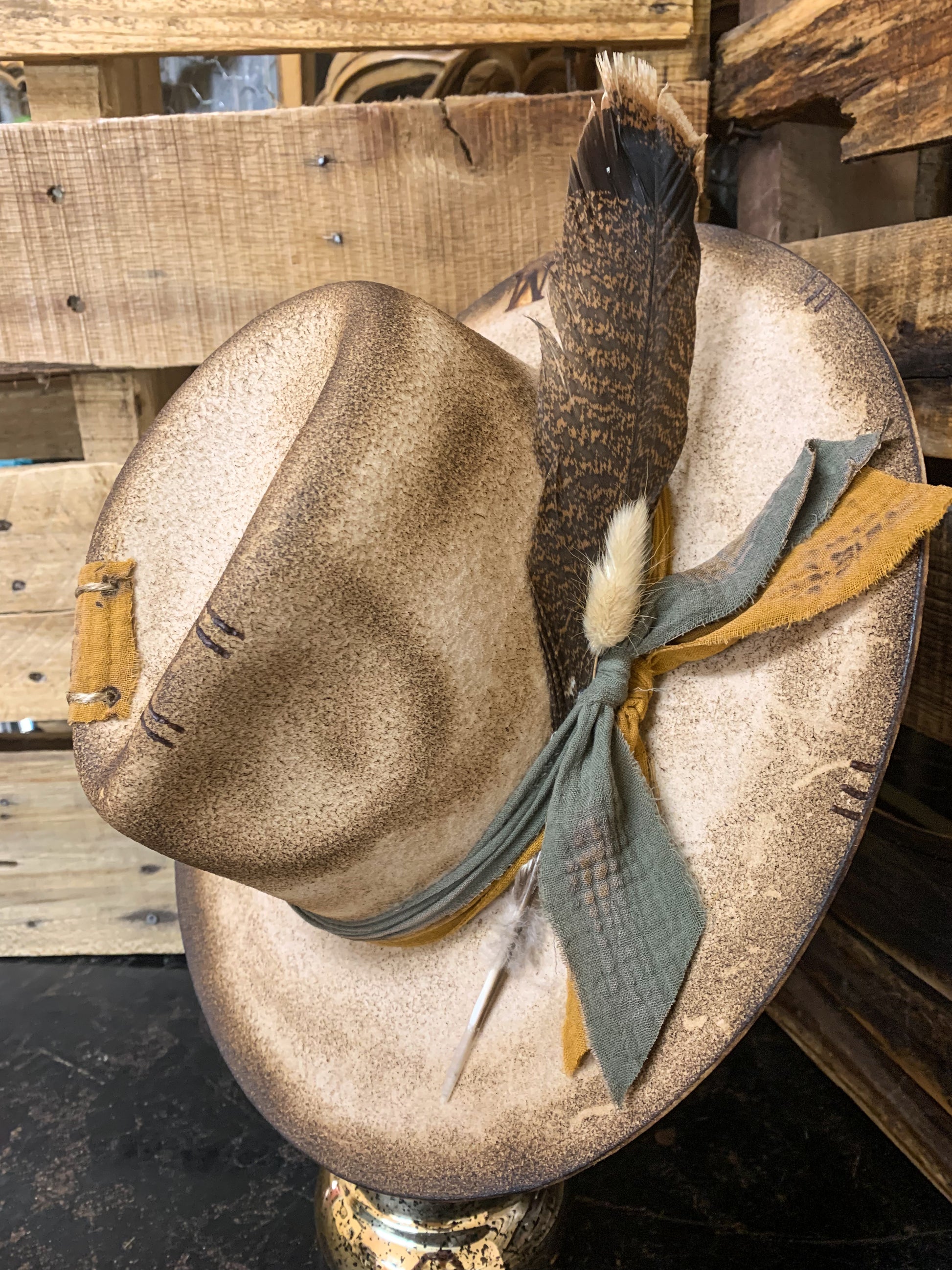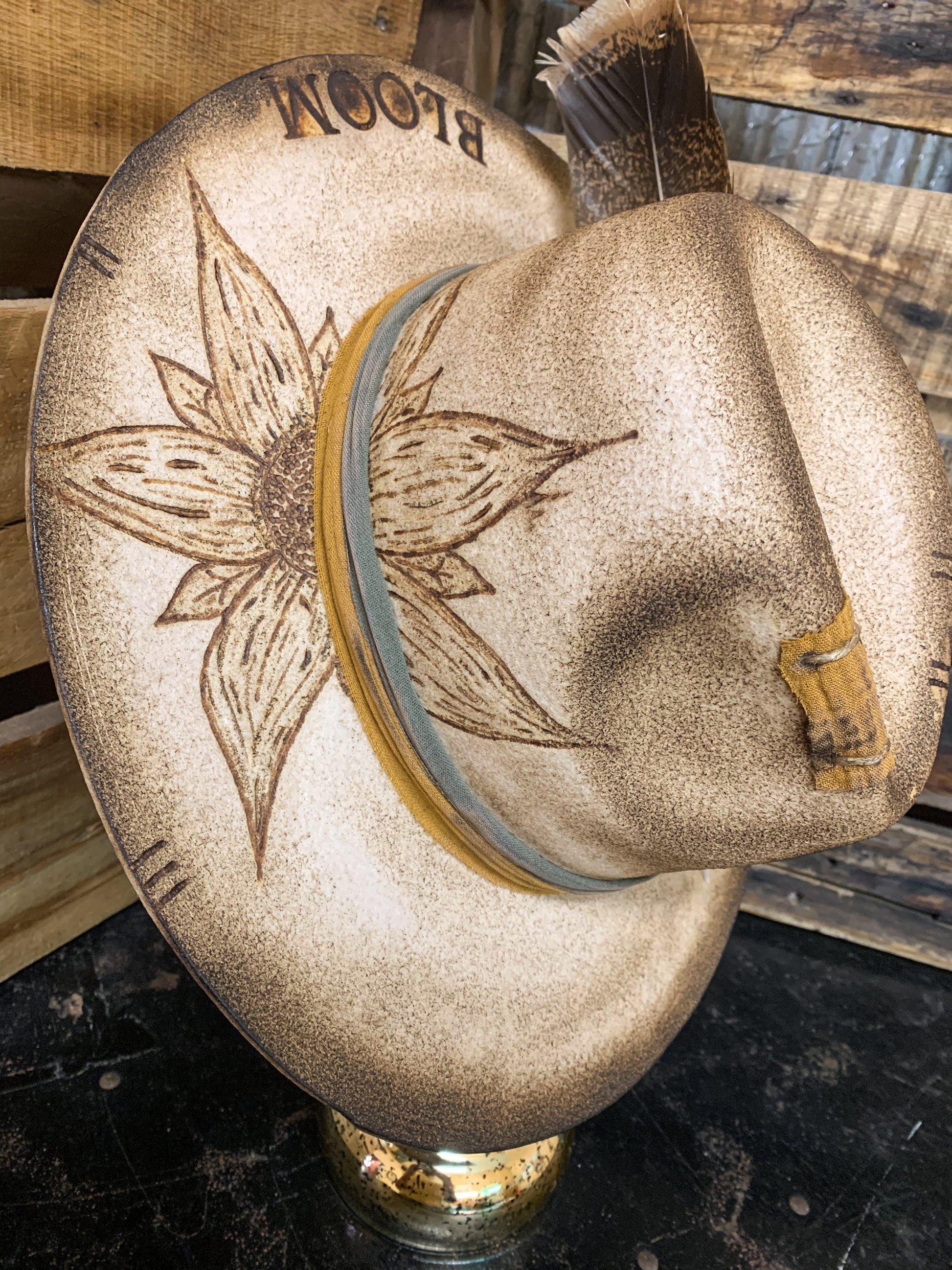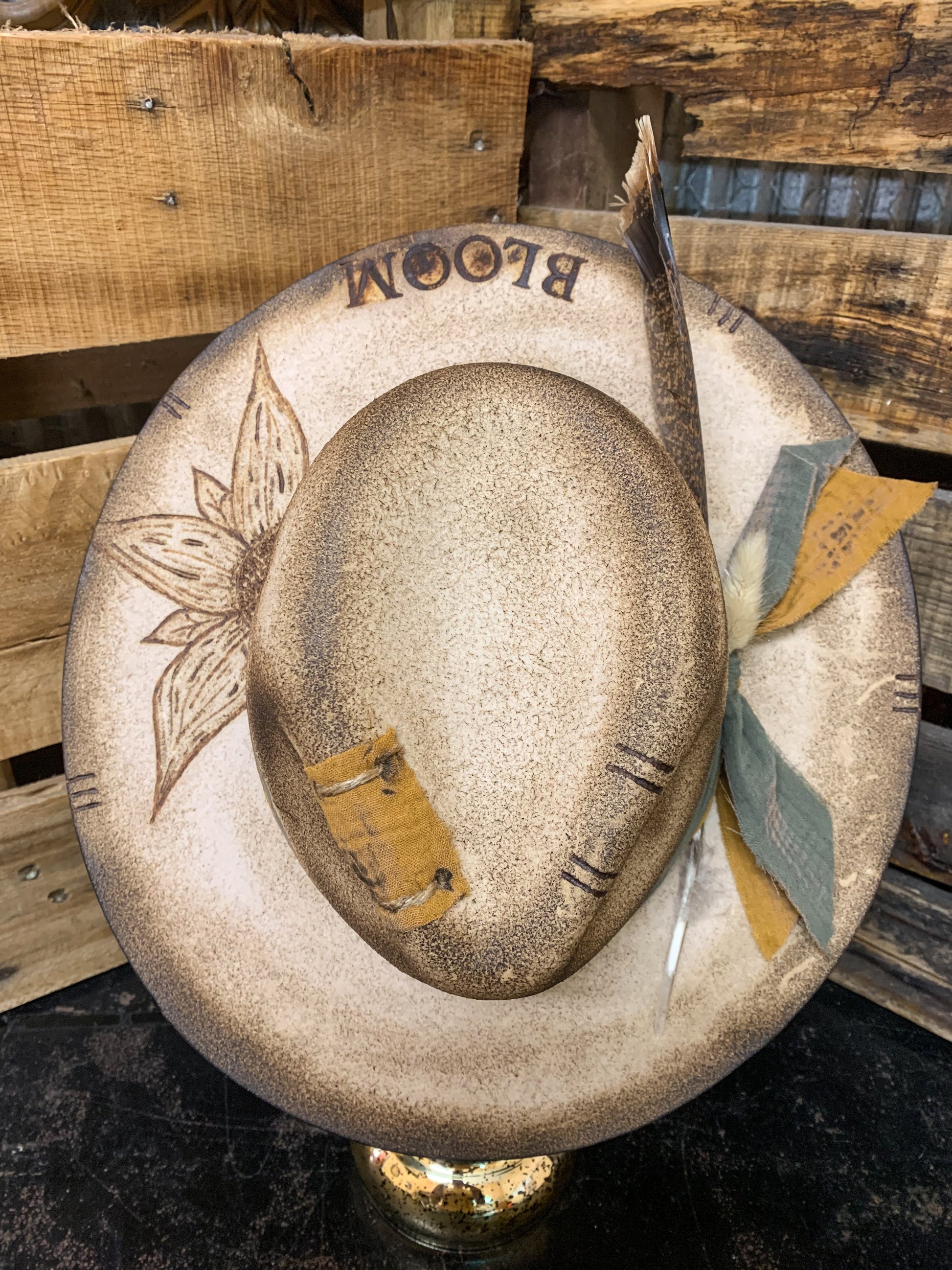 Beautiful classic 100% wool hat with sunflower and “BLOOM” burned into the brim. Fabric wrapped around and tied on the side, and large turkey feather. Satin lining. 11cm crown height, 8cm brim length, 58/59cm inner lining circumference with adjustable drawstring for sizing.