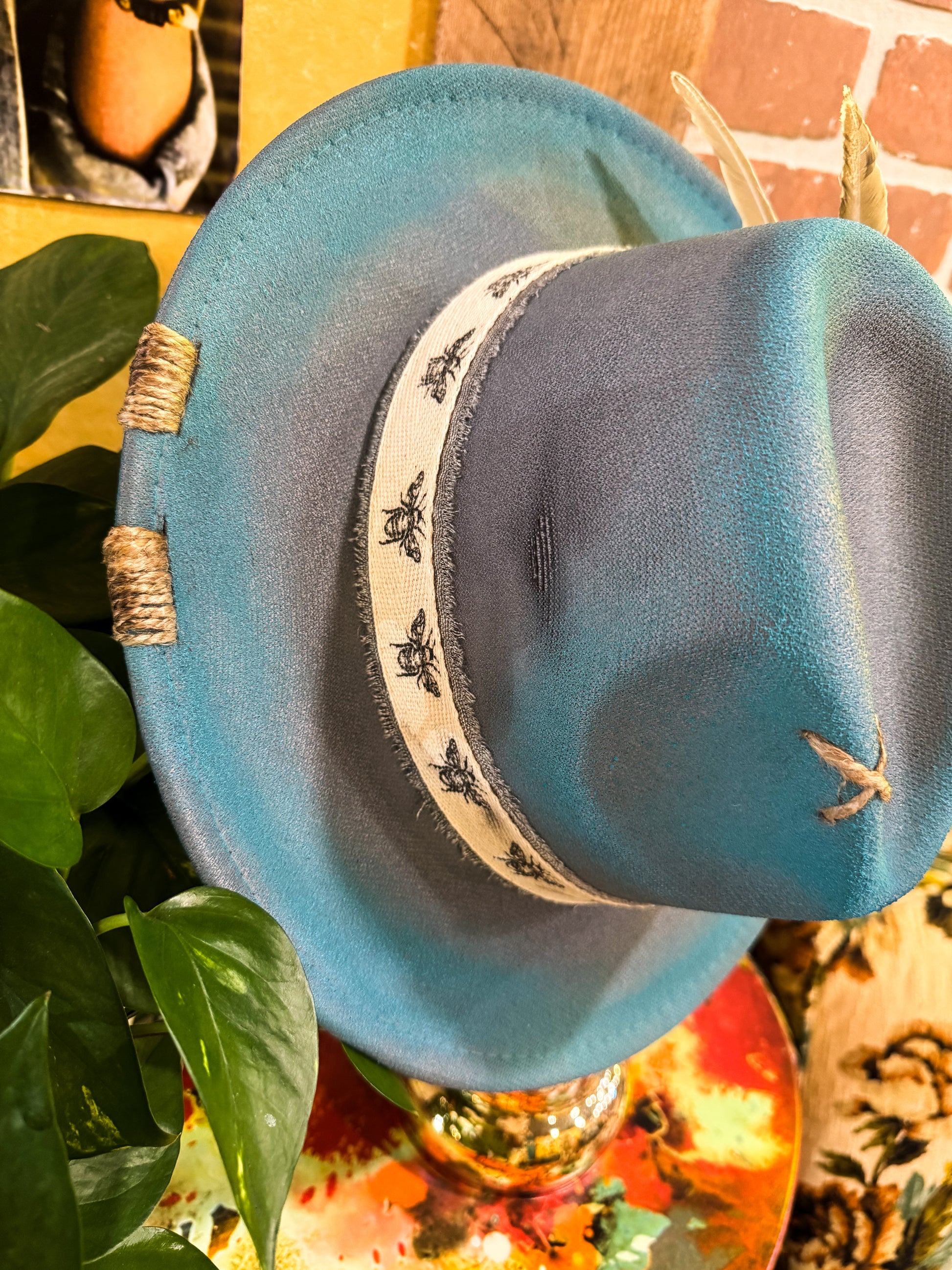 Gray faux felt short brim hat painted turquoise, with gray and bumble bee fabric wrapped around and tied on the side with two feathers. Twine wrapped brim. Adjustable drawstrings inside to tighten if needed. 4.75” height. 2.75” brim. 22” circumference. 65% cotton, 35% polyester.