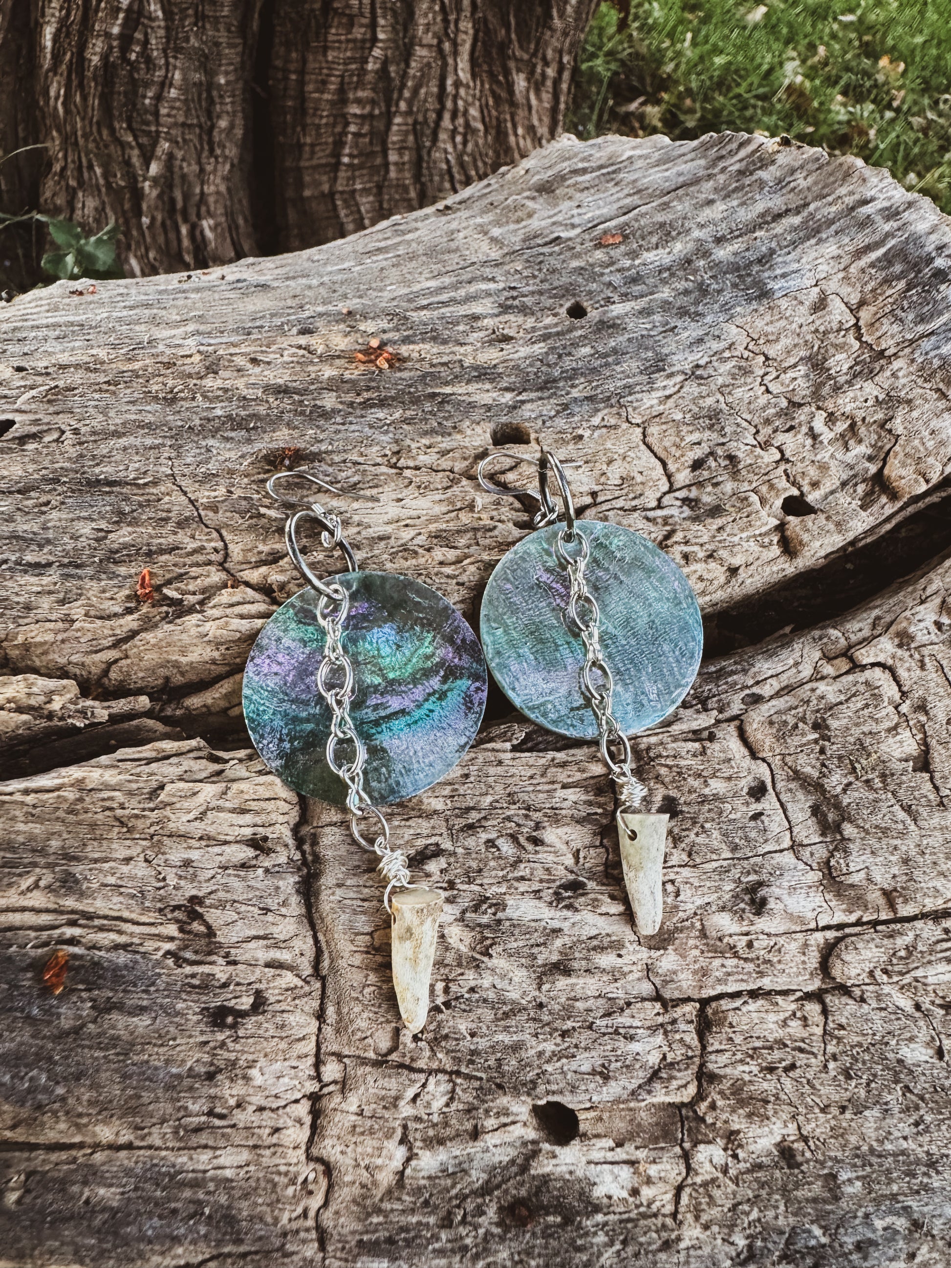 Blue colored shell circles and dainty authentic antler tips hanging from a silver chain. Handmade. One of a kind.