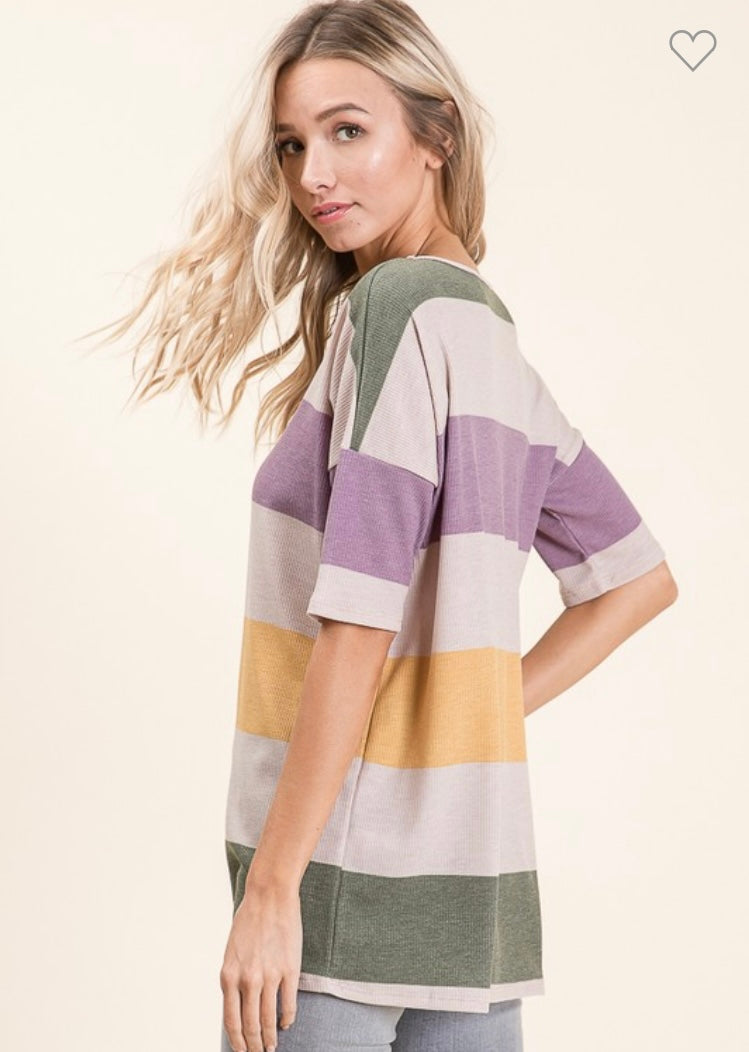 Loose fit top with a wide stripe design and waffle knit fabric. True to size!