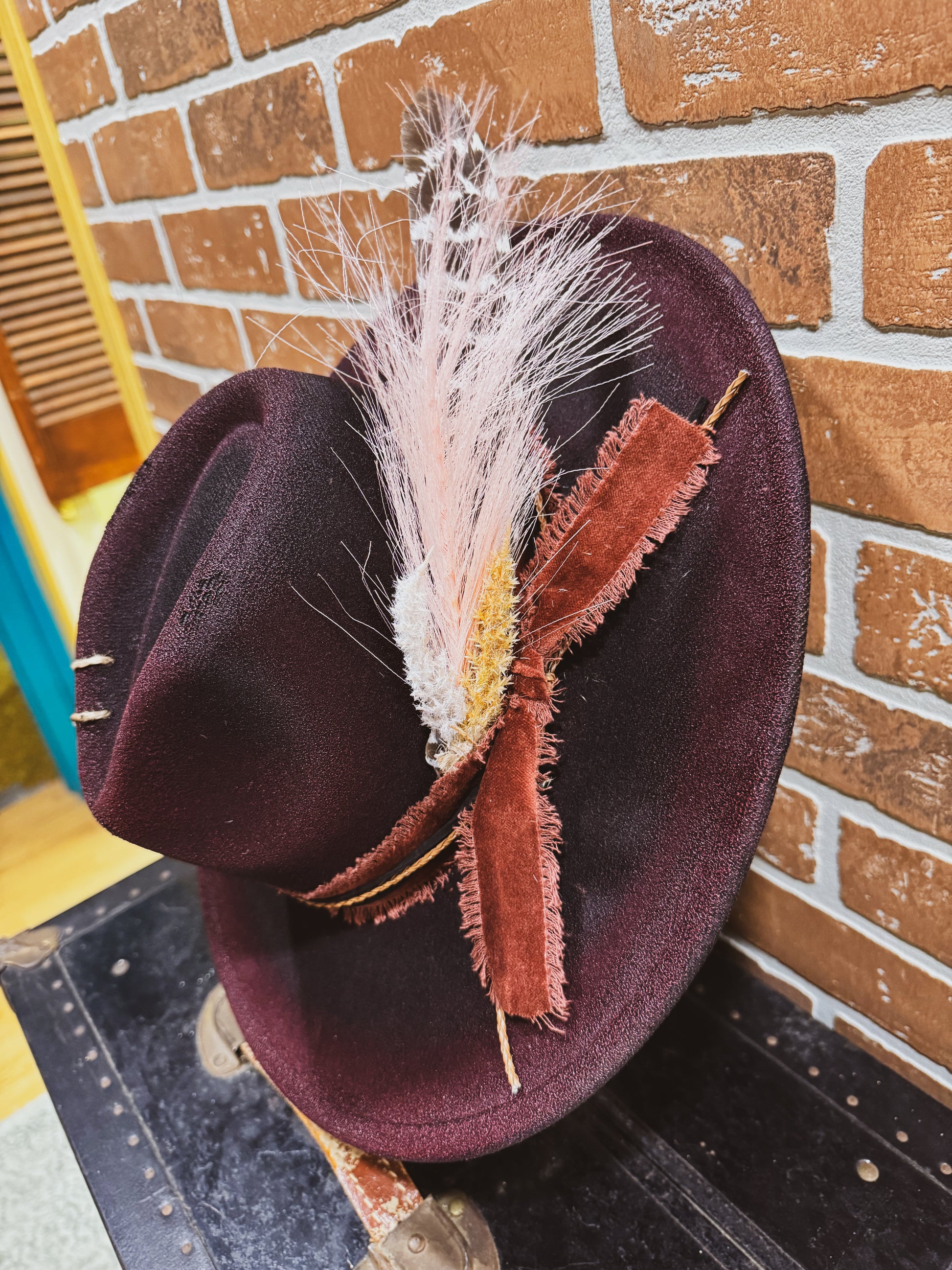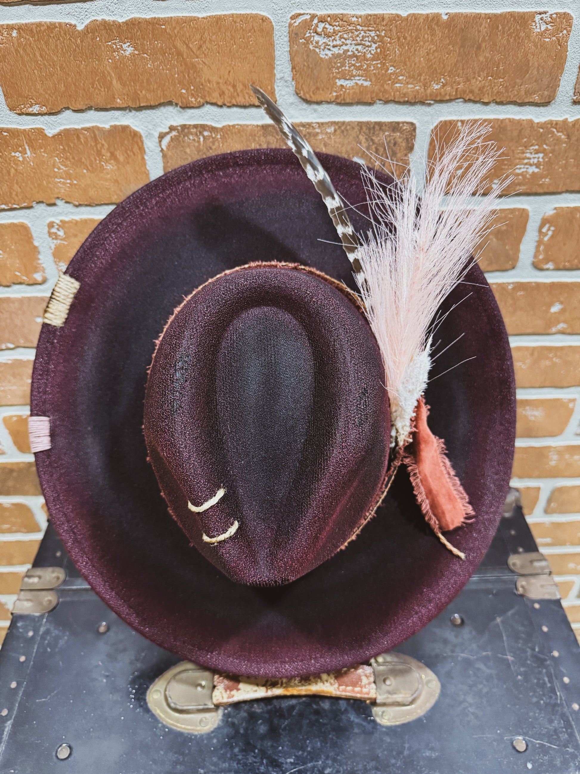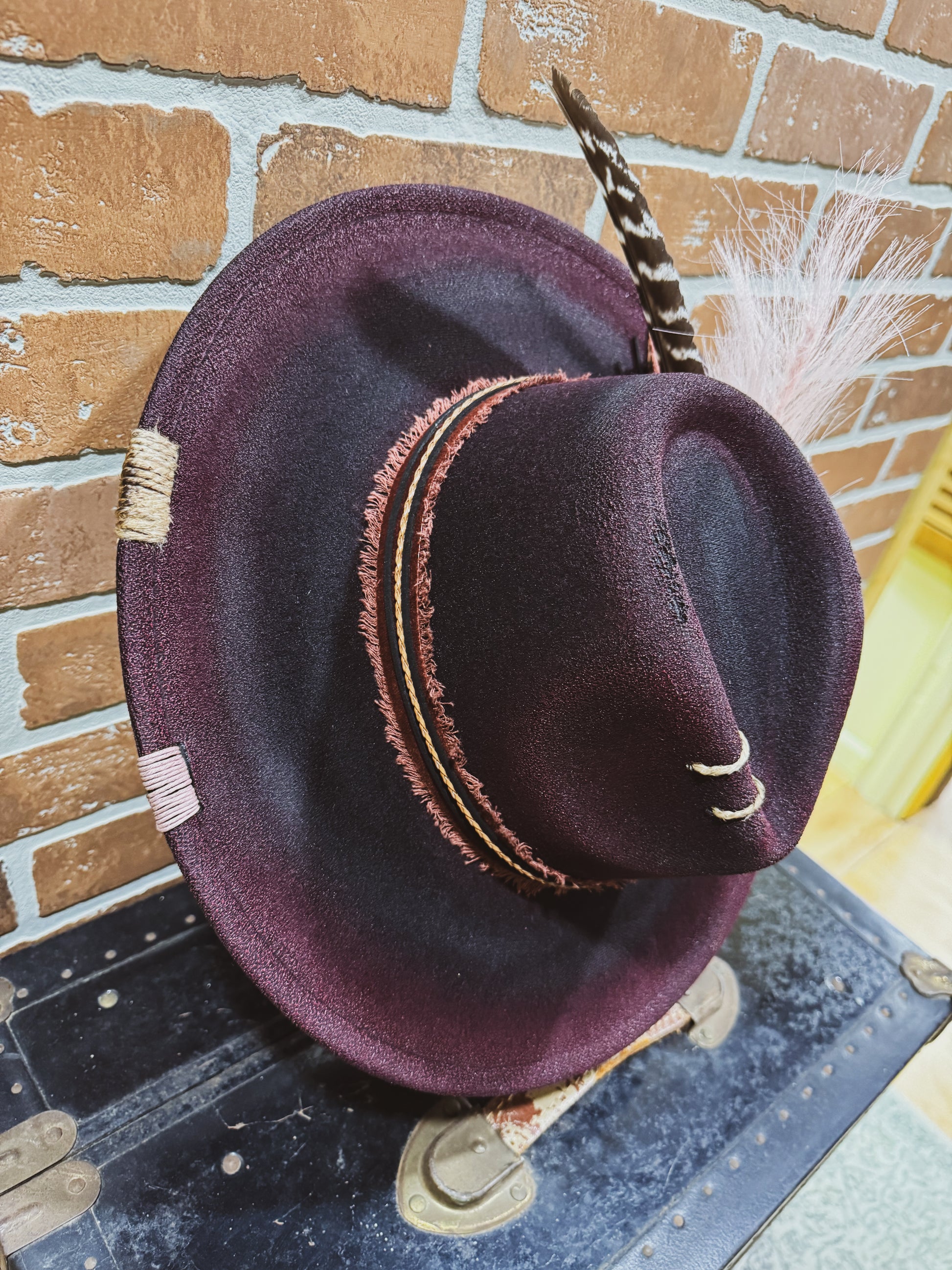 Black wide brim faux felt hat with burgundy paint accents. Fabrics wrapped and tied on the side with real and artificial feathers. Twine brim details. Adjustable drawstrings on the side to tighten if needed. 4.75” height, 3.5” brim, 22” circumference. 65% cotton, 35% polyester.