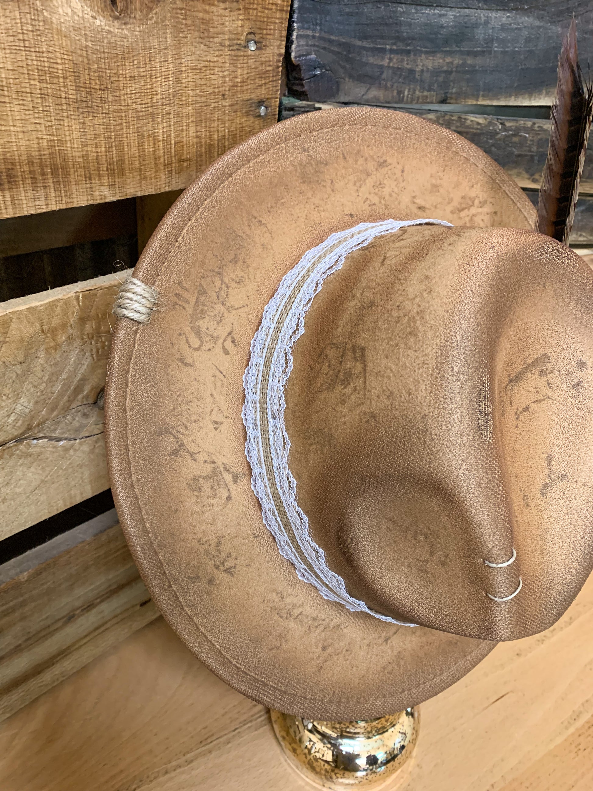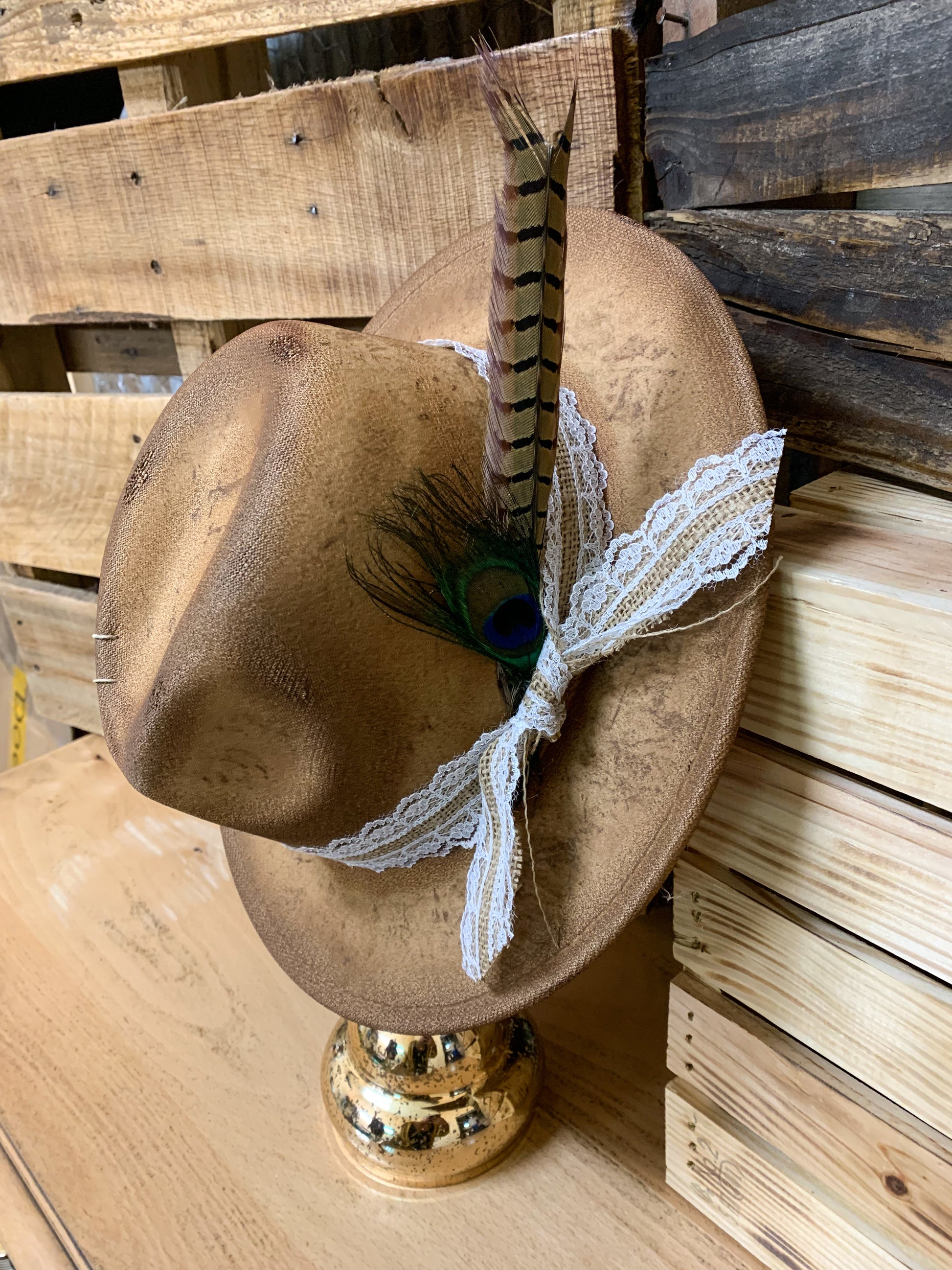 Tan hat with brown splatter look and burlap and lace band with pheasant and peacock feathers on the side. Adjustable drawstrings inside to tighten. 4.75” height. 2.75” brim. 22” circumference. 65% cotton, 35% polyester.