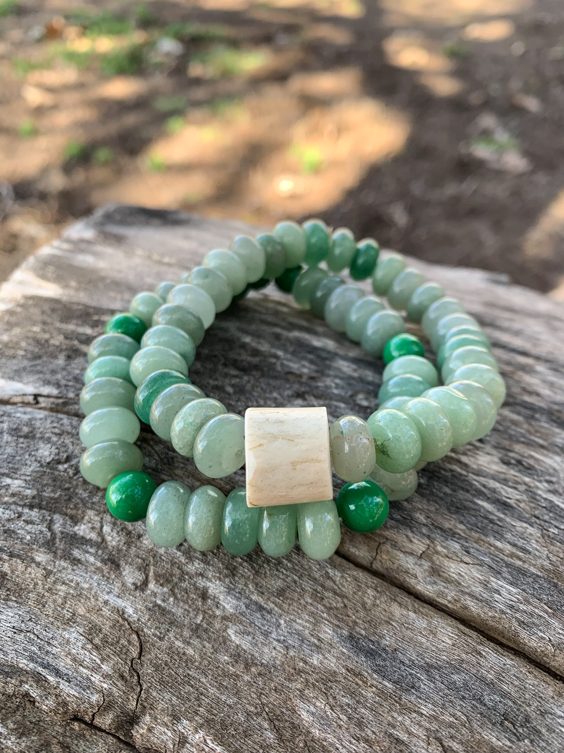 Light green glass slab beads with a small, authentic whitetail antler piece in the center. Handmade.