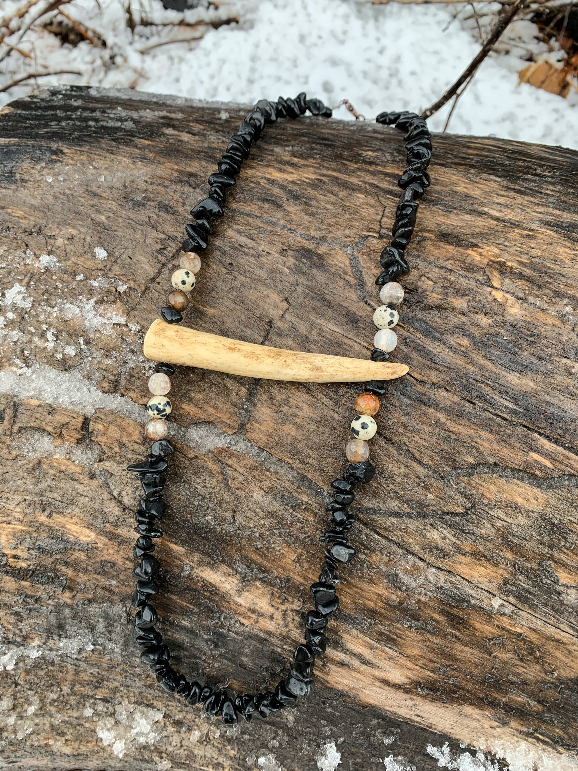 Black stone beads with a few brown accent beads and a horizontal authentic antler piece. Handmade.