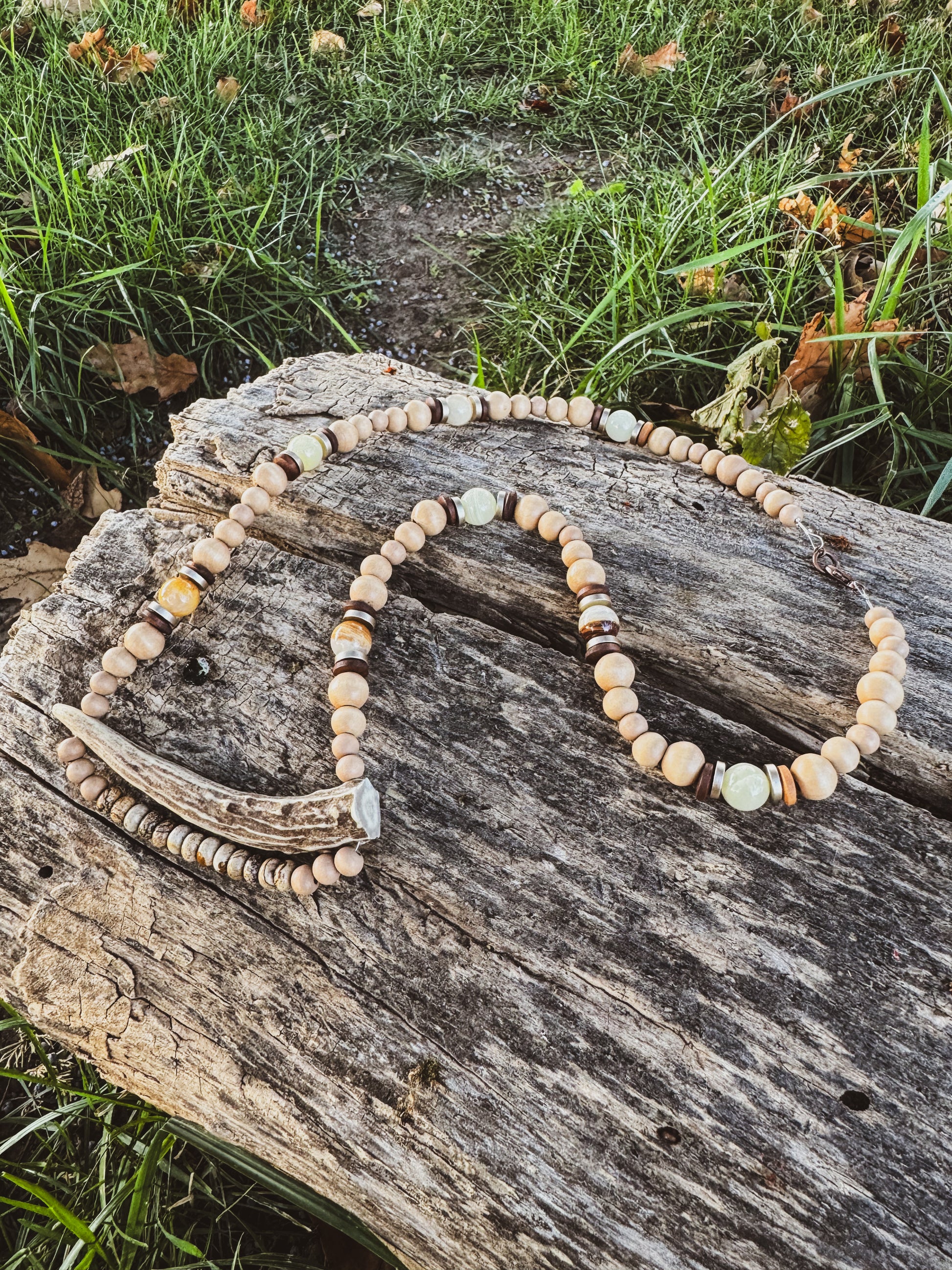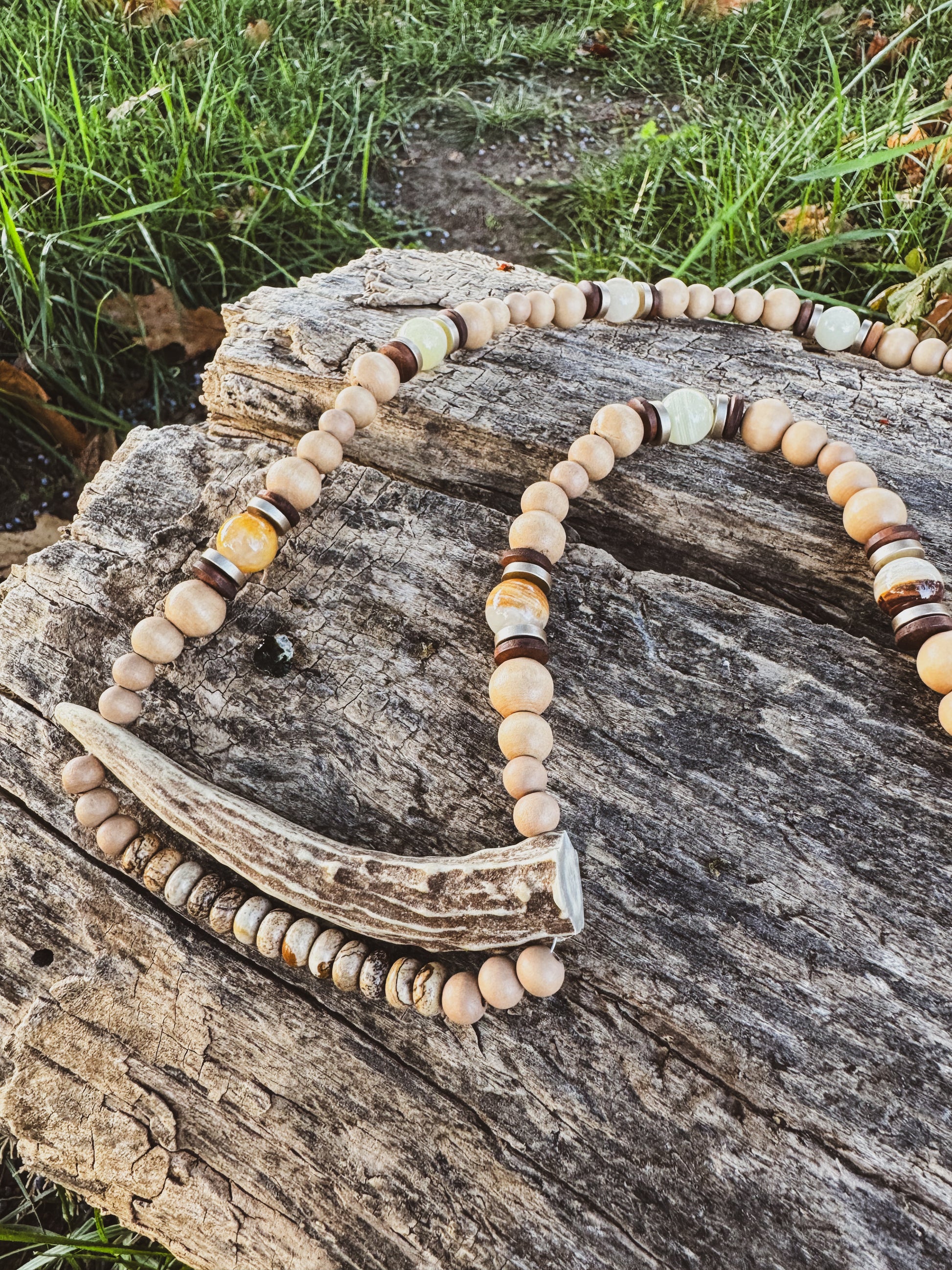 Beautiful glass and wooden beads with a textured authentic elk piece. Handmade. One-of-a-kind.