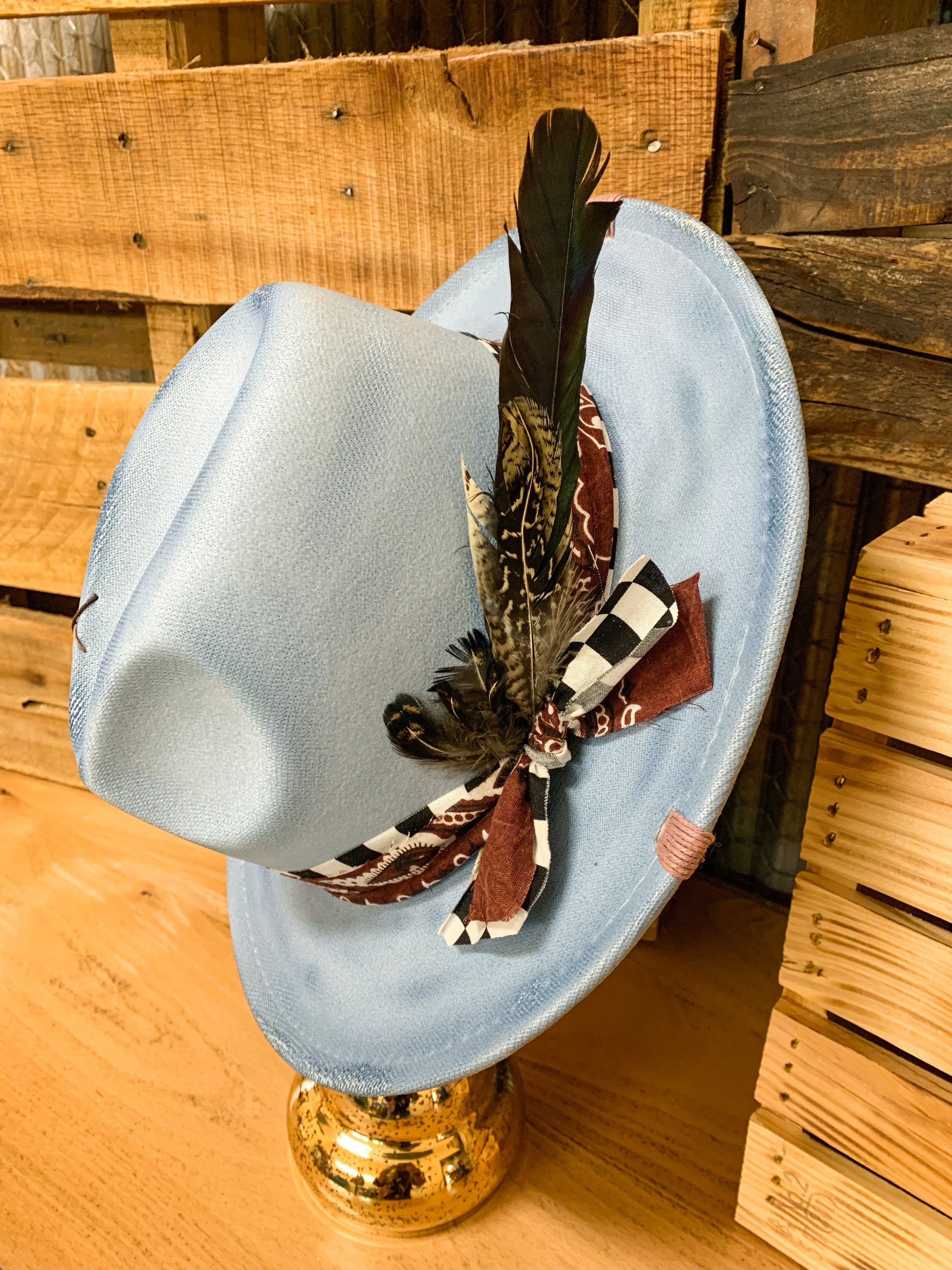 A light blue hat with distress design. Checkered bandana with burgundy bandana and three different types of feathers on the side. A burned spade playing card on the the other side, and light purple twine wrapped on brim. 4.75” height. 2.75” brim. 22” circumference. 65% cotton, 35% polyester.