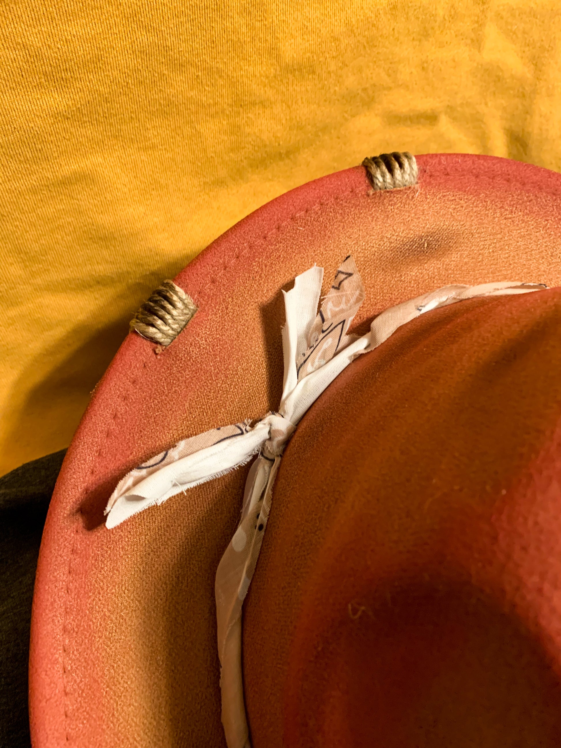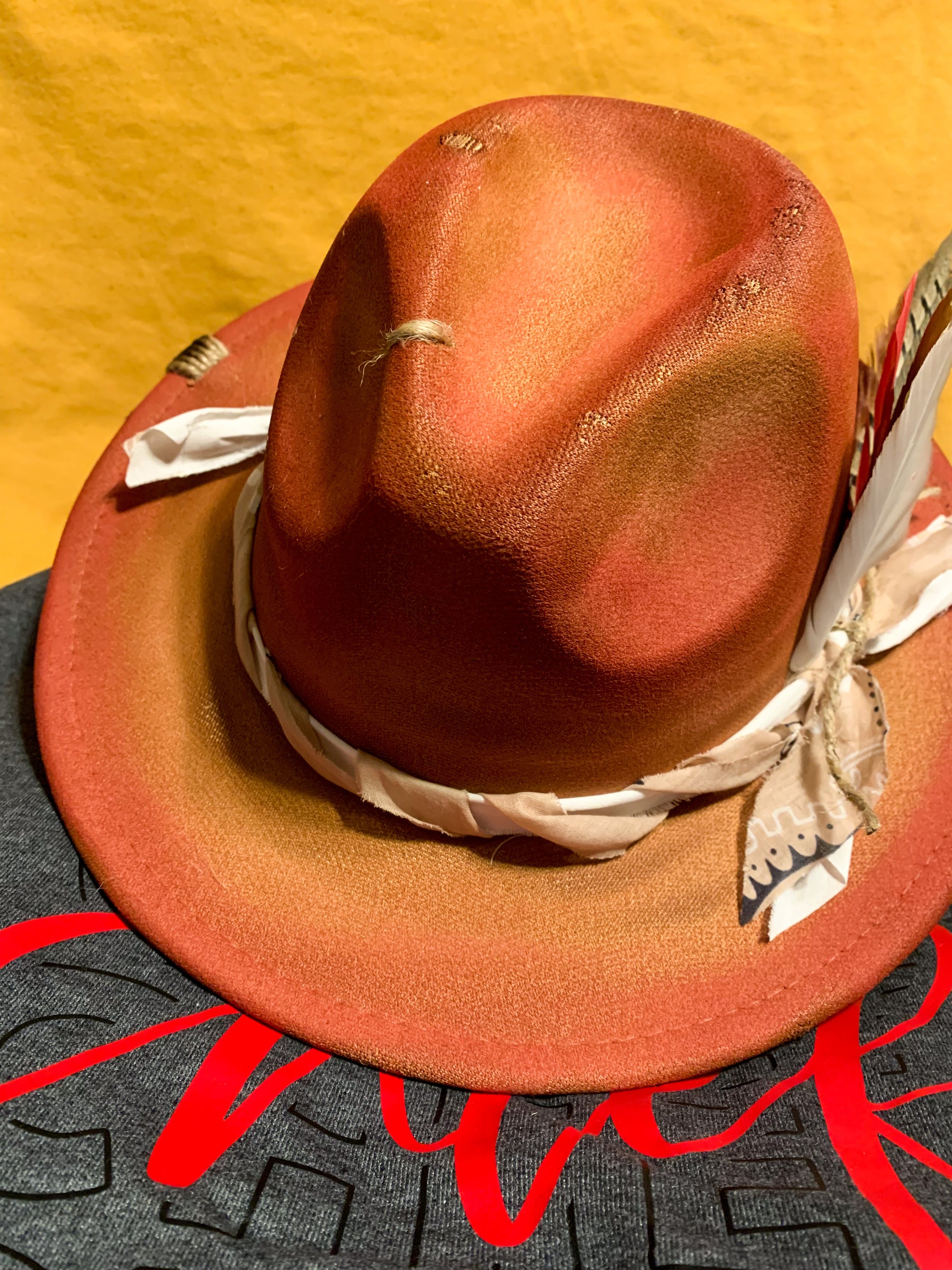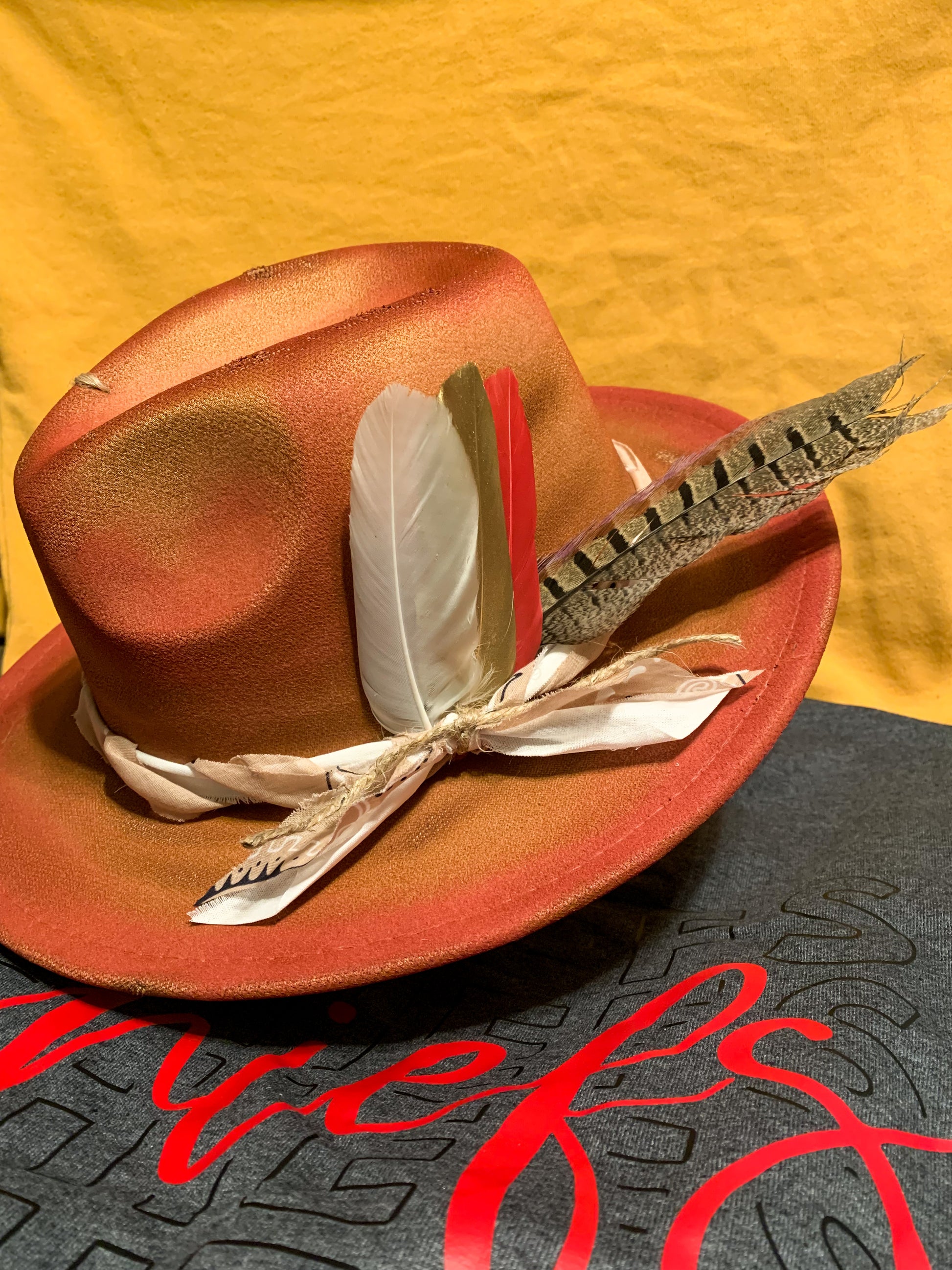 Chiefs Kingdom inspired hat with cream and tan bandanas wrapped around the base, and 3 snow geese feathers. One painted gold, one painted red, and one original colored white one, and then a pheasant feather accent! Adjustable drawstring inside. 4.75” height. 2.75” brim. 22” circumference. 65% cotton, 35% polyester.