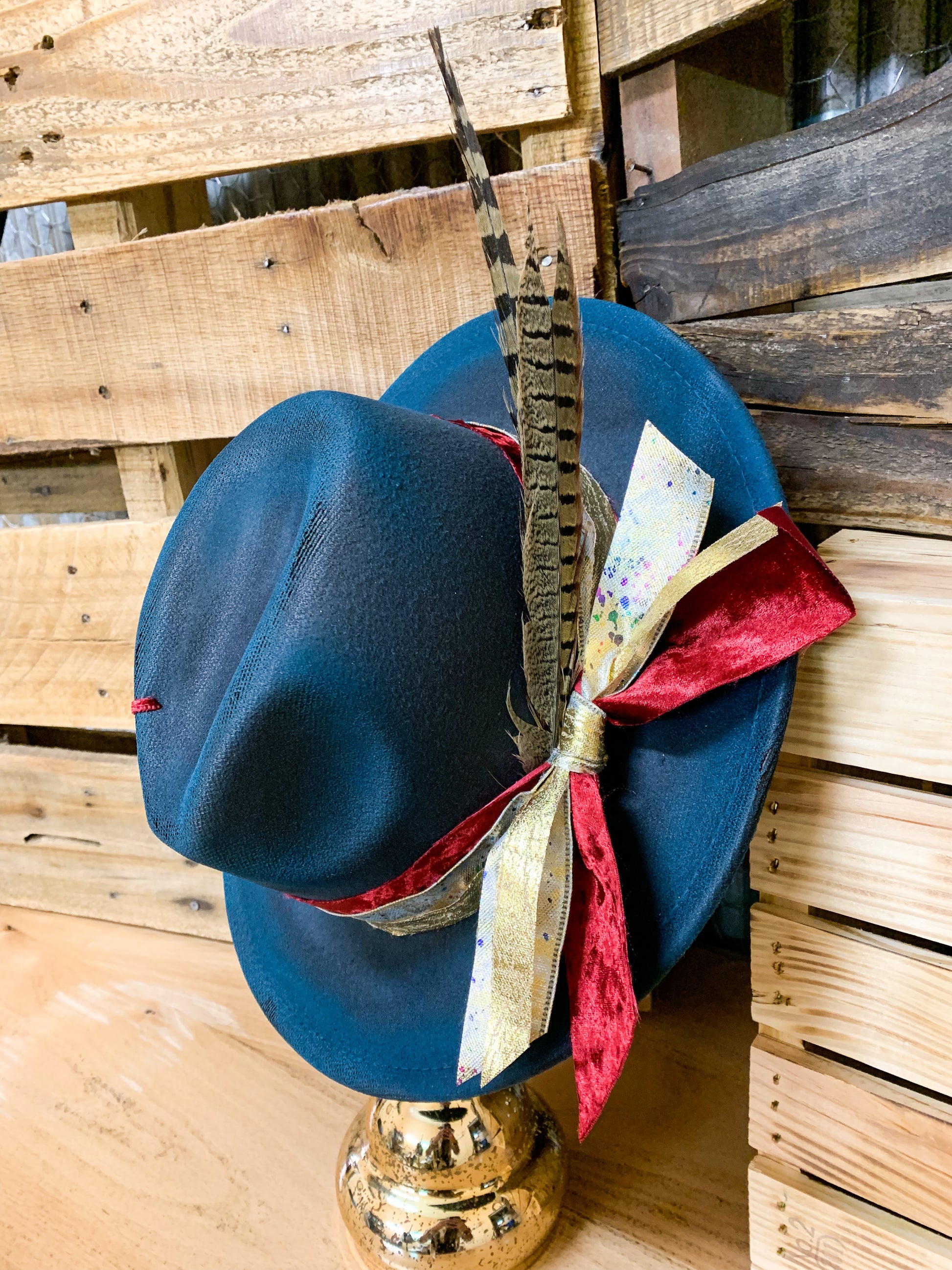 A fun teal colored hat with red velvet, paint splatter, and gold material for a band, and 2 pheasant feathers on the side. Drawstrings inside to tighten. 4.75” height. 2.75” brim. 22” circumference. 65% cotton, 35% polyester.