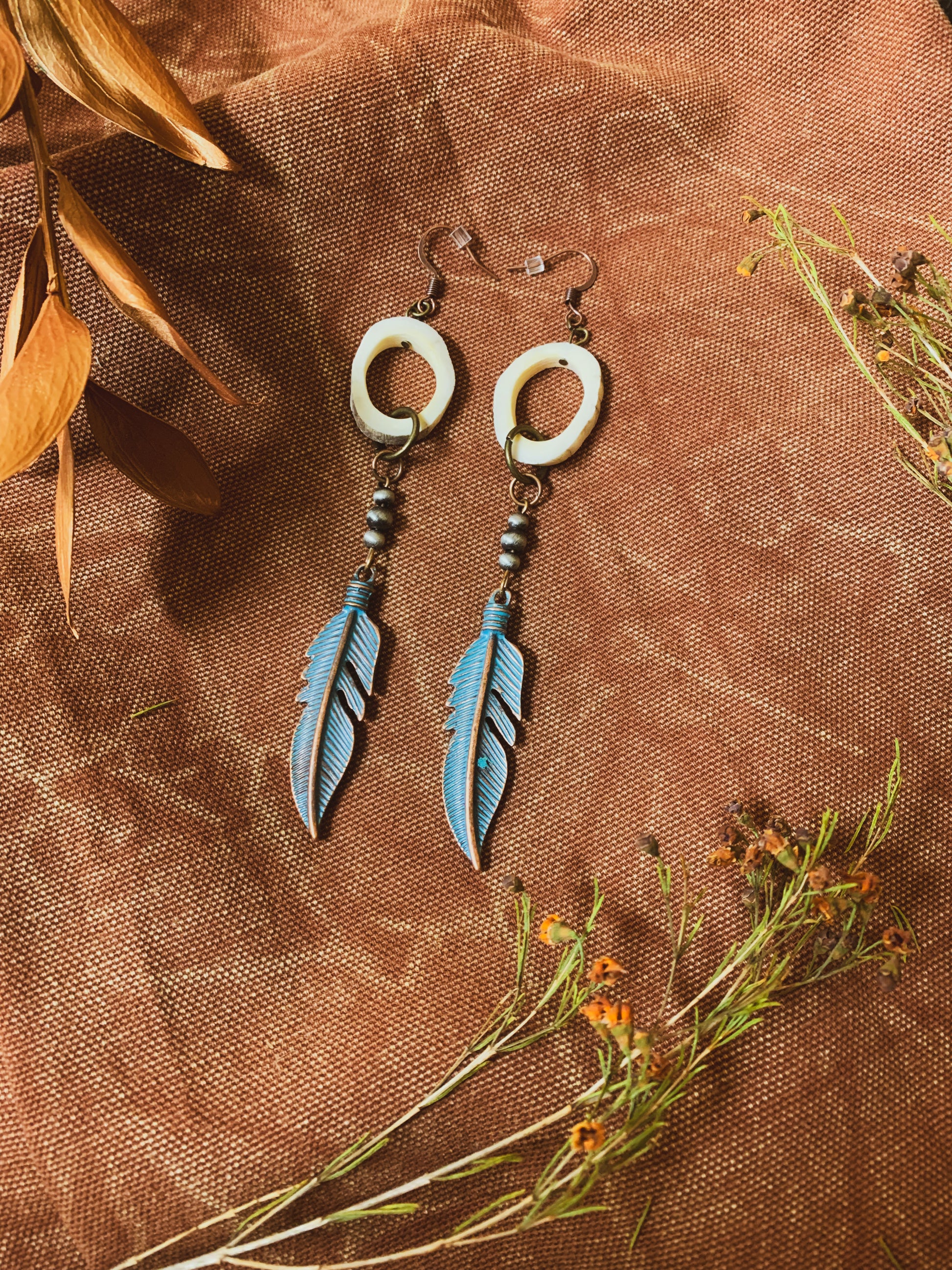 Beautiful turquoise/copper feathers and faux Navajo beads hanging from a hollowed out authentic whitetail antler piece. Handmade.