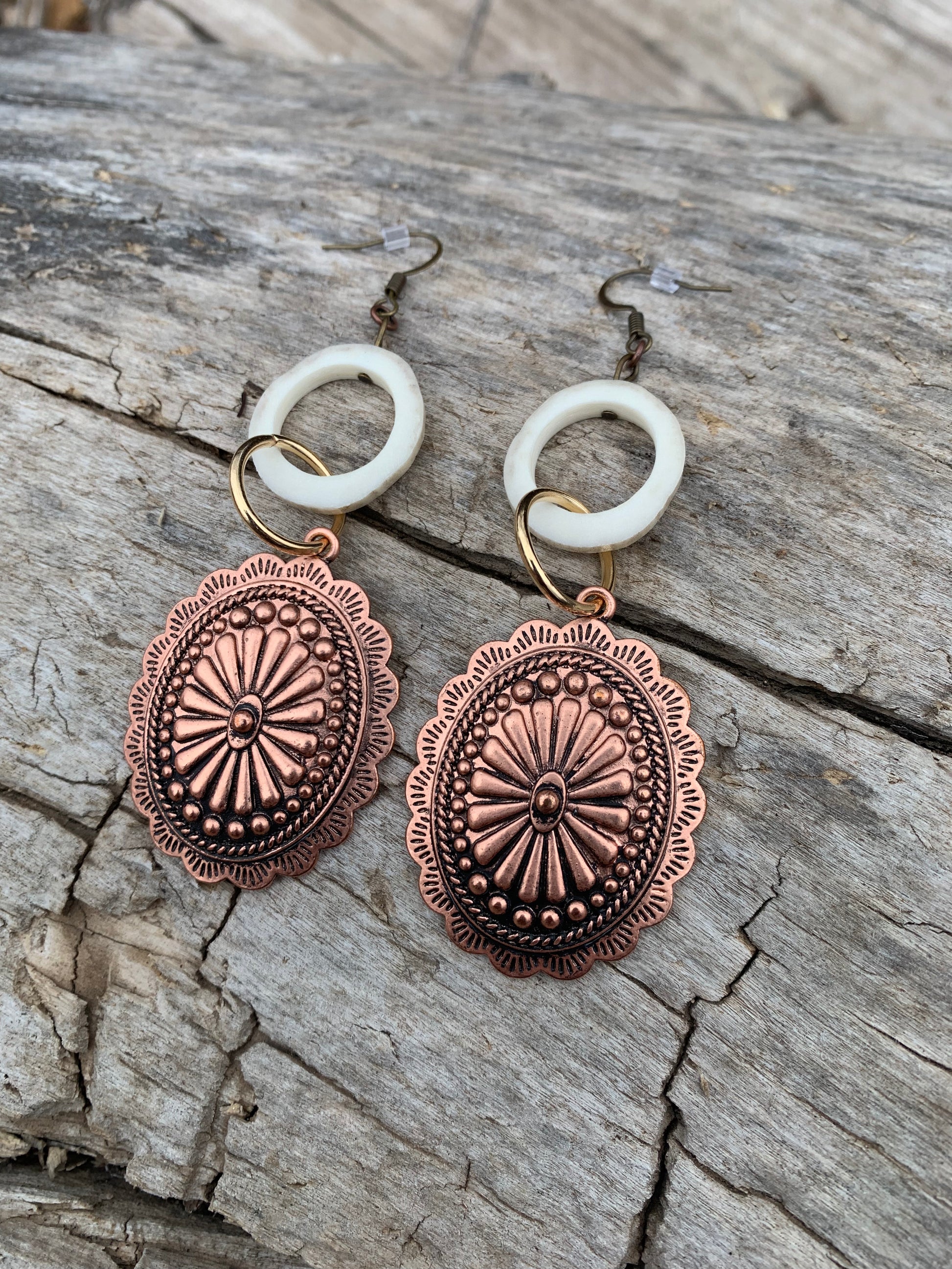 Fun hollowed out antler pieces with gold hoops connecting copper slab pieces!