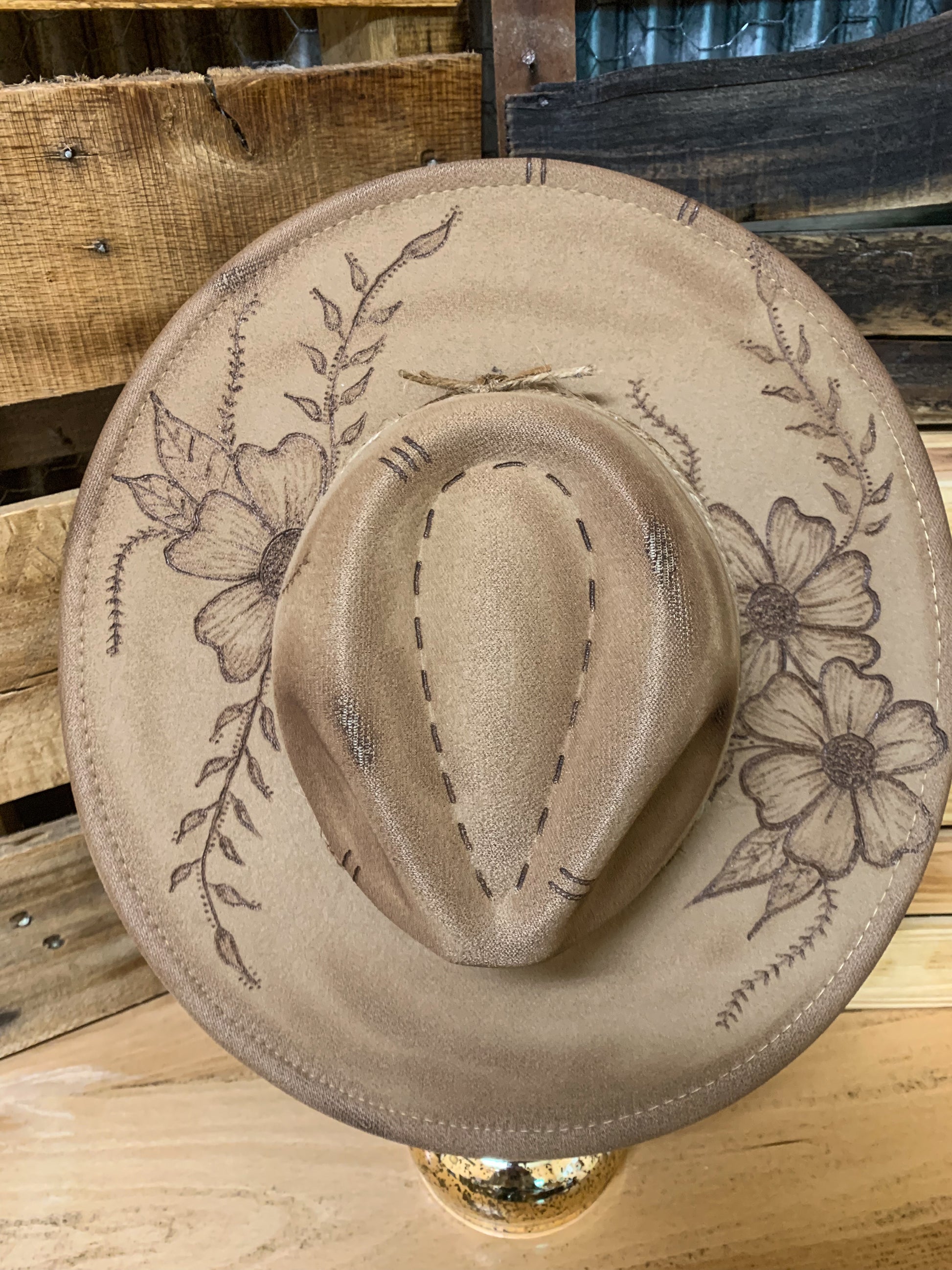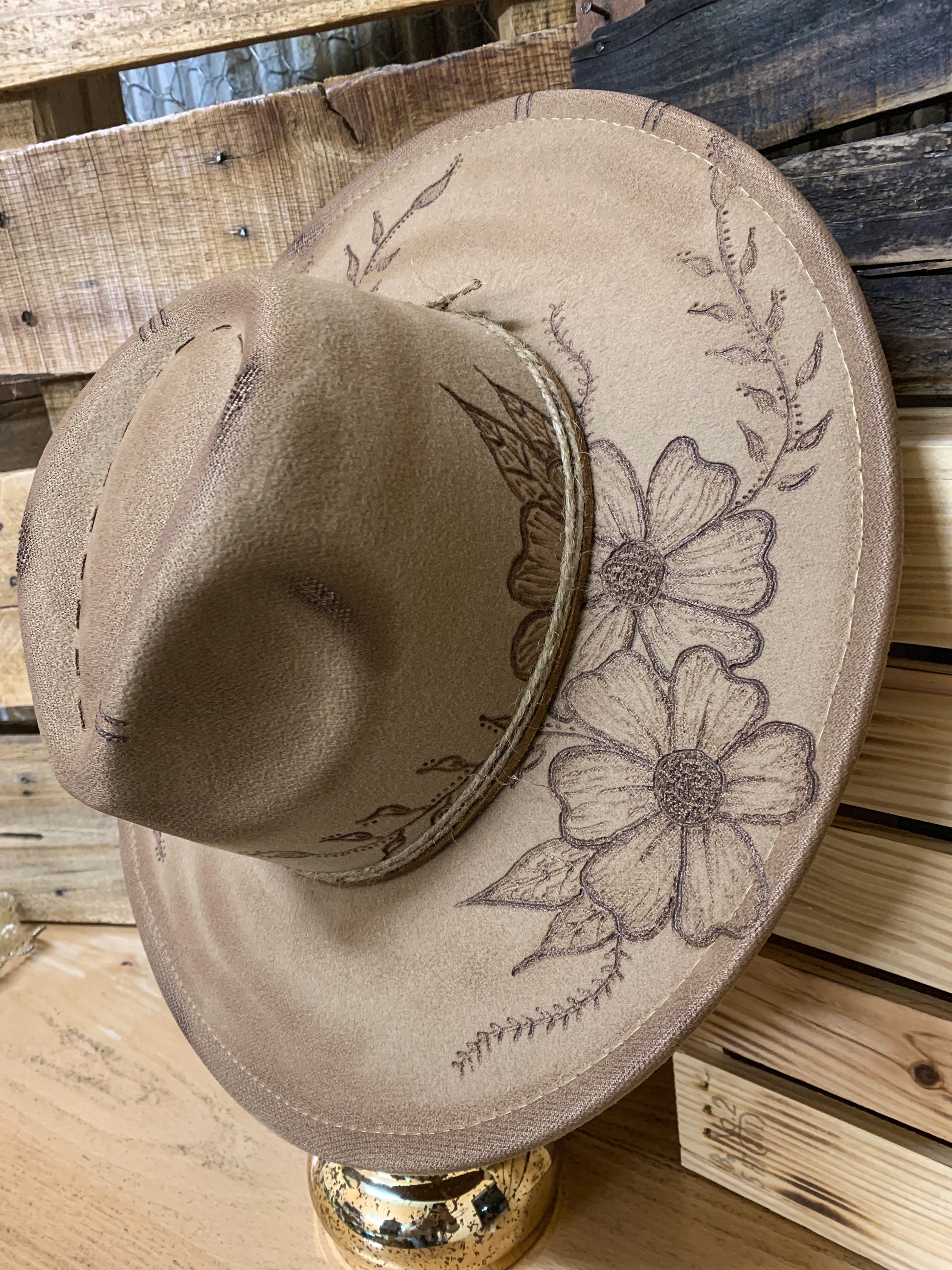 A beautiful faux felt hat with hand drawn floral designs burned into the brim and line etching on top. Twine and cord wrapped around the base. Adjustable drawstrings inside to tighten down if needed. 3.5” brim, 22” circumference. 35% polyester, 65% cotton.
