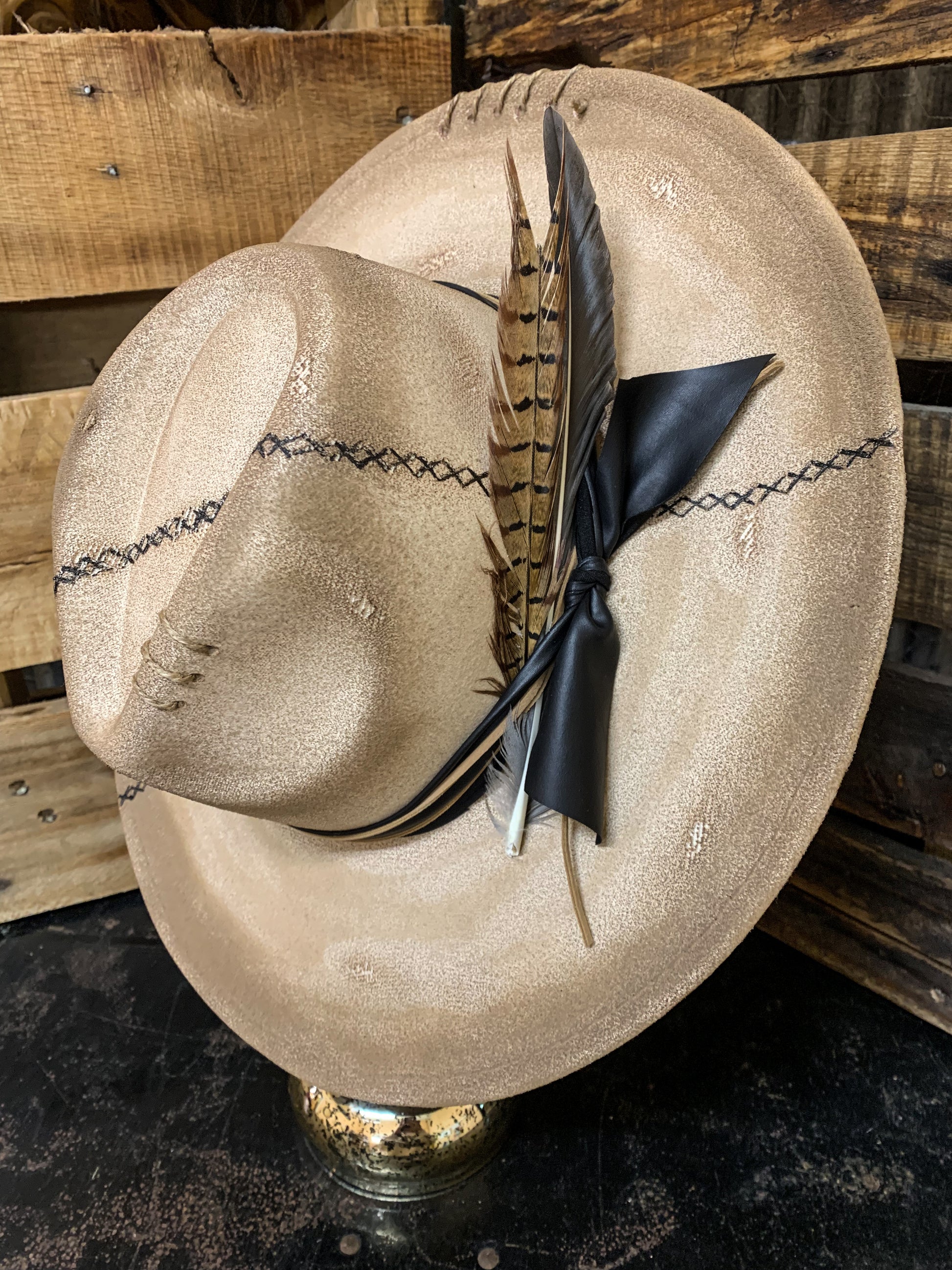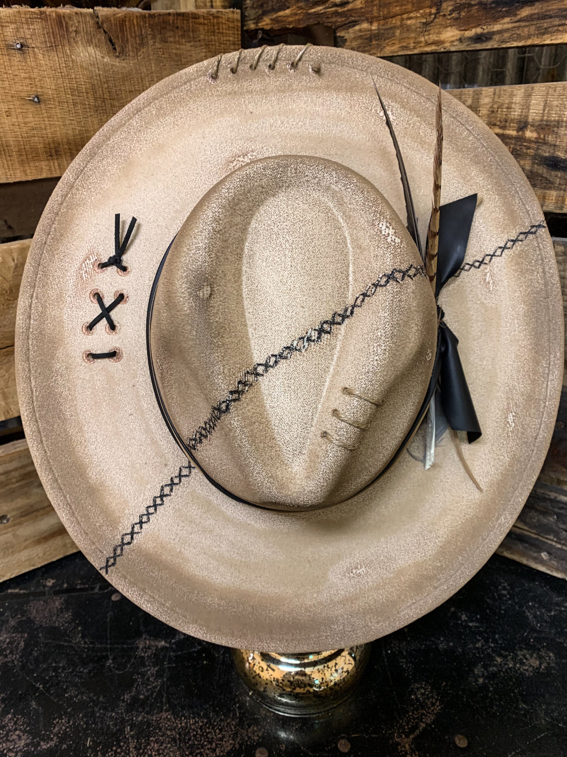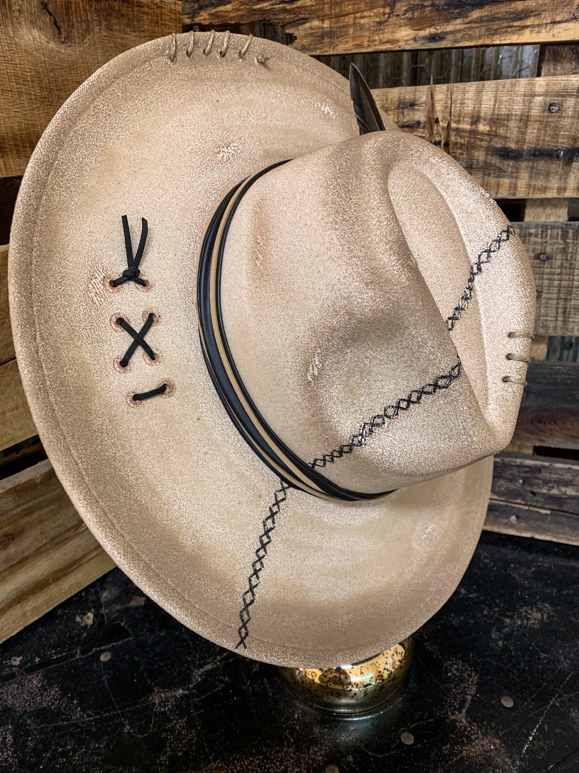 Ivory faux felt hat with brown painted accent colors. Faux leather band wrapped around. Twine and suede cording wrapped around brim and criss crossed on side. Black Xs painted across hat. Drawstrings inside to tighten if needed. 3.5” brim, 22” circumference. 35% polyester, 65% cotton.