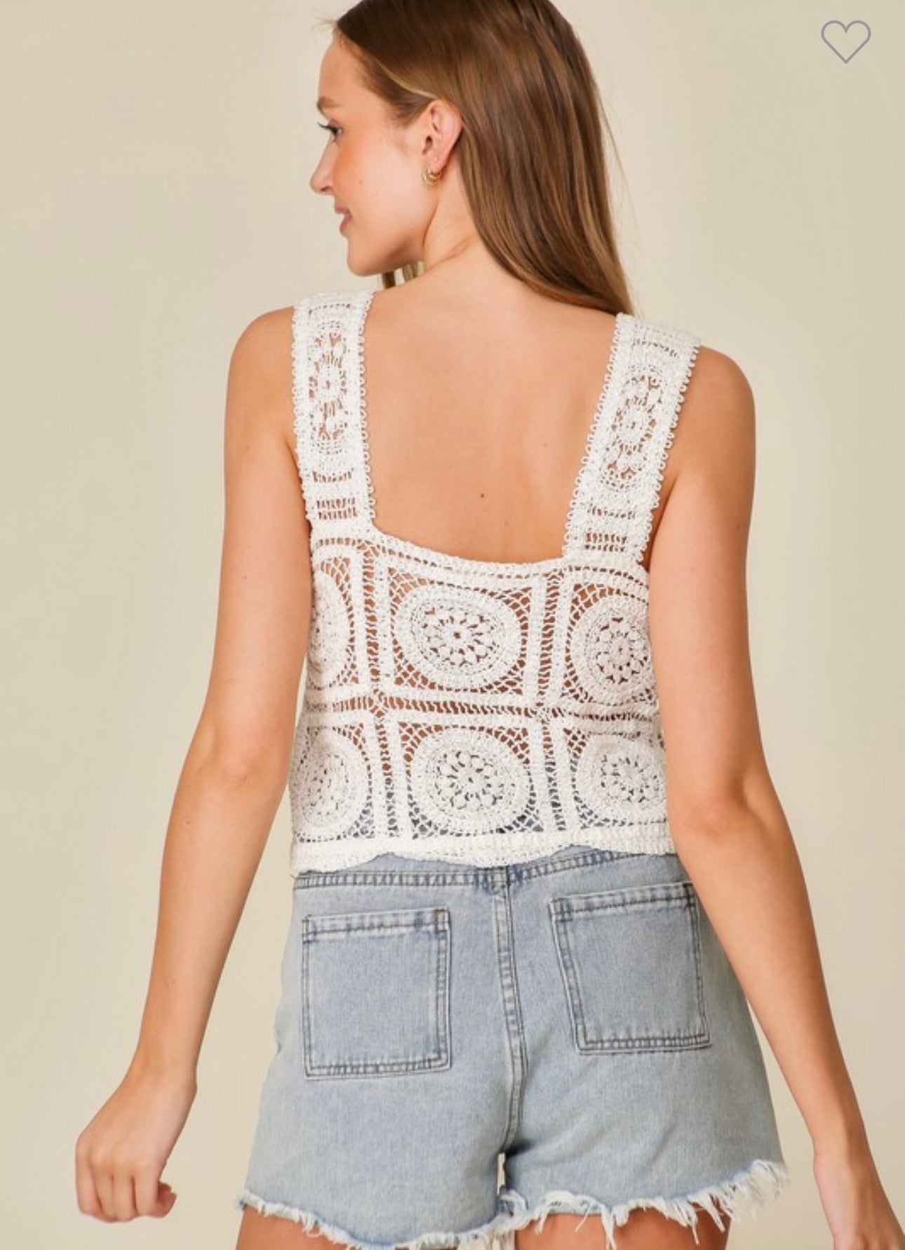 This darling crochet crop top features a charming square neck and intricate crochet design. Perfect for adding a touch of elegance and texture to any outfit. Crafted with care and attention to detail, this top is sure to become a staple in your wardrobe.