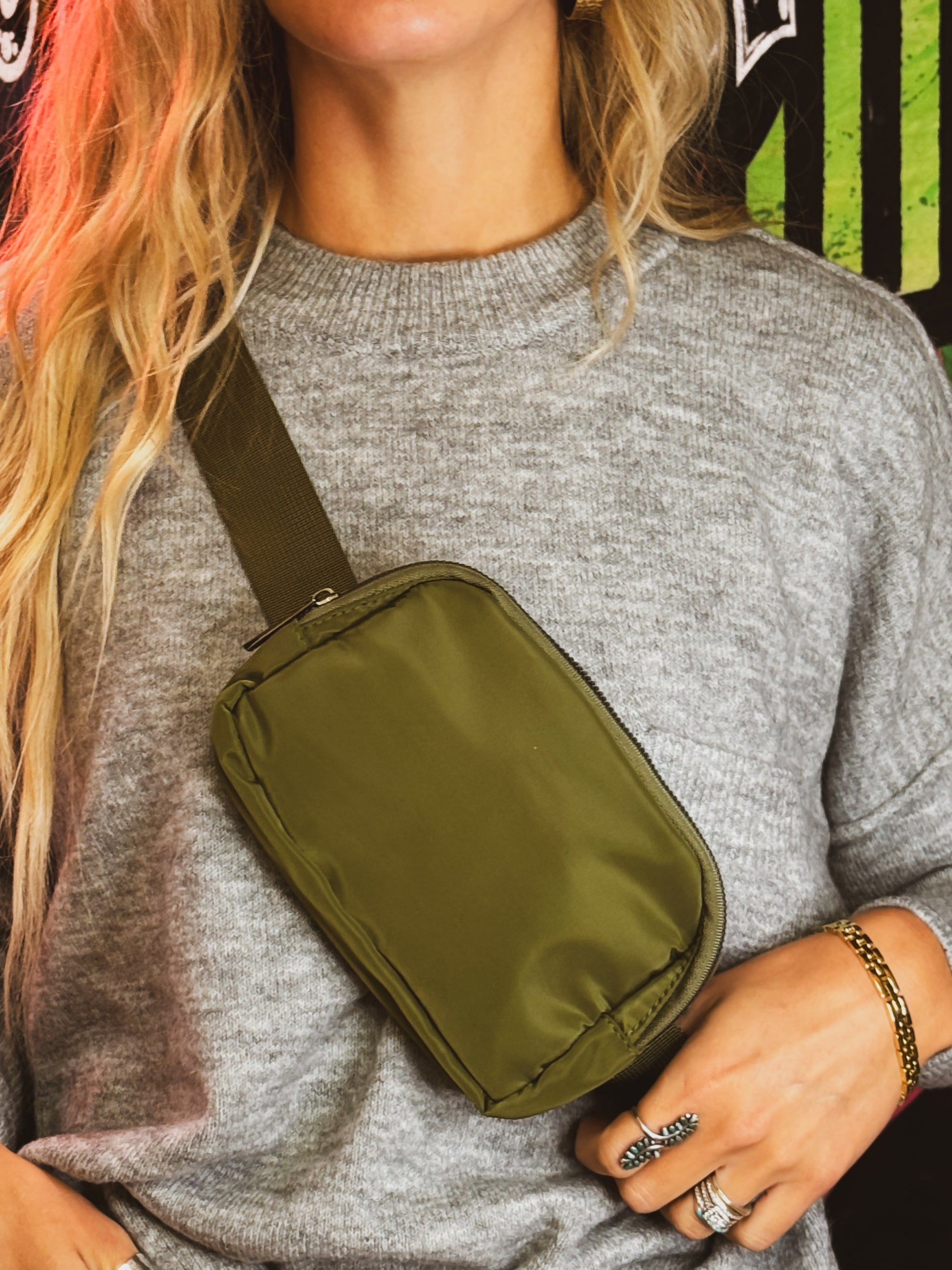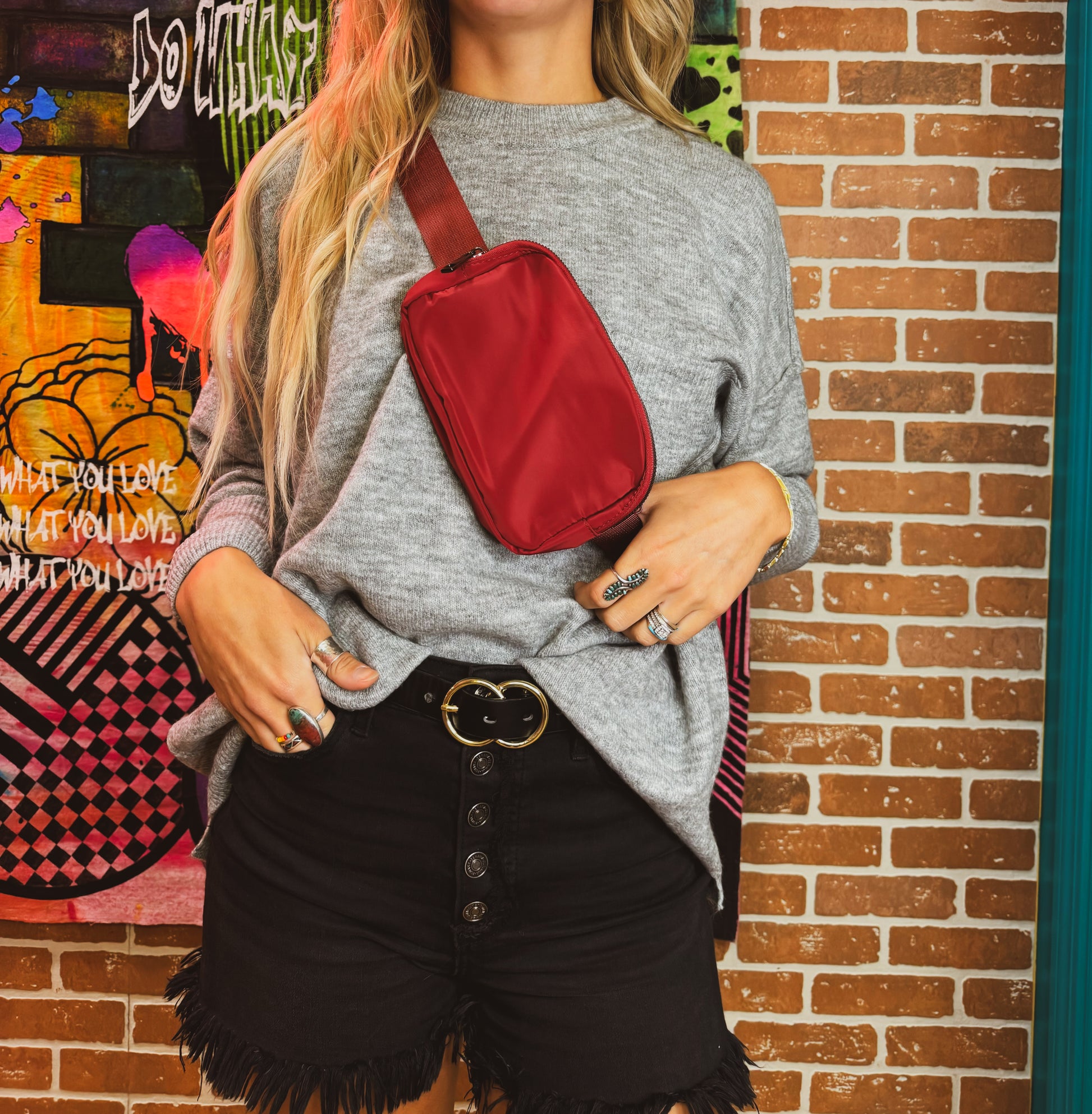 Fashion sling bag with adjustable strap and buckle. Zipper closure.