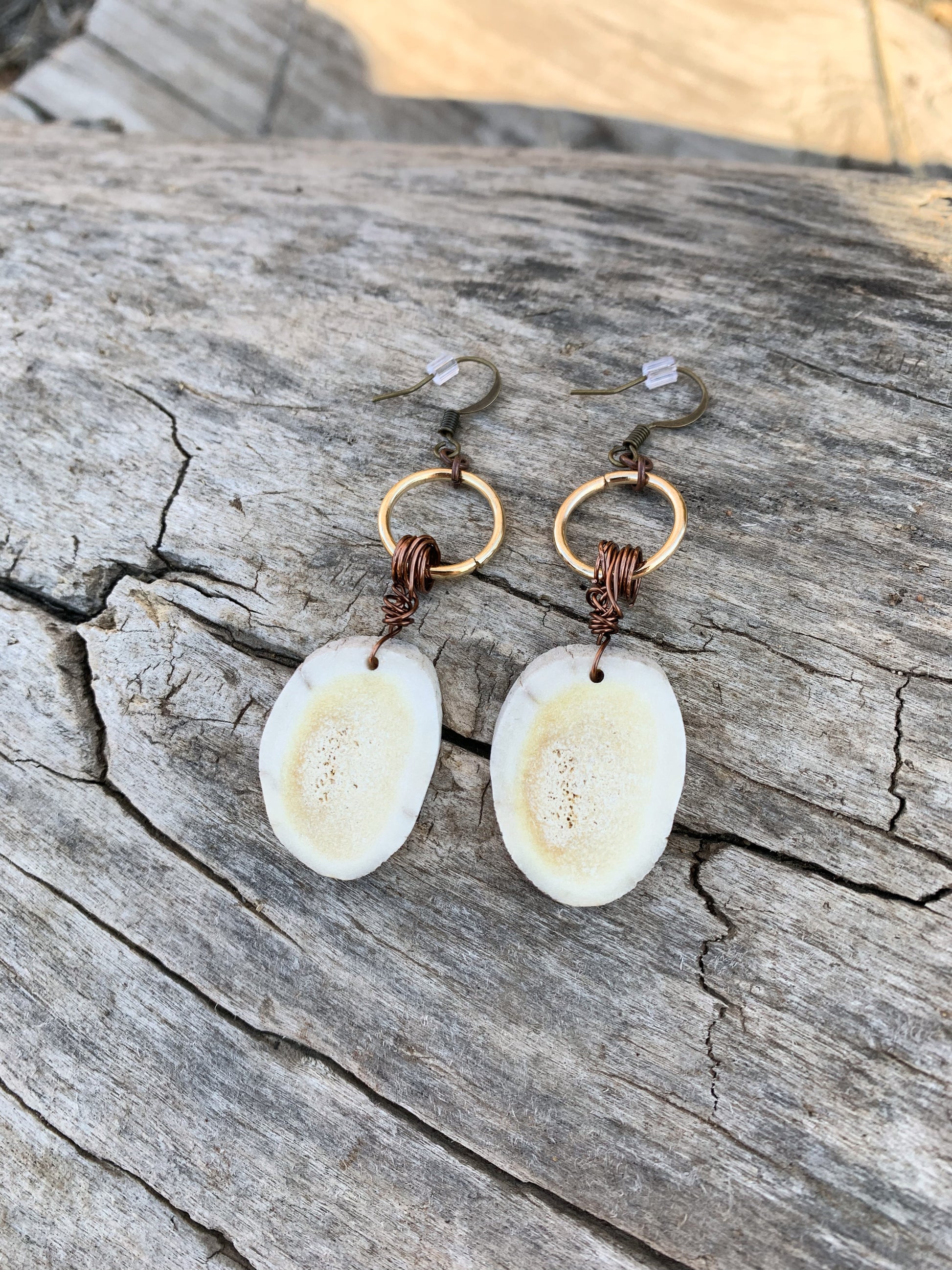 Smooth antler slab pieces with dainty copper wire wrapped around a gold hoop.