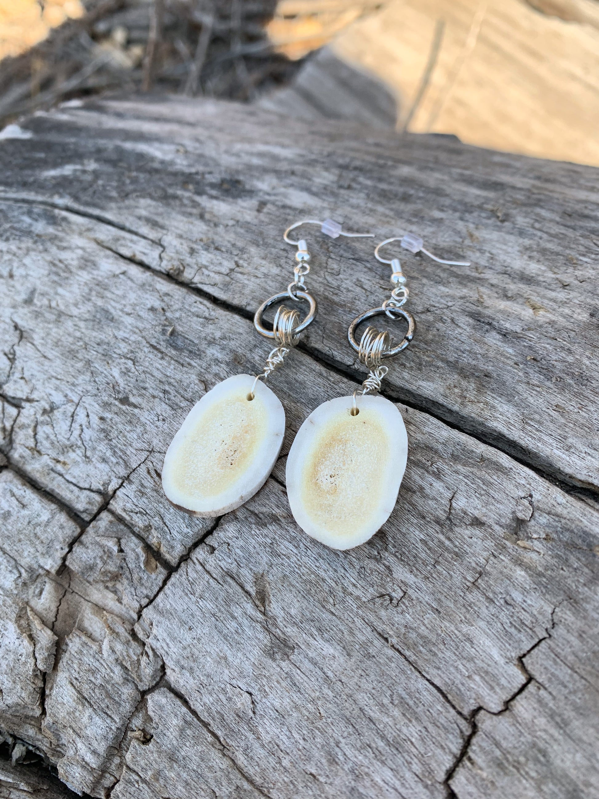 A smooth thin antler slab piece with dainty silver wire wrapped around a silver hoop.