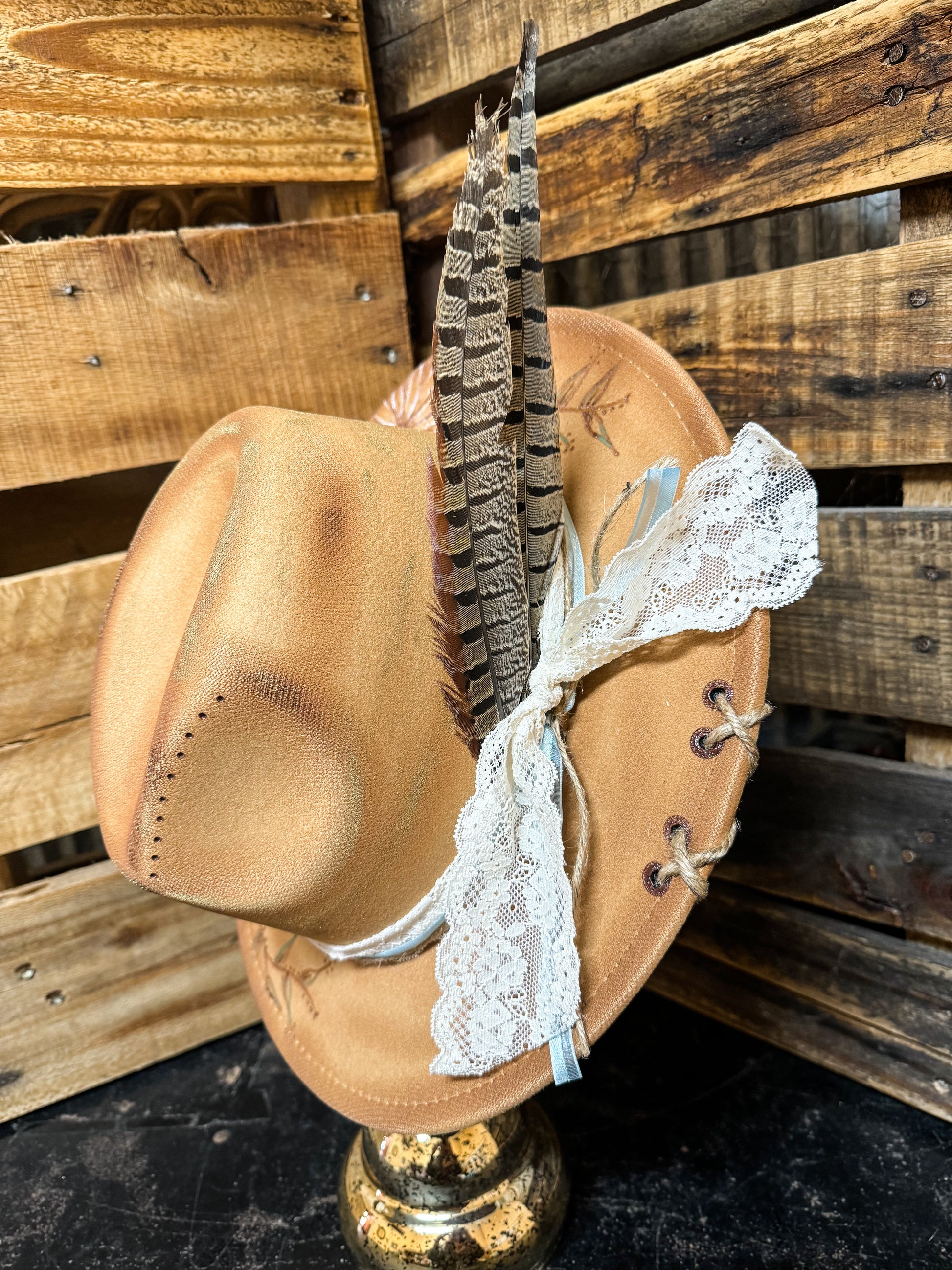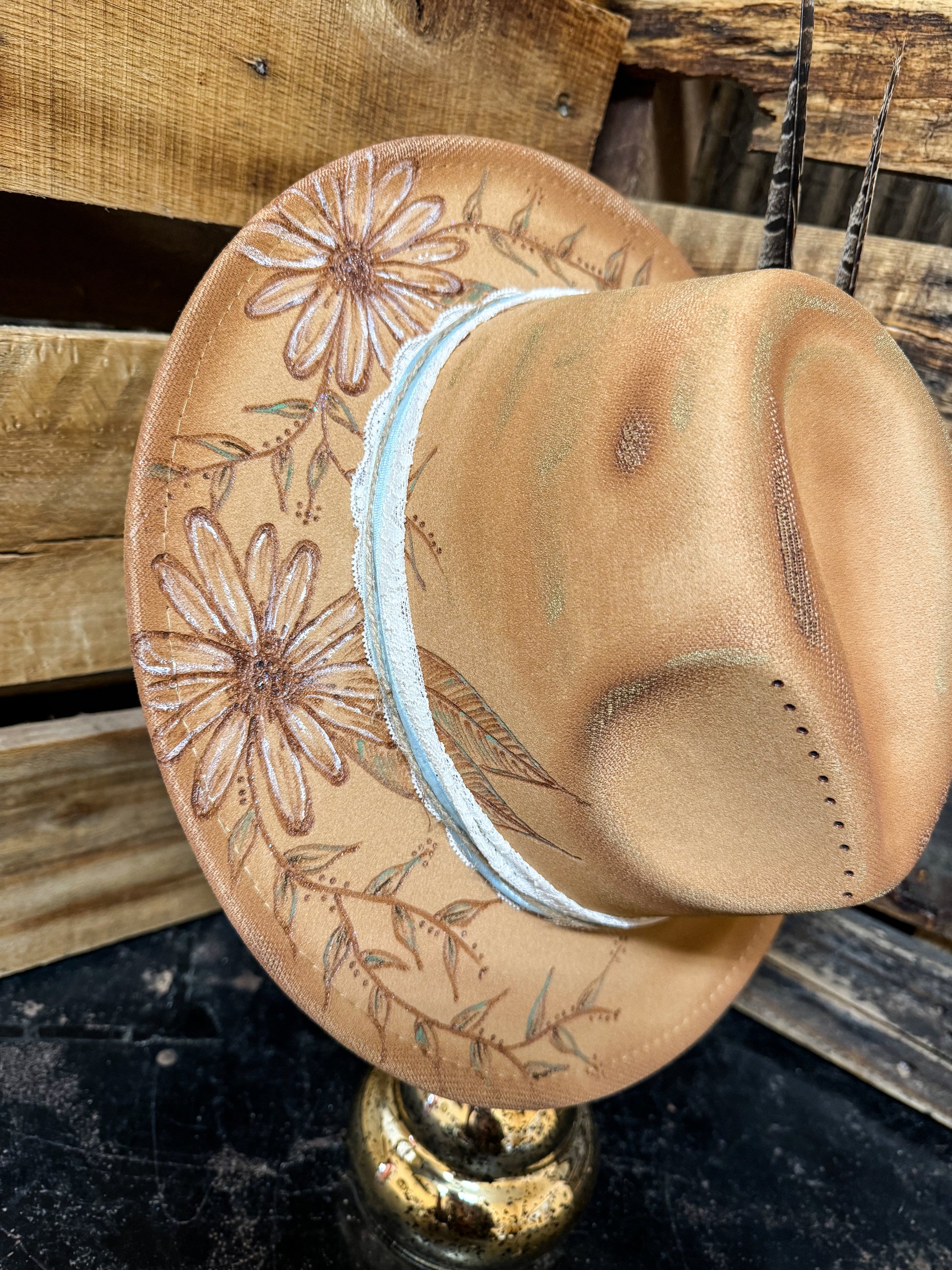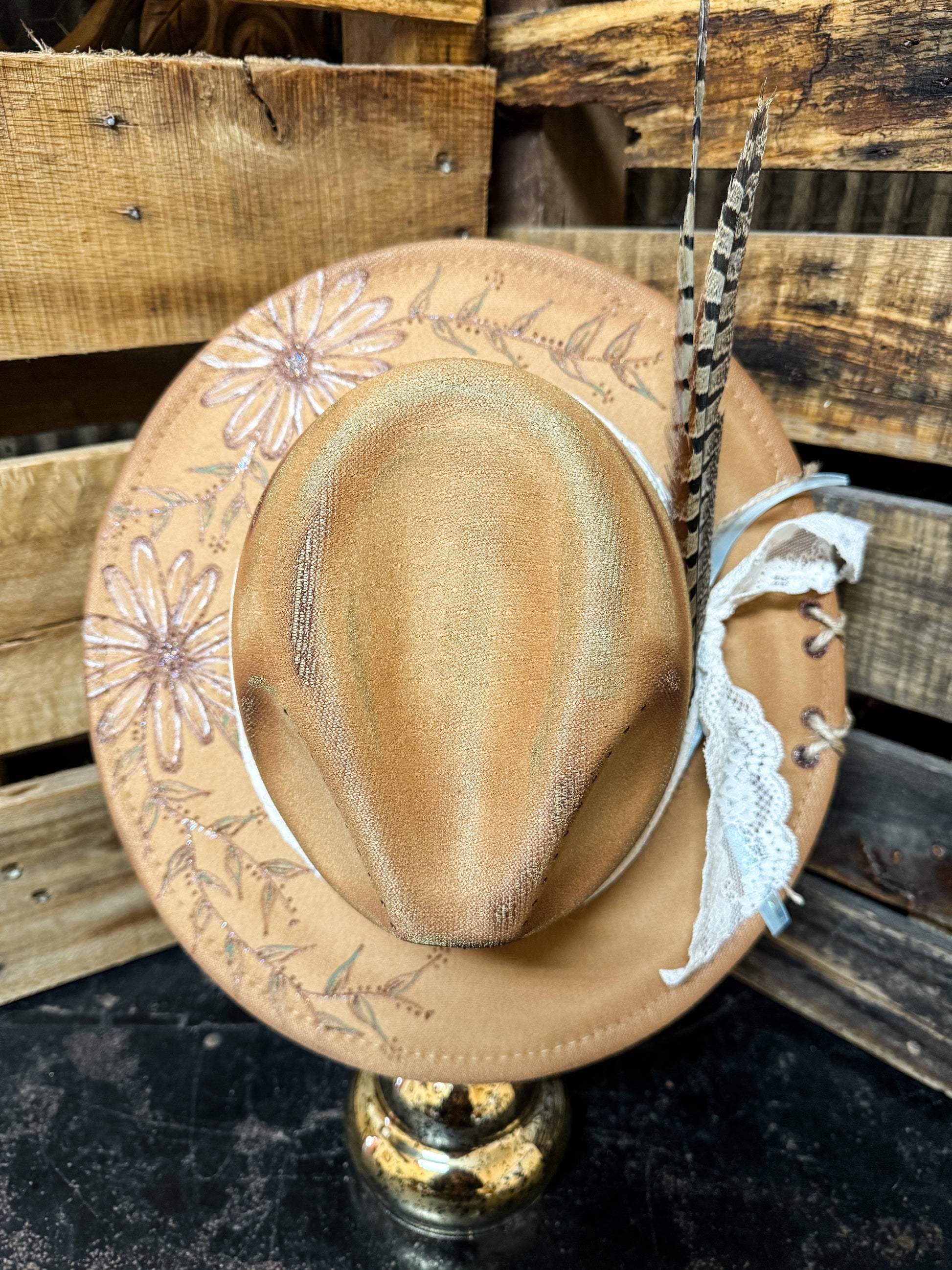 Faux felt hat with hand burned daisies and paint design over top. Lace and twine fabrics wrapped around and tied on the side. Two fun pheasant feathers to complete it! Adjustable drawstrings inside to tighten if needed. 4.75” height. 2.75” brim. 22” circumference. 65% cotton, 35% polyester.