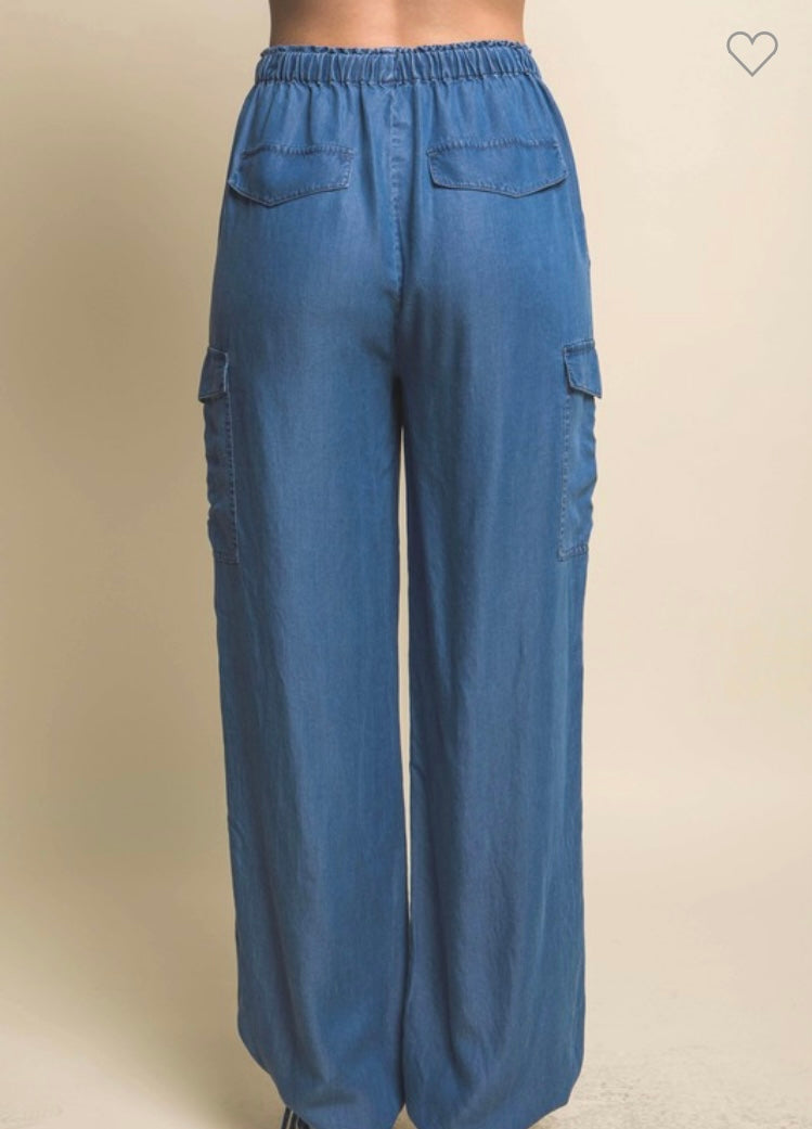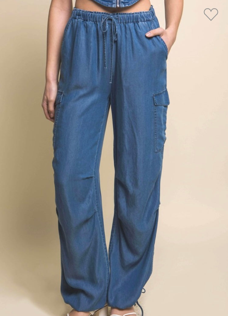 Full length cargo pant with functional side pockets and drawstring ankle designs.