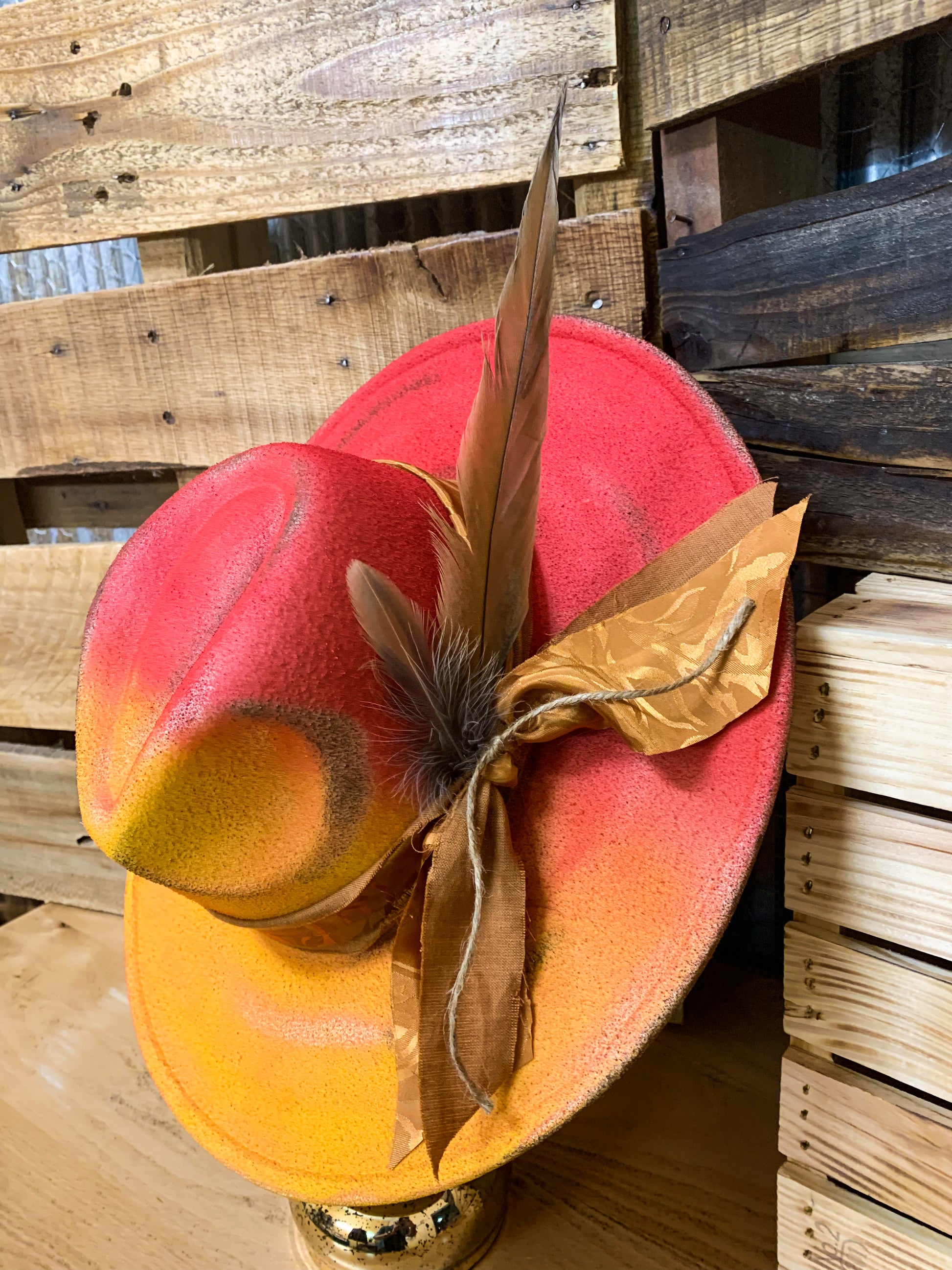 A beautiful sunset inspired hat with red and yellow colors and two different rust colored fabrics for a band. Two orange pheasant feathers on the side. Sun burned into the side and twine wrapped brim. Adjustable drawstrings inside to tighten. 3.5” brim, 22” circumference. 35% polyester, 65% cotton.