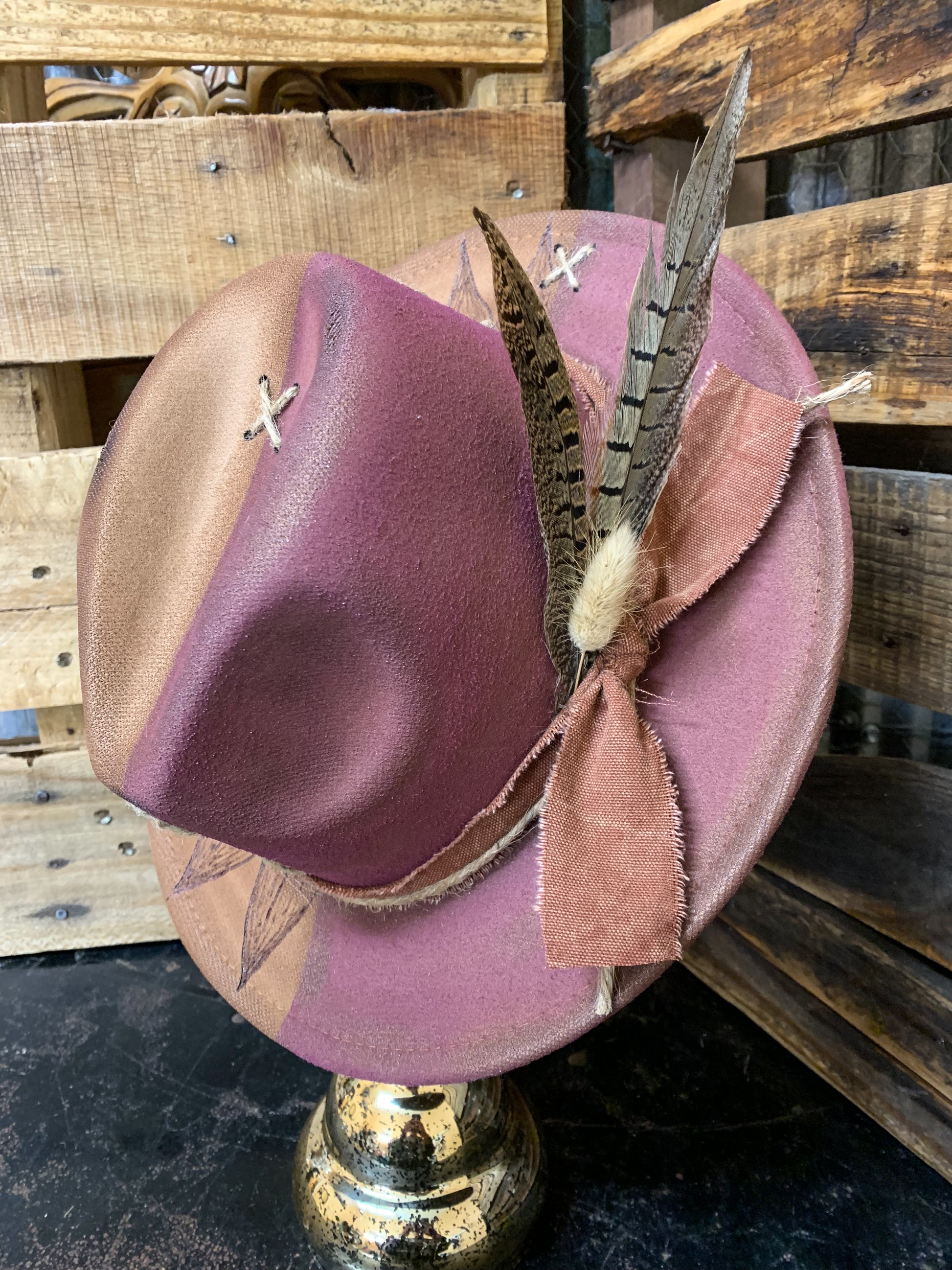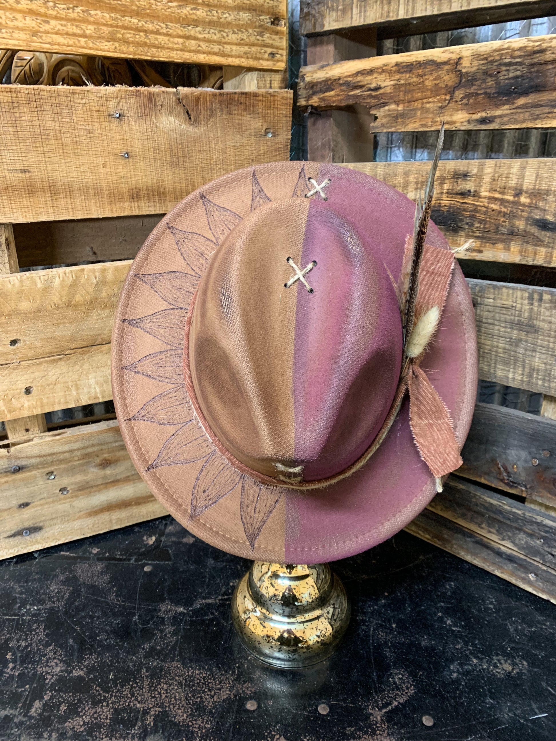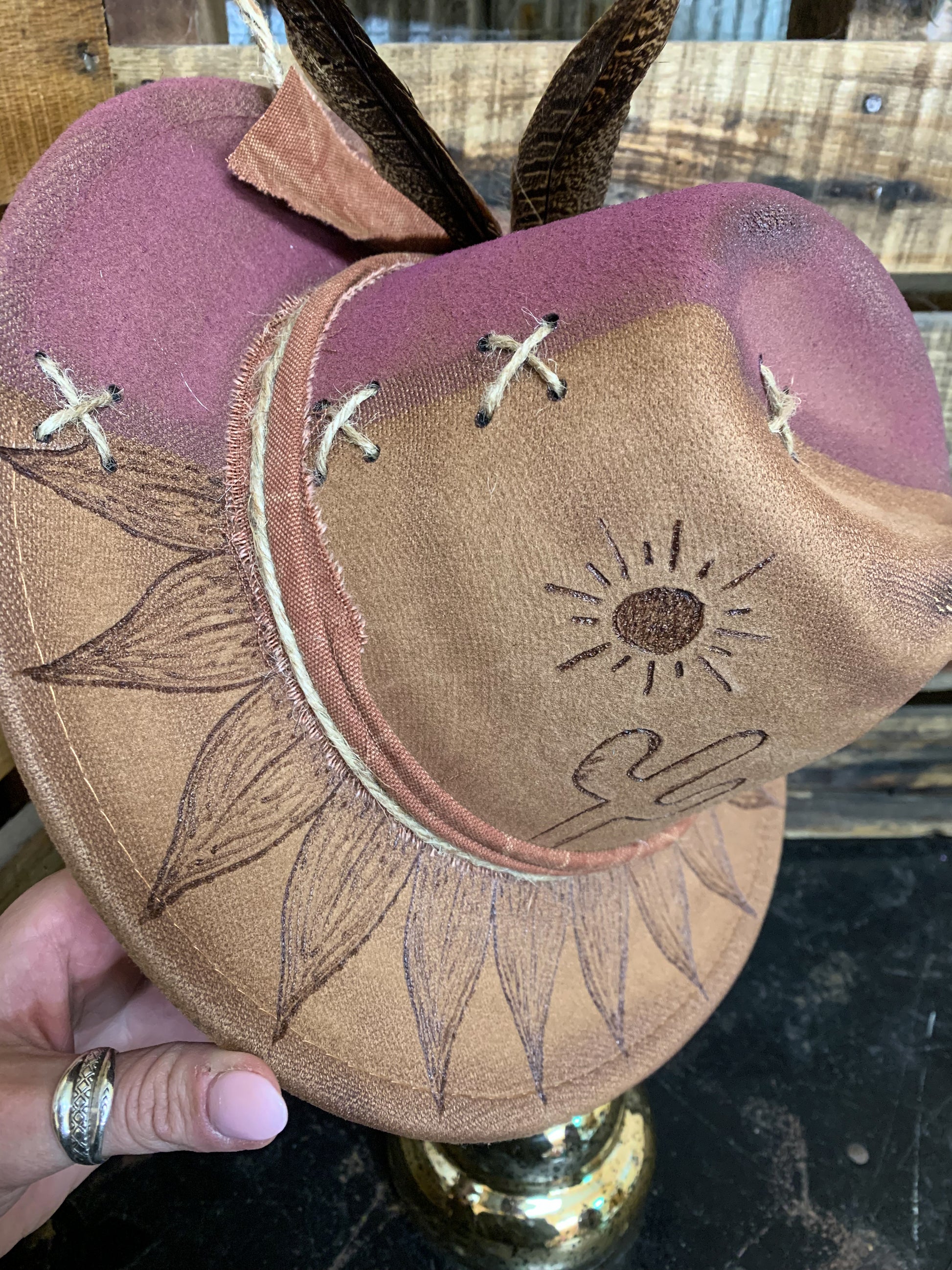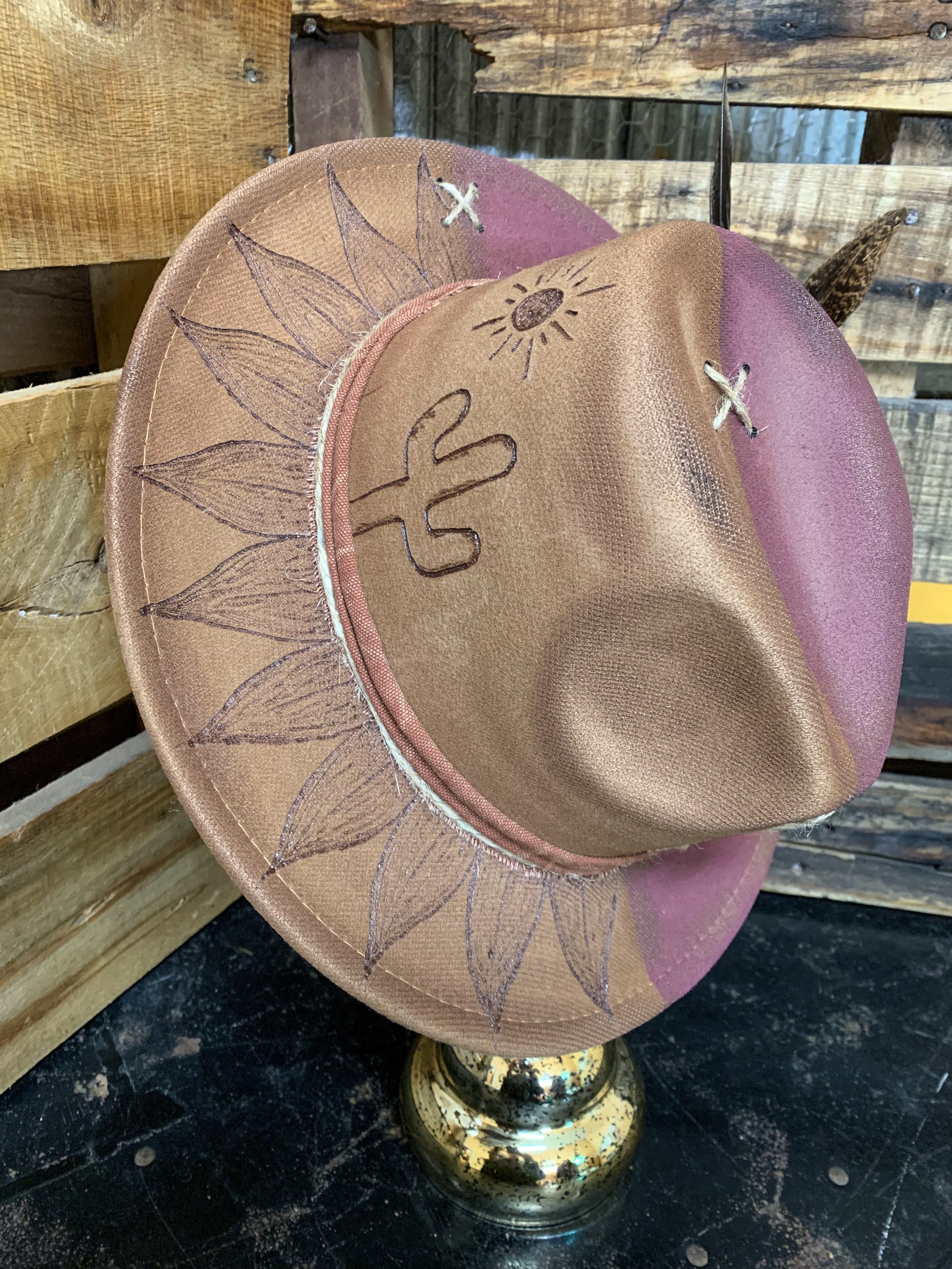 A beautiful half painted design with a cactus desert theme, and flower burned on one half of the brim. Fabric wrapped around and tied on the side with two feathers. X twine detail. Adjustable drawstrings inside to tighten if needed.