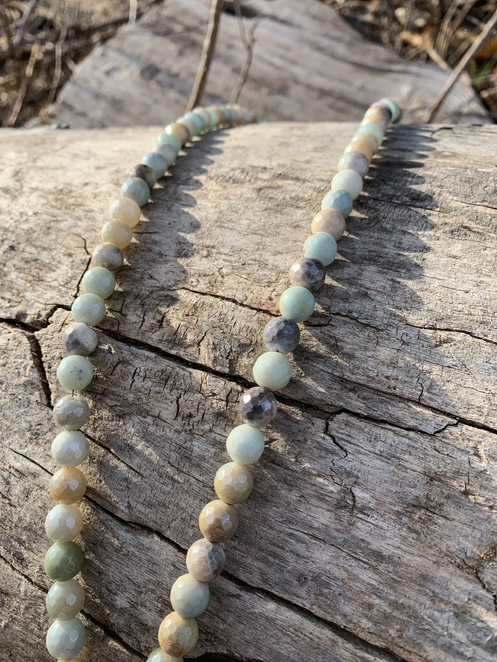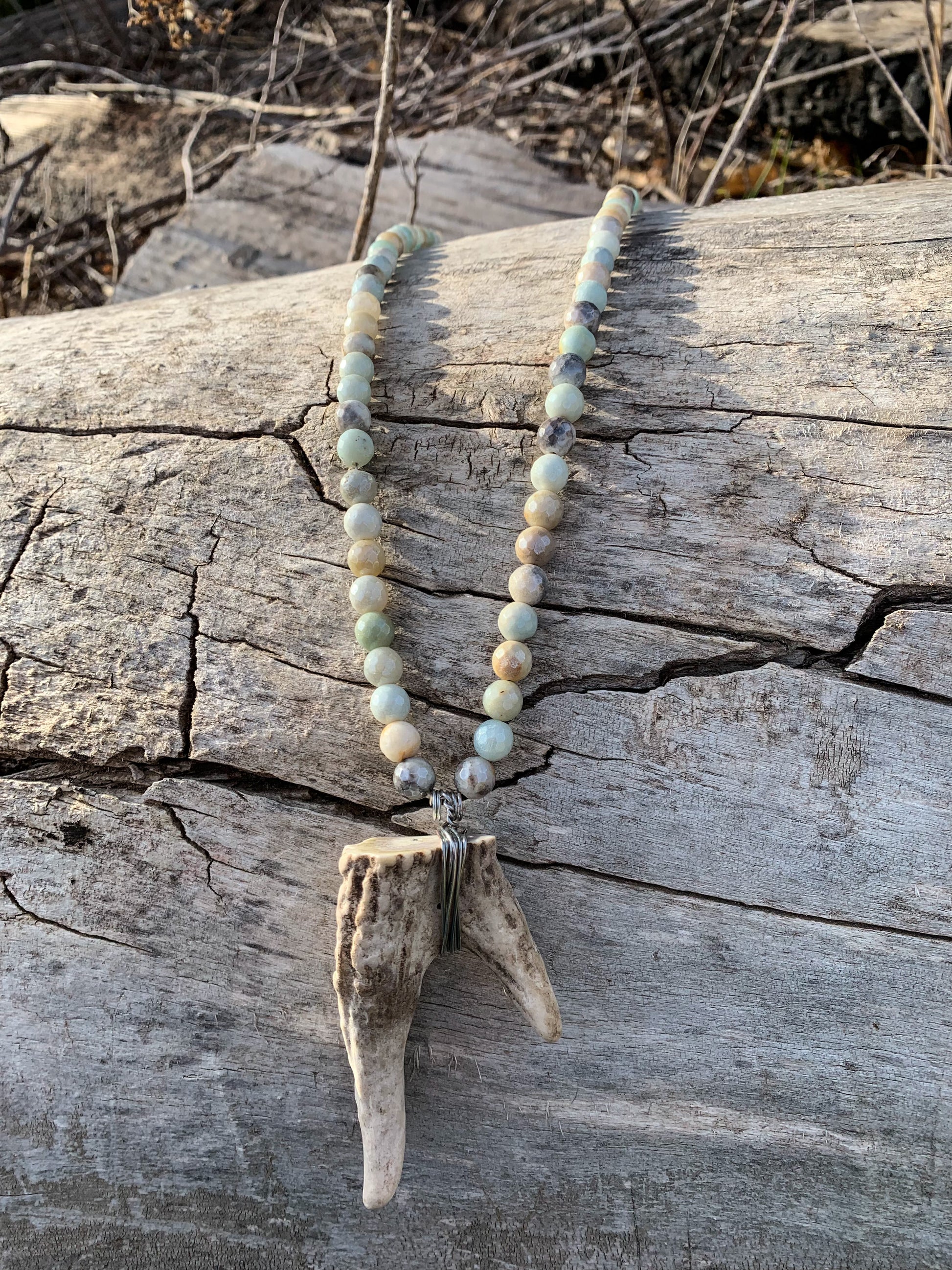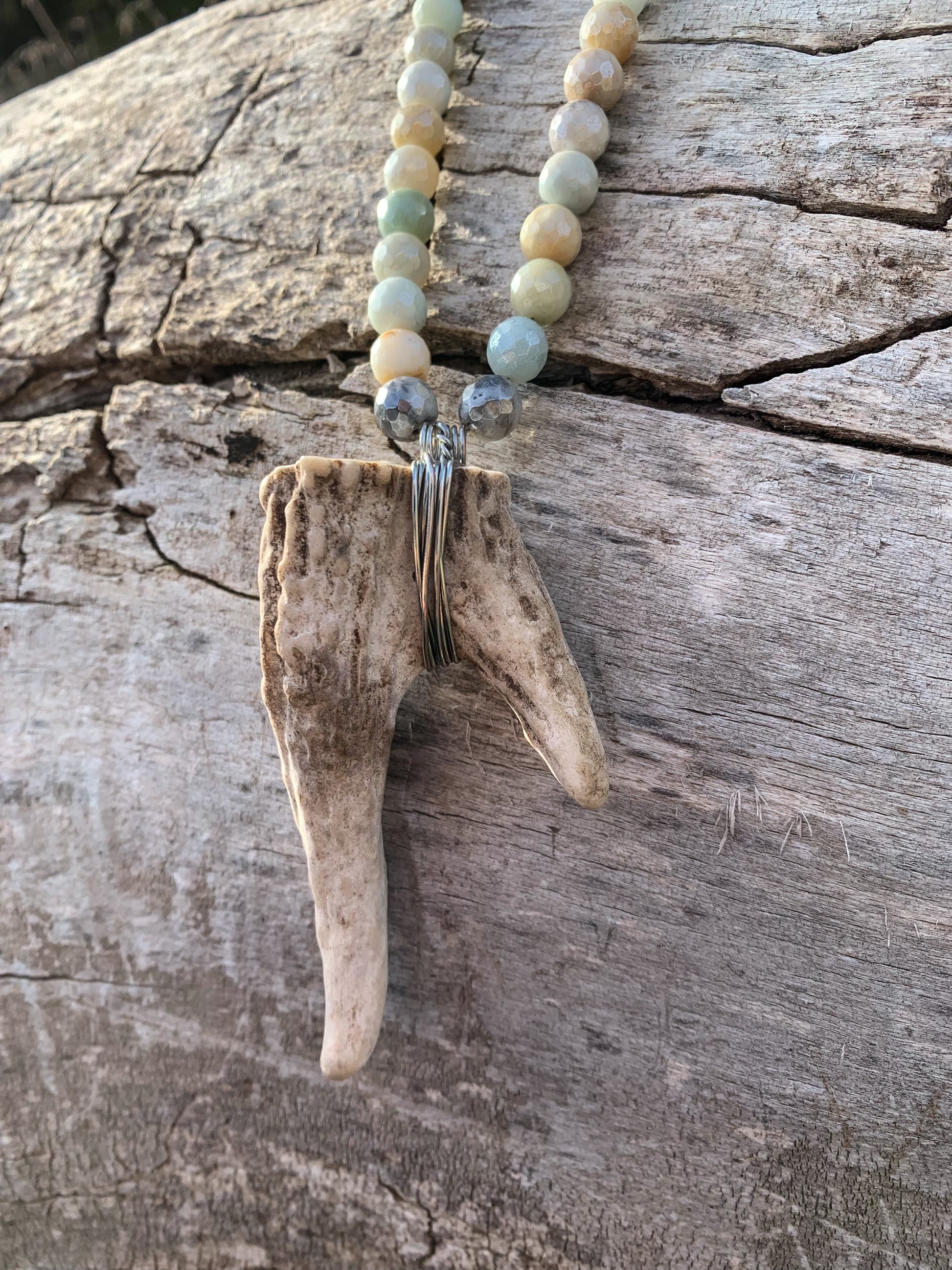 Pastel colored beads with unique silver wrapped brow tine antler piece. Handmade. One of a kind.