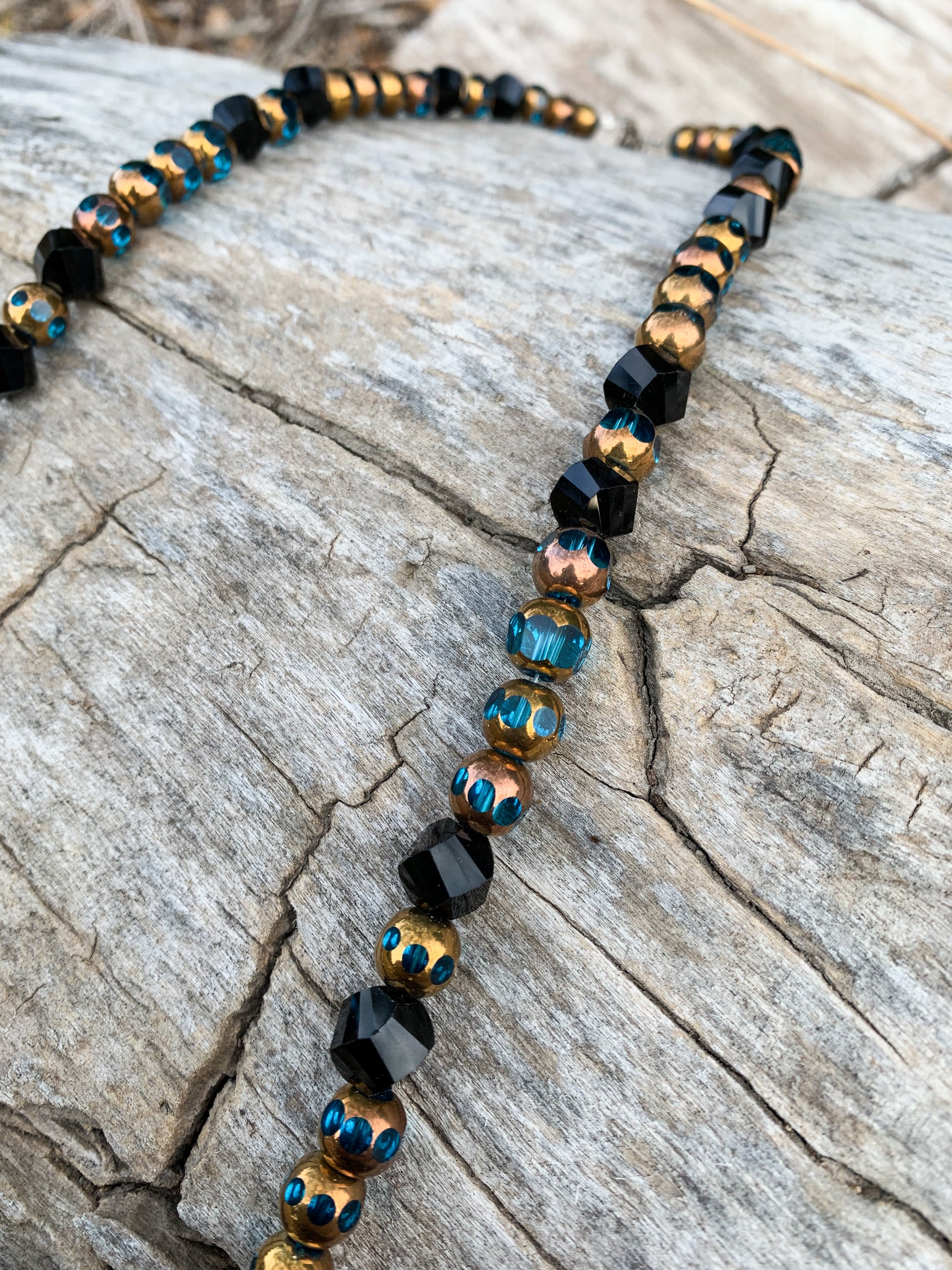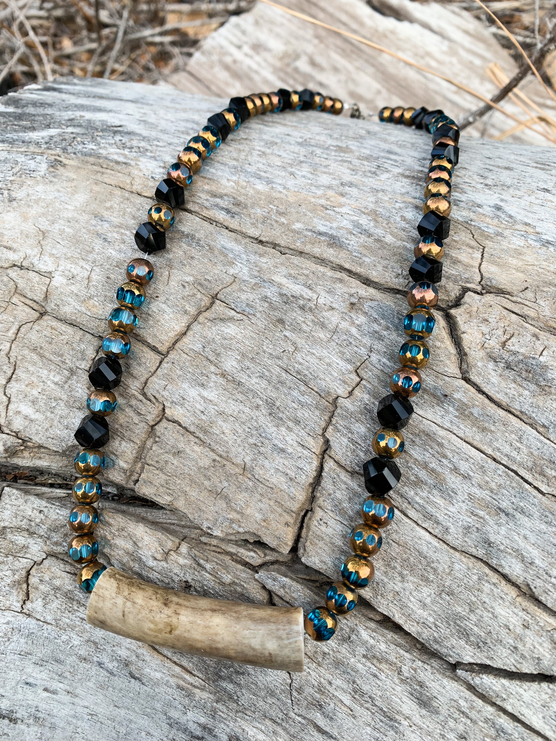 See through turquoise beads with gold capped design, and shiny black beads. Straight authentic antler beam piece. Handmade.