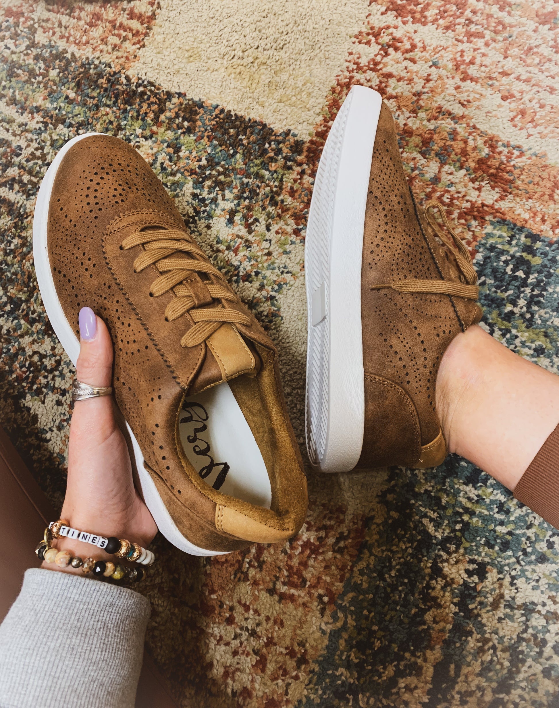 A beautiful cognac colored shoe with peephole design on side and laces to tie! True to size.