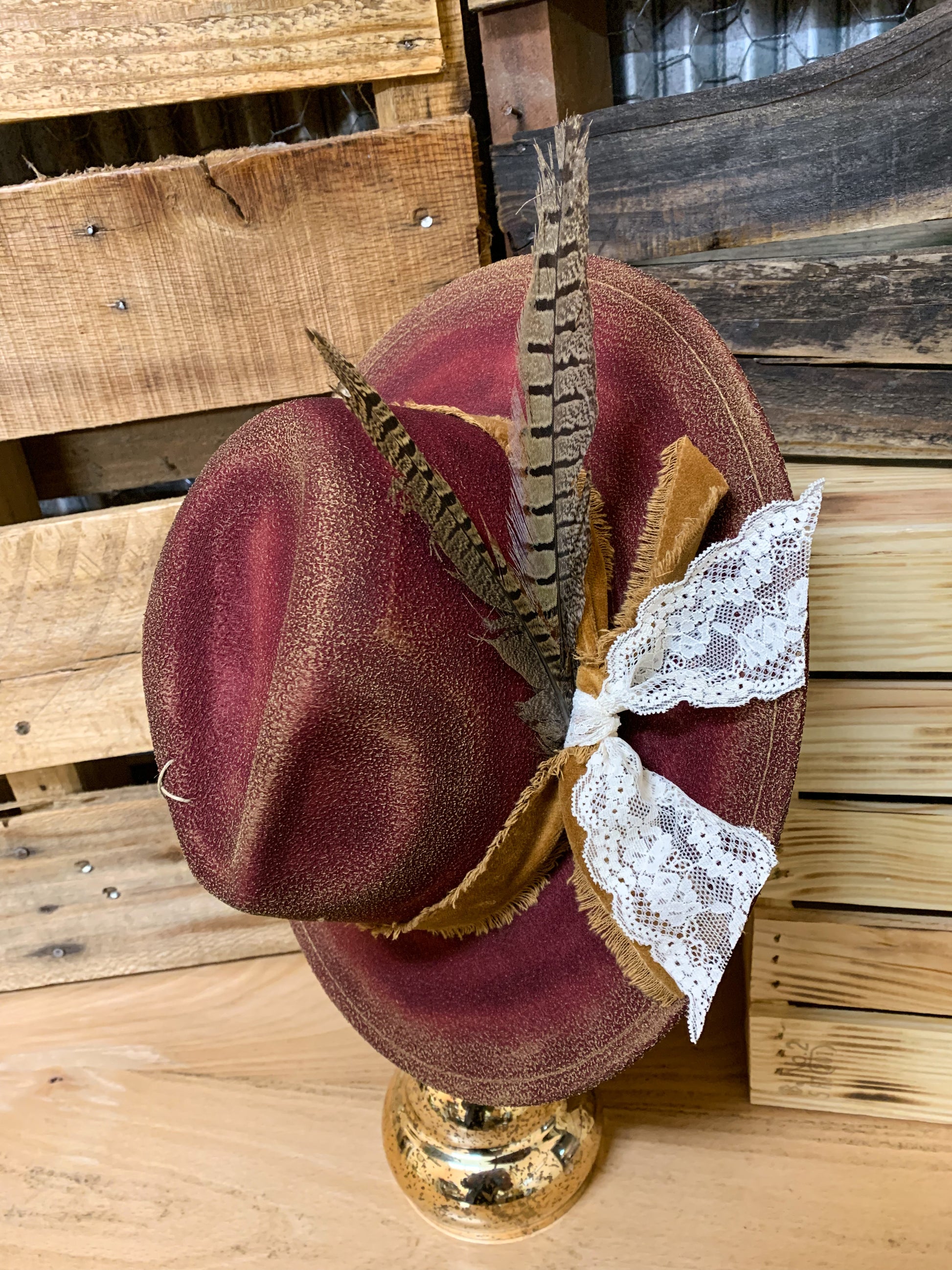 Burgundy short brimmed hat with gold accent distress and burn design. Rust colored suede band with lace and pheasant feathers. 4.75” height. 2.75” brim. 22” circumference. 100% polyester.