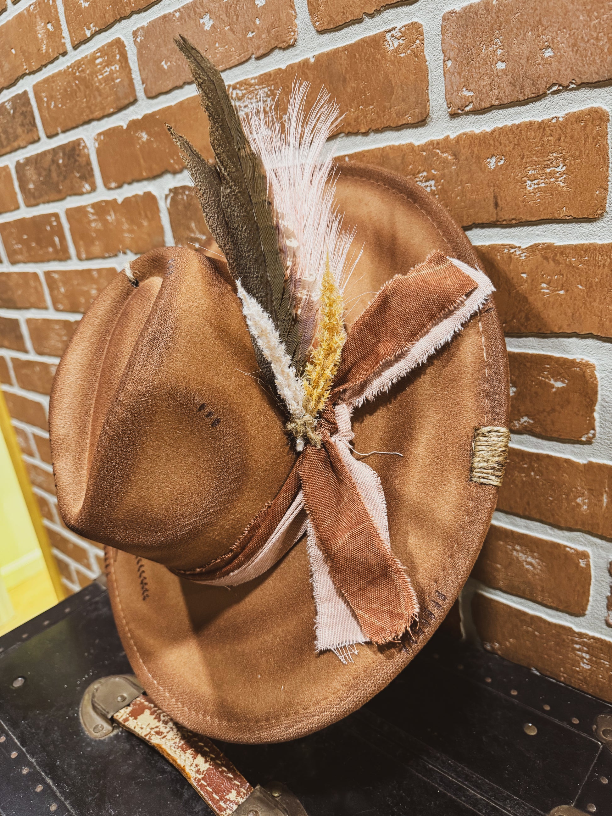 Tan wide brim faux felt hat, with floral burned design on brim. Fabrics wrapped around and tied on the side, with mixture of feathers. Adjustable drawstrings inside to tighten down if needed! 4.75” height, 3.5” brim, 22” circumference. 65% cotton, 35% polyester.