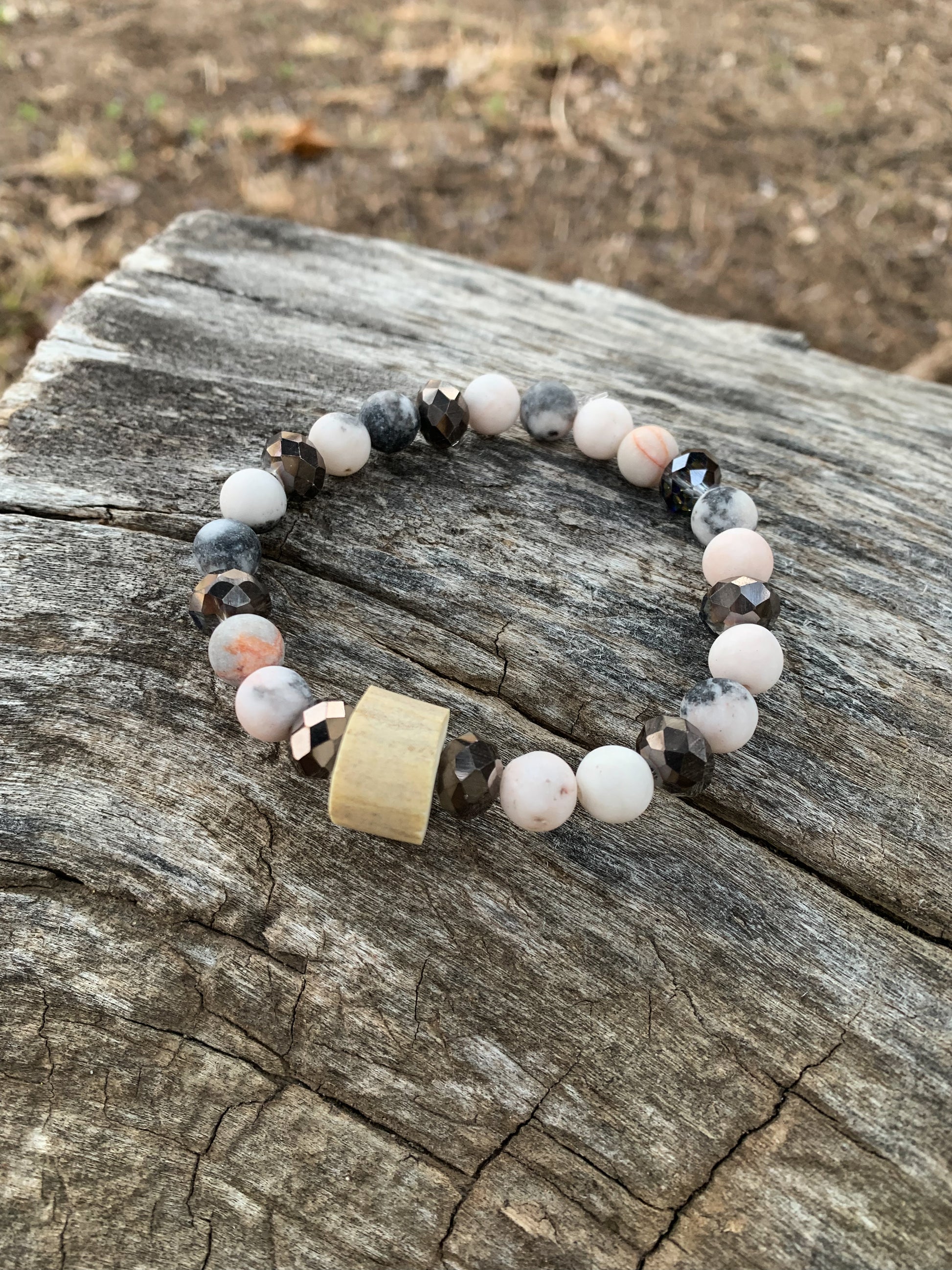 Fun pink and black beads with a foggy design and a small authentic whitetail antler piece in the center. Handmade.