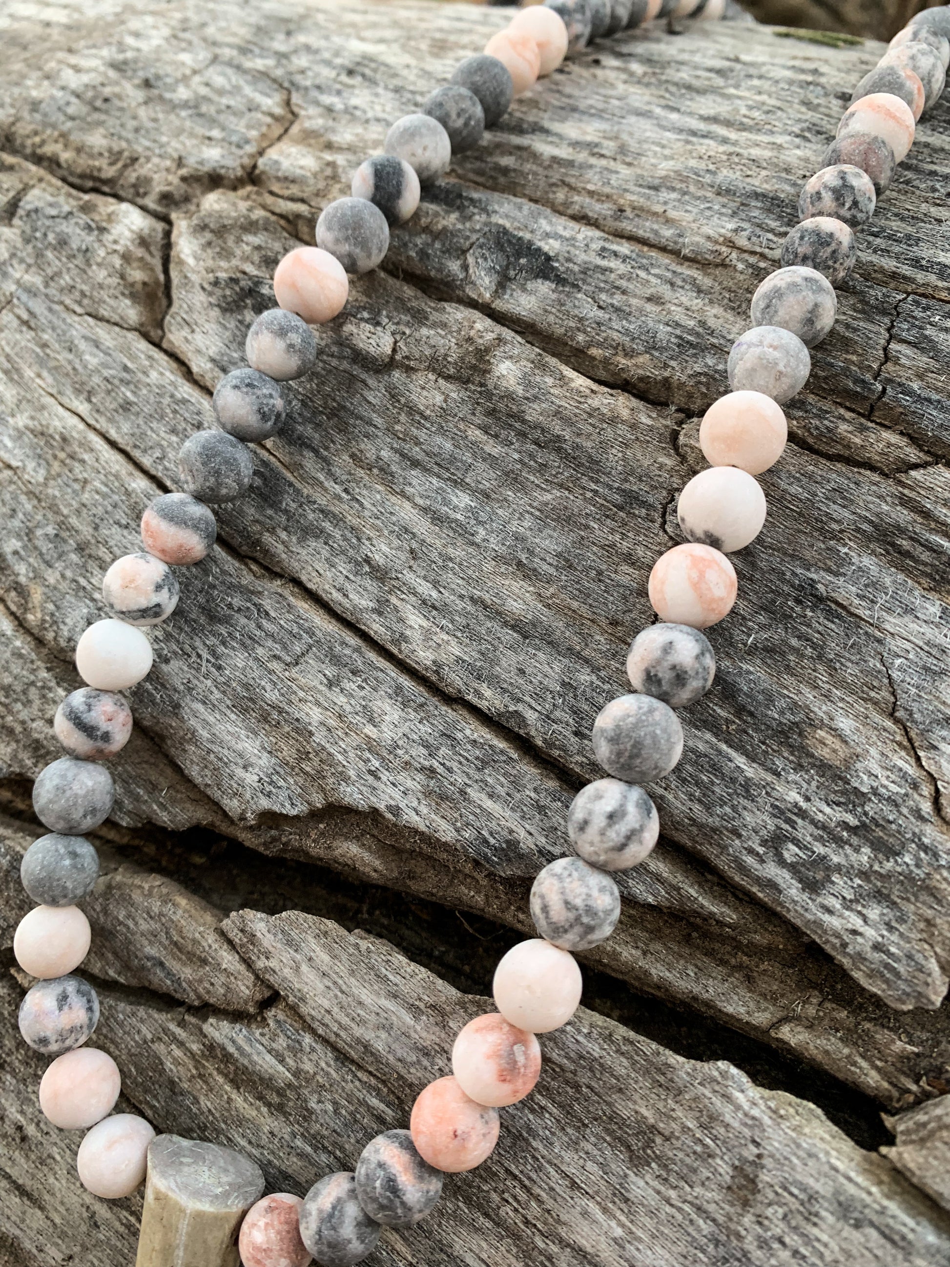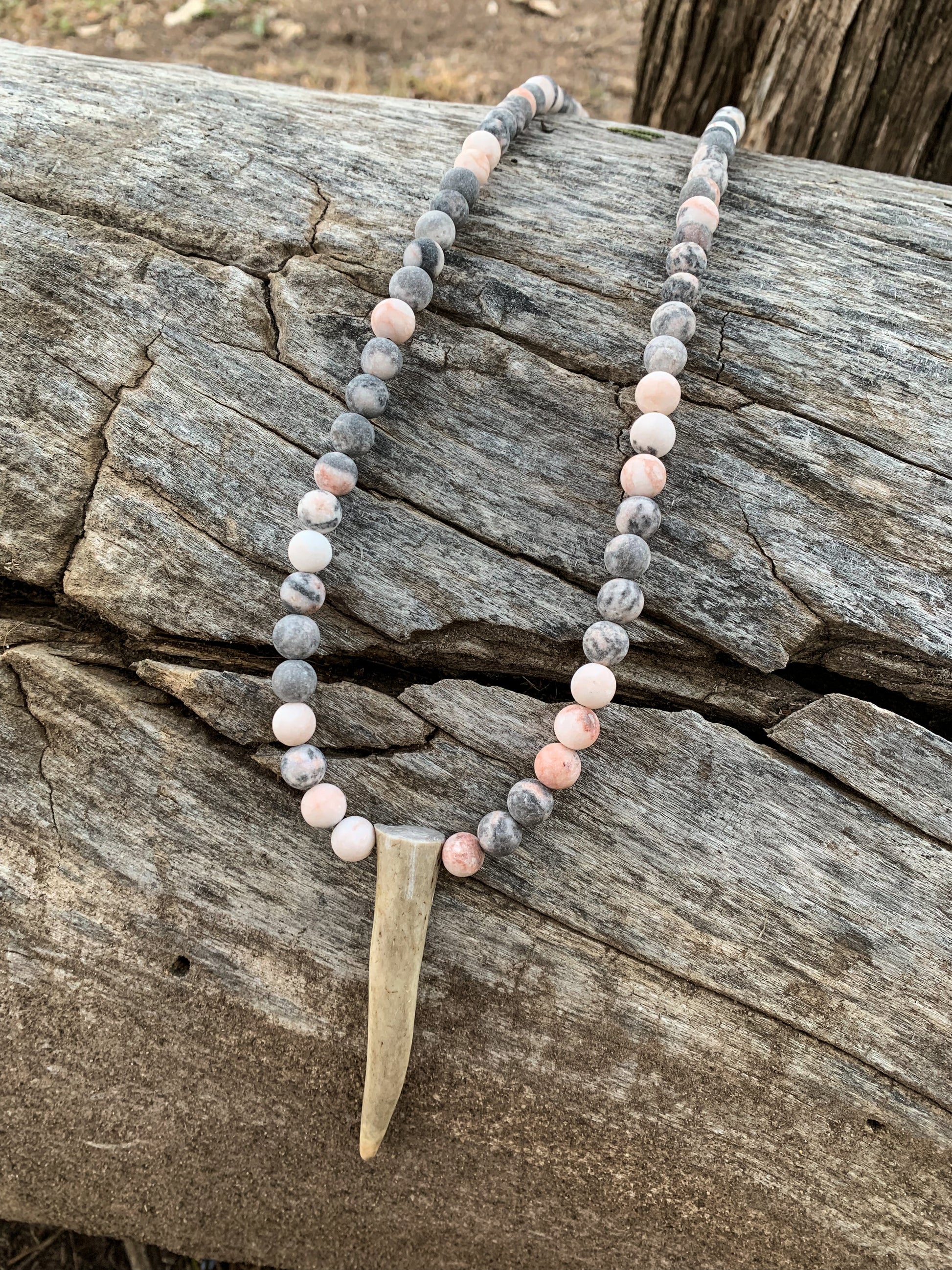 Beautiful pink and black beads with a foggy design and a small authentic whitetail antler piece in the middle. Handmade.