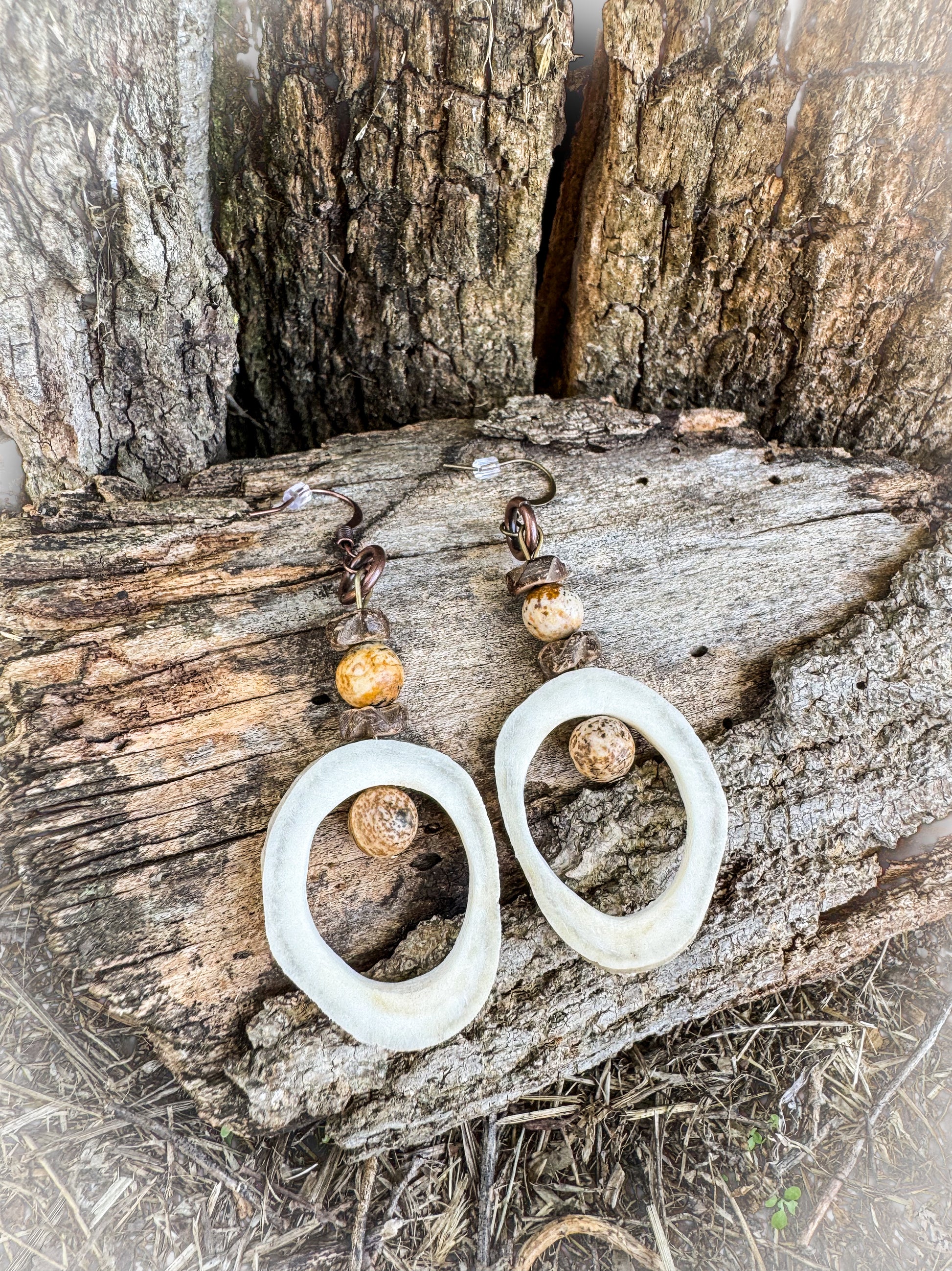 Upgrade your jewelry collection with our Free Spirit Antler Earrings. Made from wooden and rock beads, these earrings feature hollowed out anuthentic antler slabs for a unique and natural look. Expertly crafted, these earrings are perfect for adding a touch of nature to any outfit. Handmade. One of a kind.