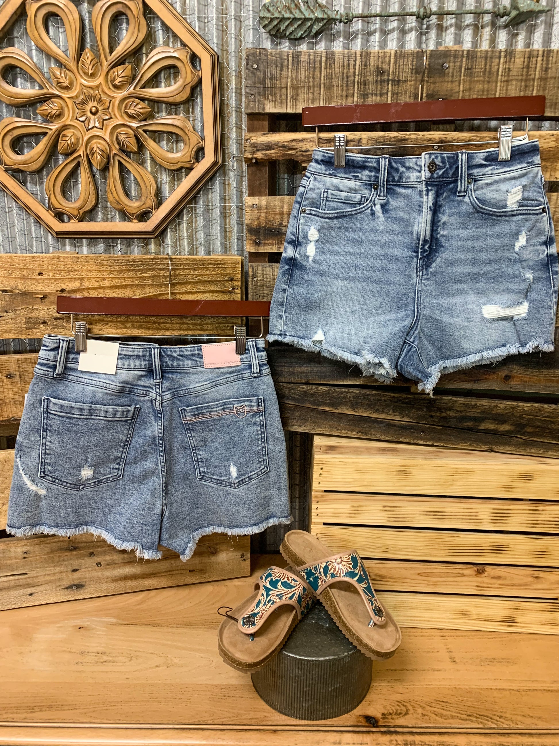 Extreme stretch and comfort with light wash loom and frayed hem design. Small distress details.
