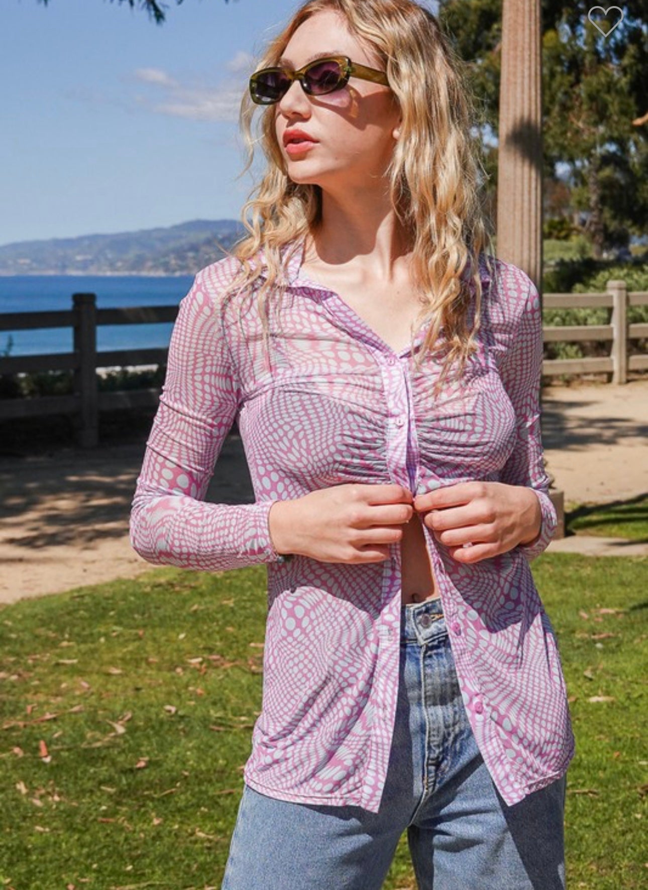 This Girls Day Top features a retro print with an adorned mesh top for a stylish and unique look. The button down style adds a touch of sophistication to any outfit. The perfect addition to any fashion-forward girl's wardrobe.