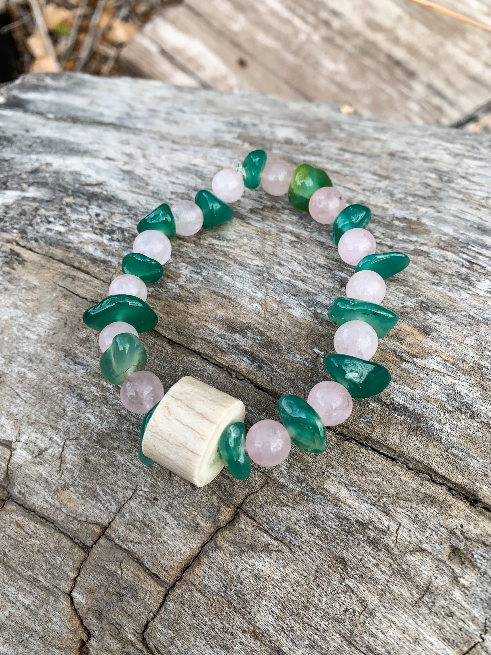 Pink and turquoise glass colored beads with a small authentic antler piece. Handmade.