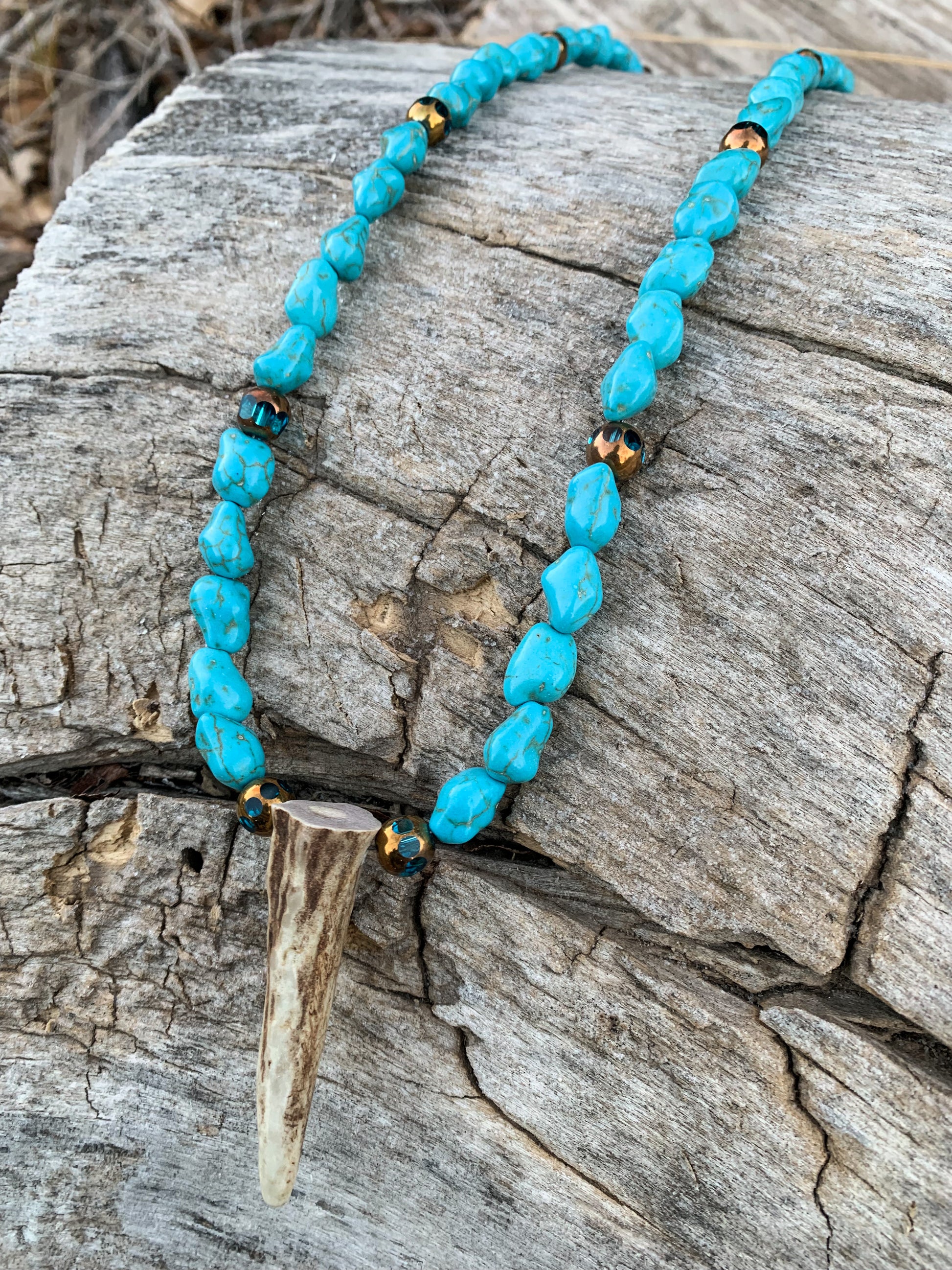 A small authentic antler piece with faux turquoise beads and a glass accent bead. Handmade.