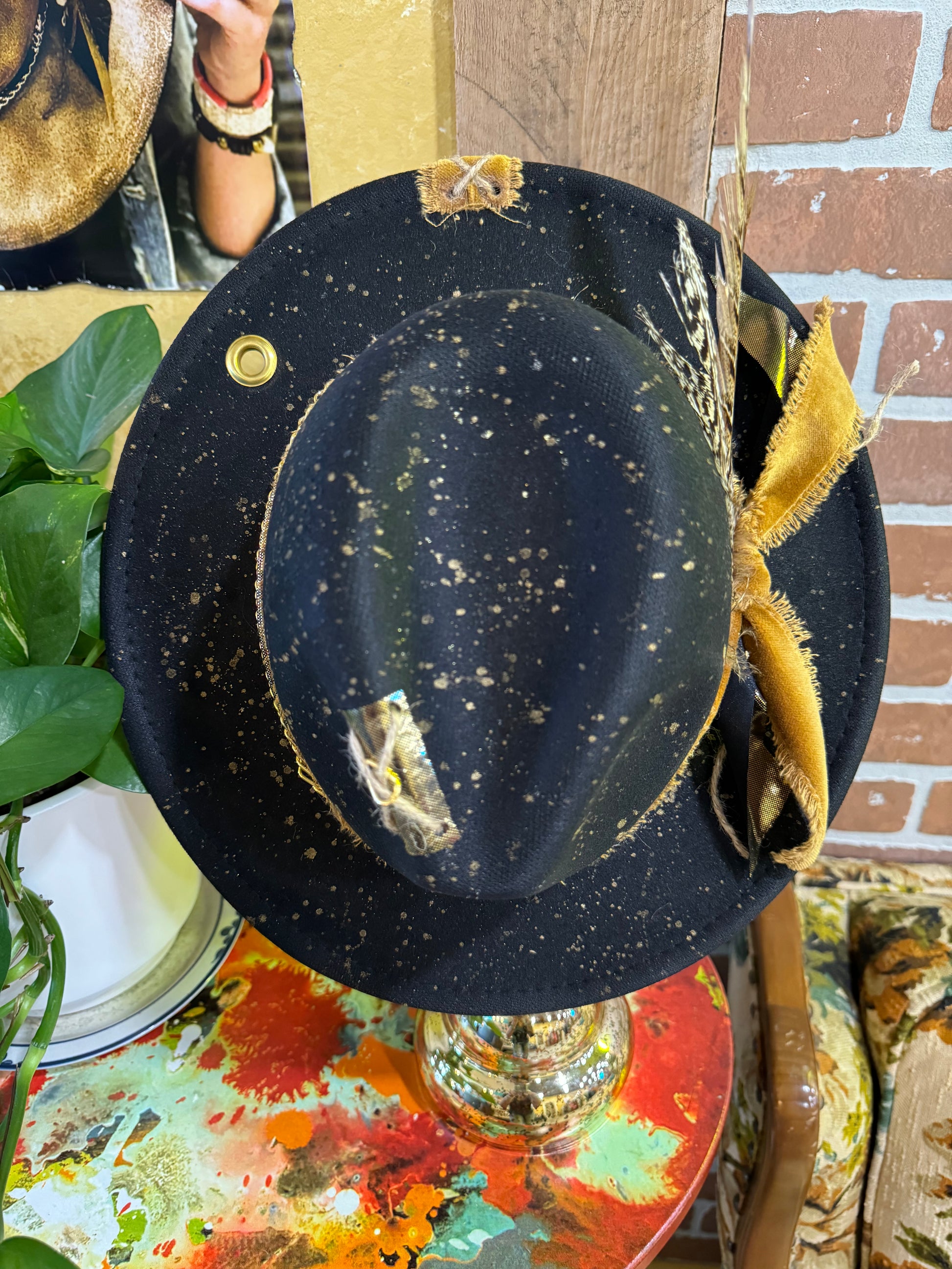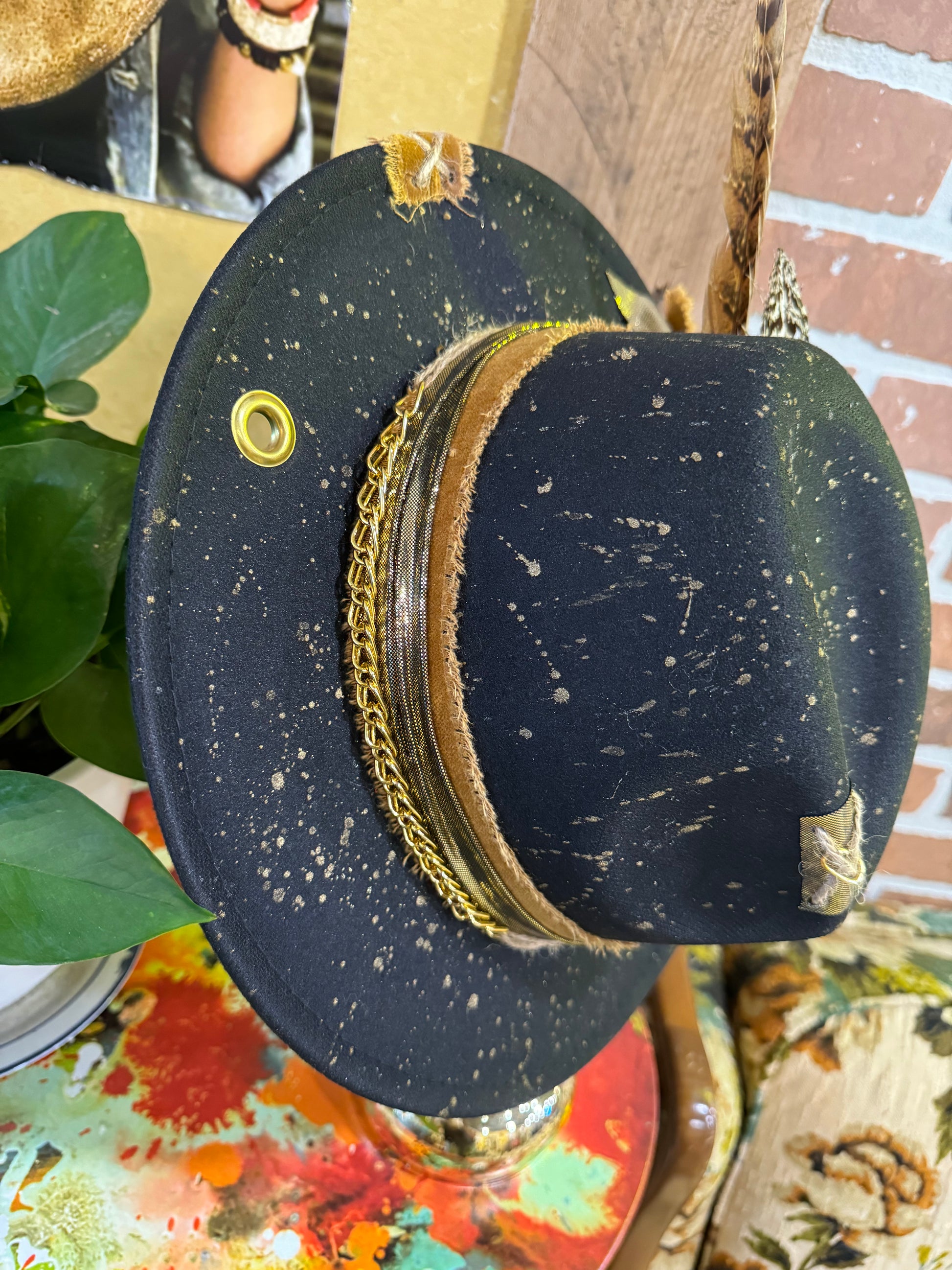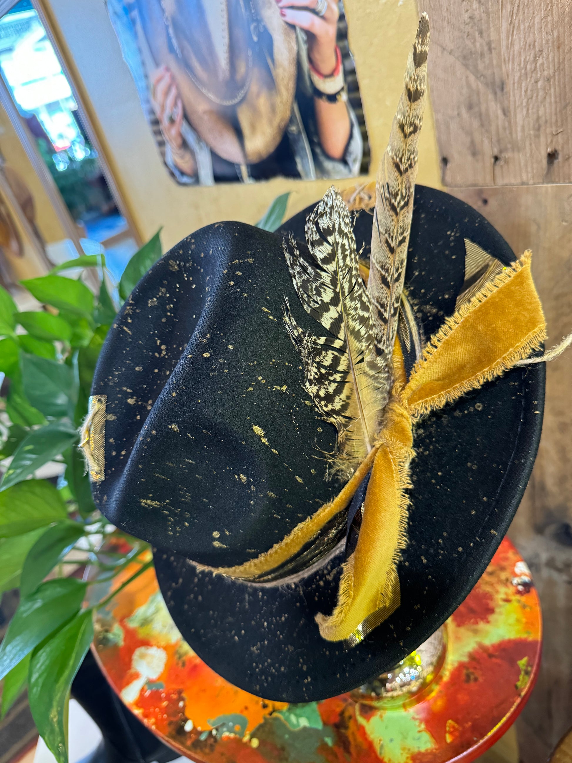 Faux felt black short brim hat, with gold accent fabrics, chain, and feathers on the side. Adjustable drawstrings inside to tighten if needed. 4.75” height. 2.75” brim. 22” circumference. 65% cotton, 35% polyester.