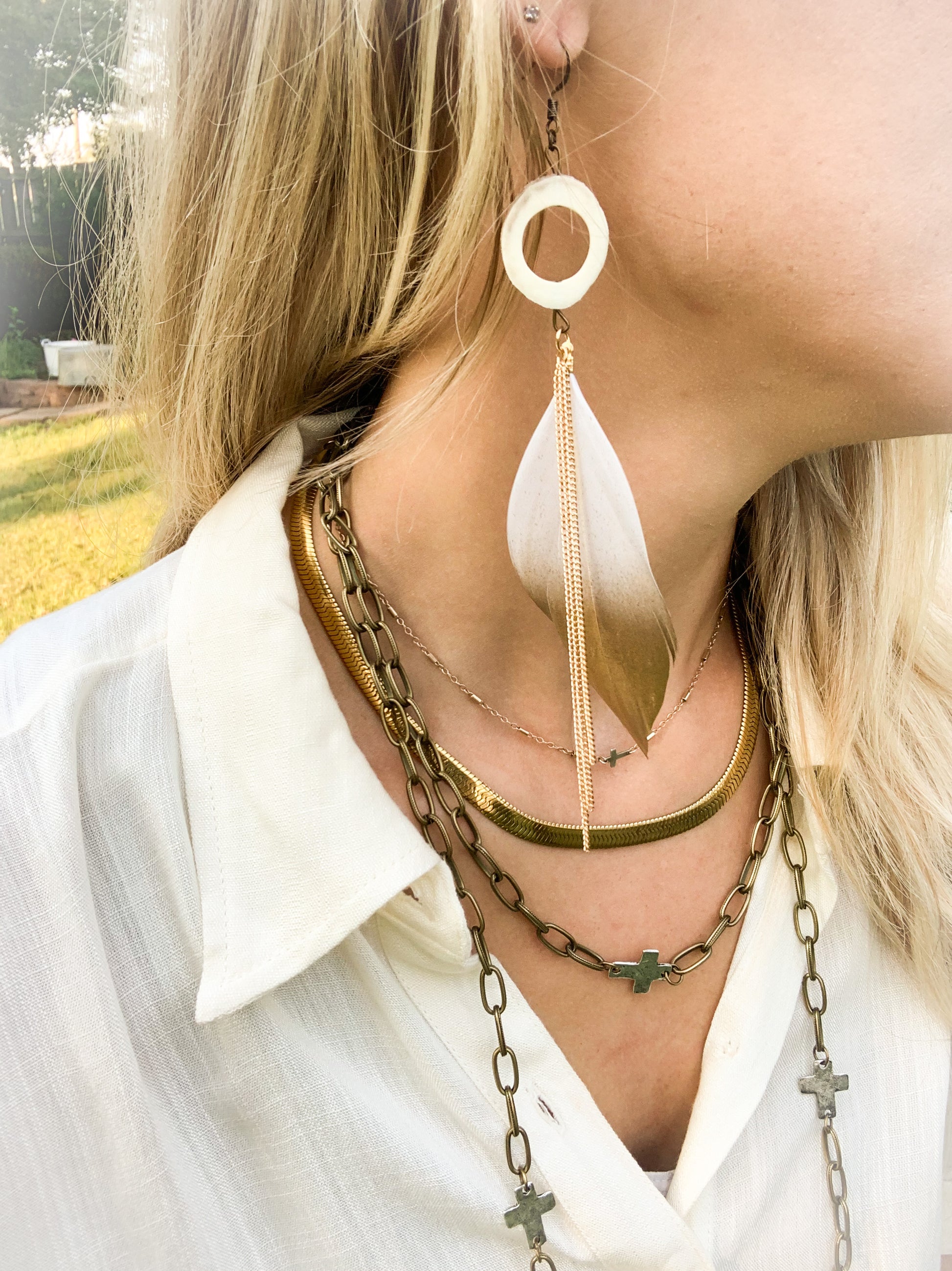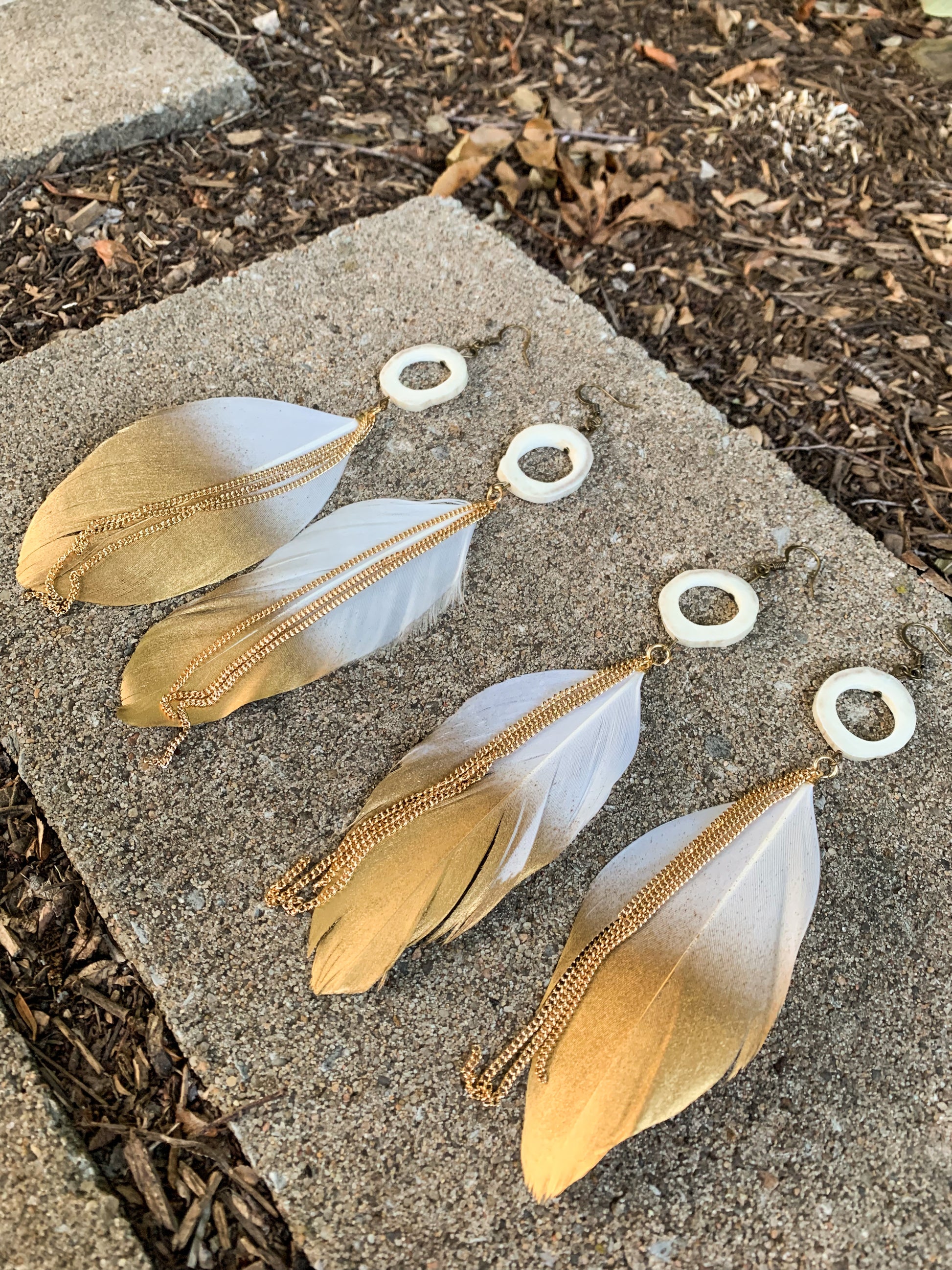 White feathers dipped in gold paint with golden chains down the middle and a small hollowed out antler piece. Handmade.