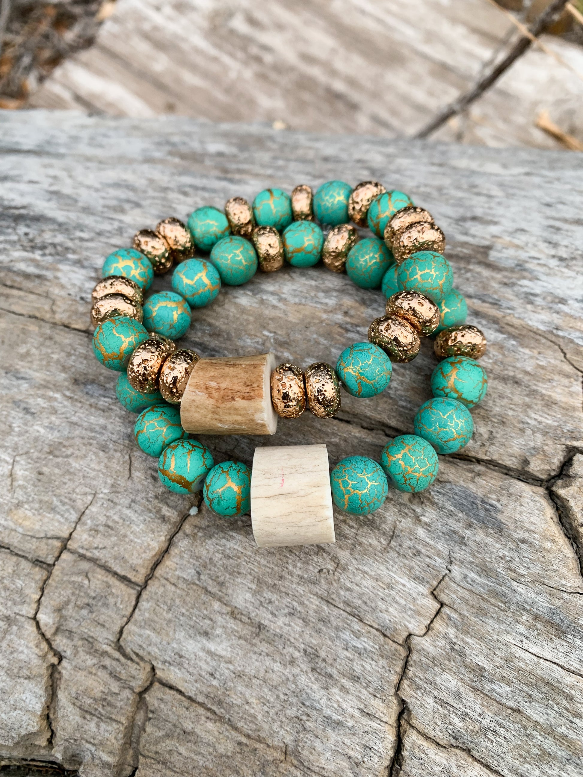 Your favorite turquoise beads with golden crack design and gold metal beads and small antler piece.